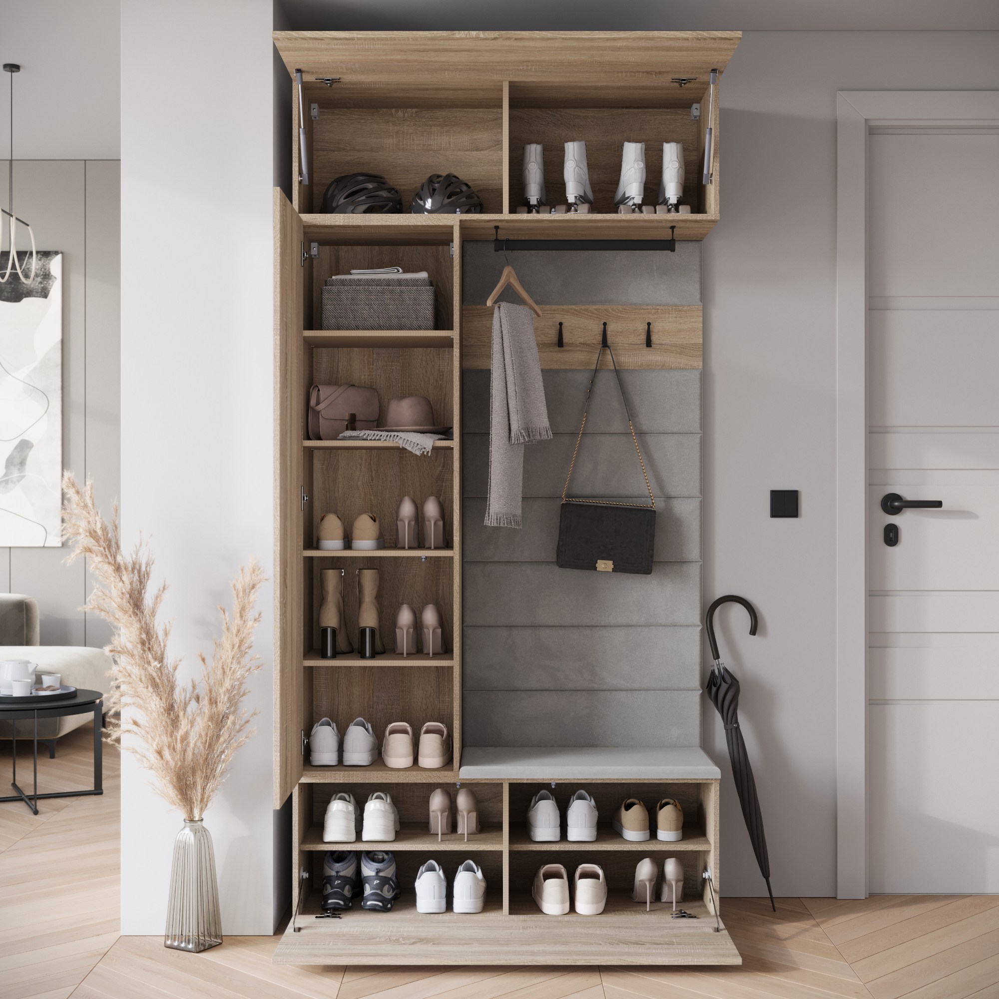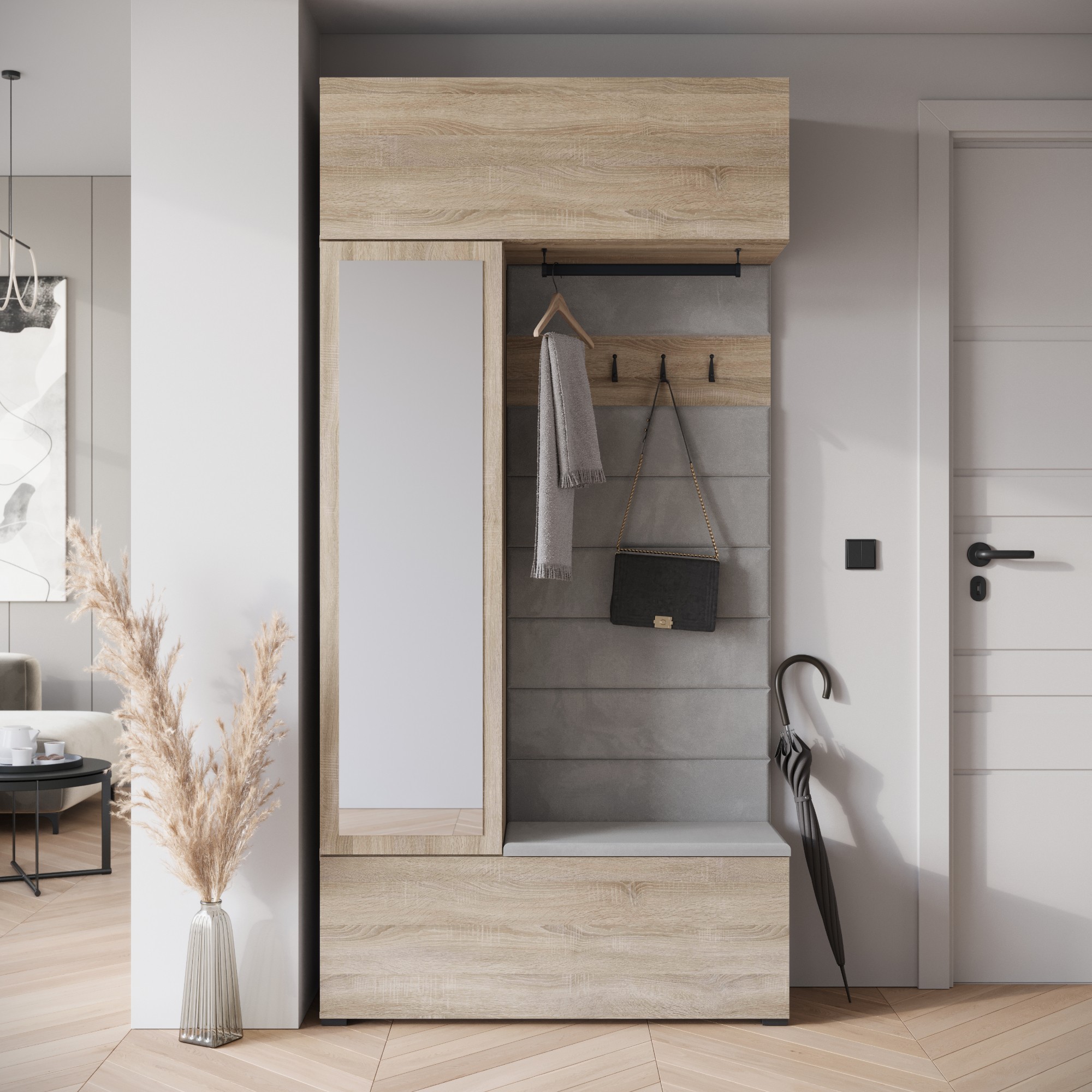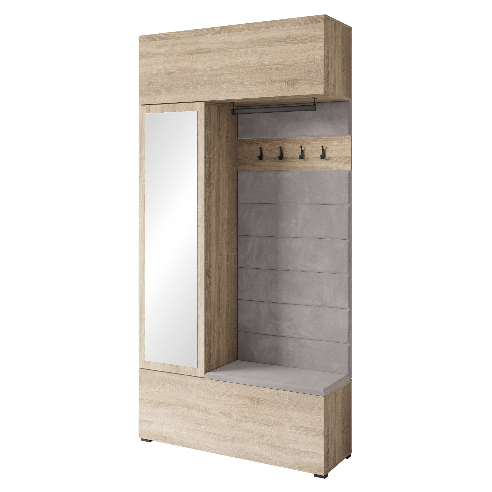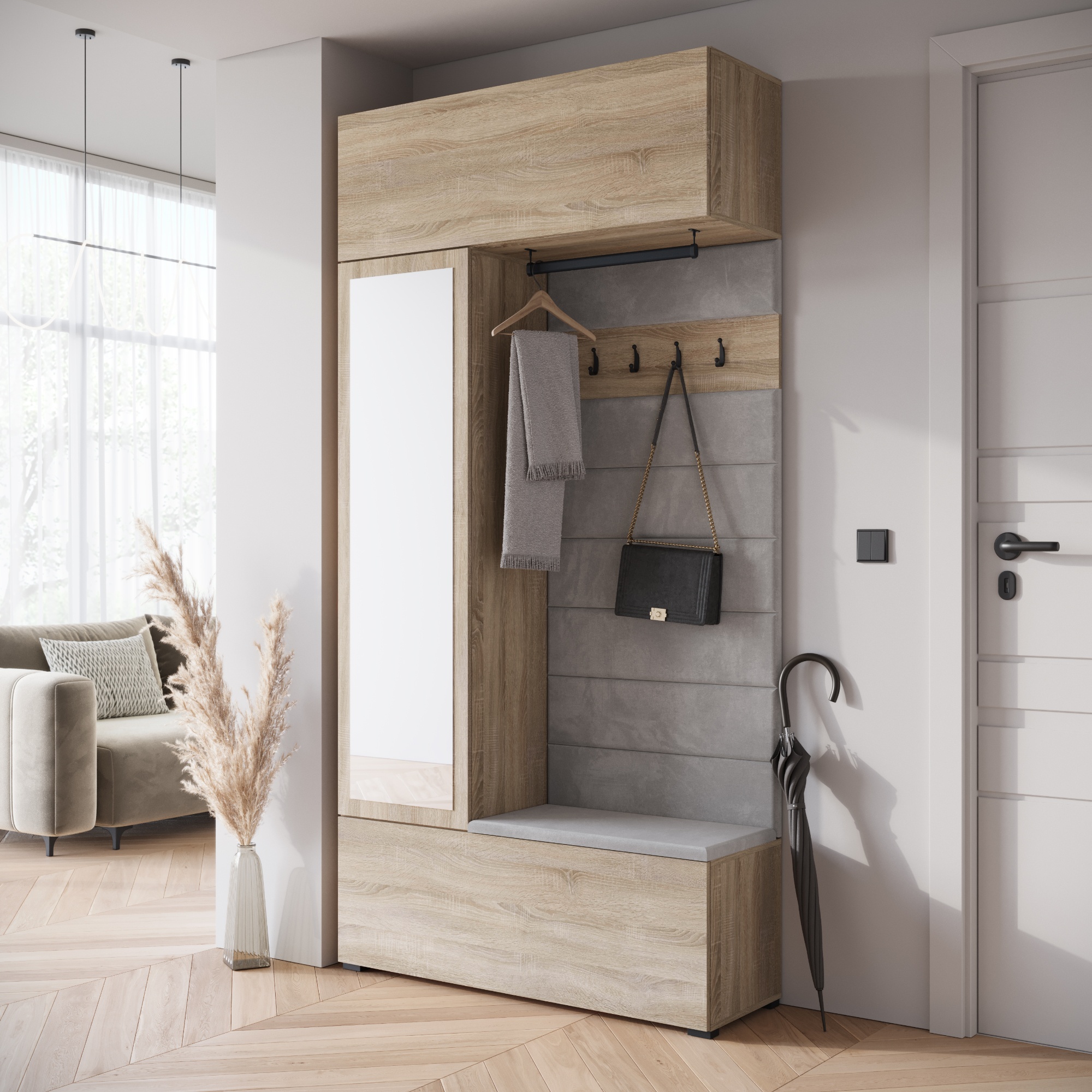 Táto predsieňová stena ponúka dostatok úložného priestoru na 28 párov topánok a jej nosnosť je 65 kg. Stena je vybavená nielen 6 nastaviteľnými policami umiestnenými za dvierkami, ale aj 1 šatníkovou tyčou a 4 háčikmi, na ktoré si môžete zavesiť práve nosené oblečenie, kabelky aj rôzne módne doplnky. Nechýba ani zrkadlo, ktoré vám umožní vždy pred odchodom z domu skontrolovať váš vzhľad. Pretože skrinku so zrkadlovými dverami je možné namontovať na pravú aj ľavú stranu, môžete stenu dokonale prispôsobiť vašim potrebám.