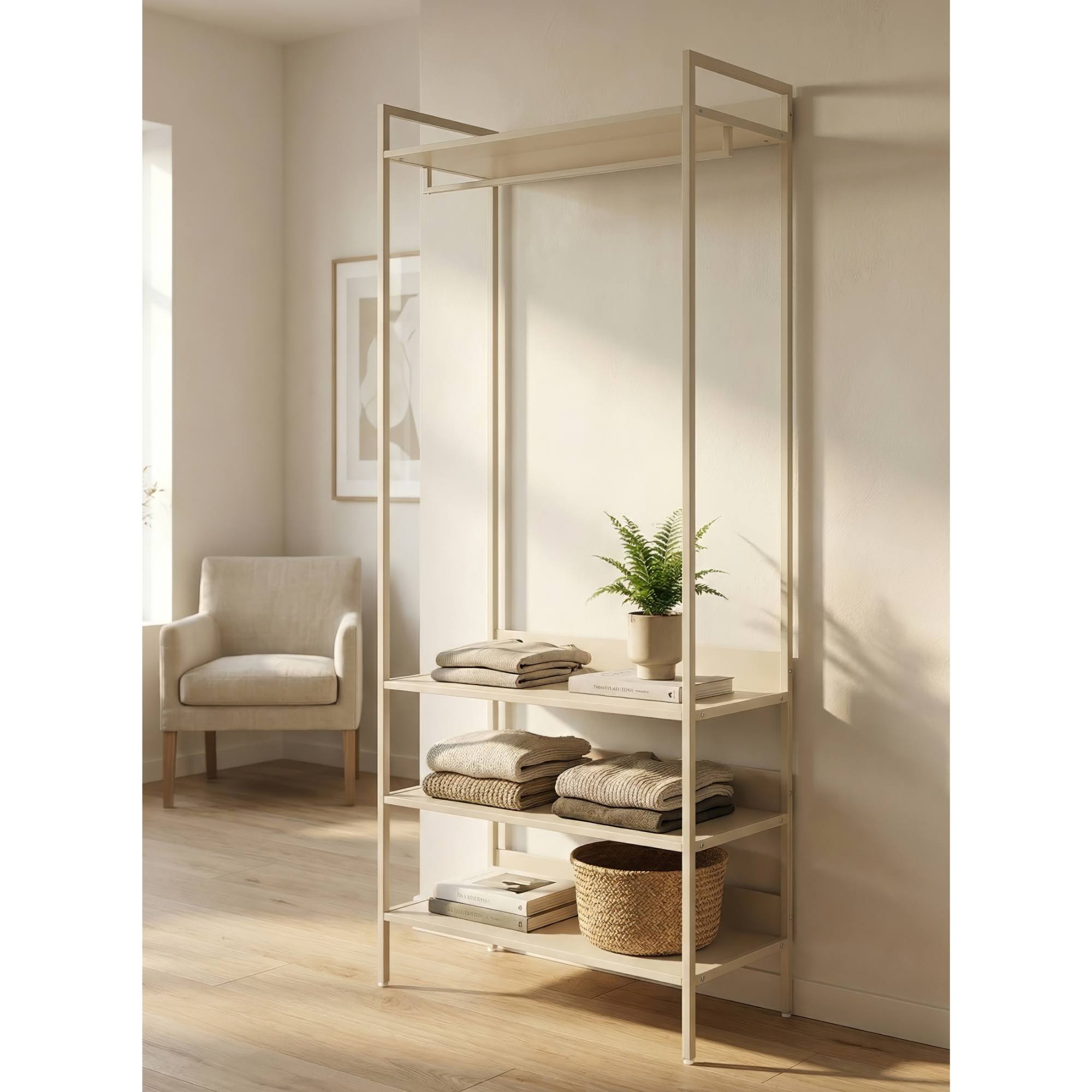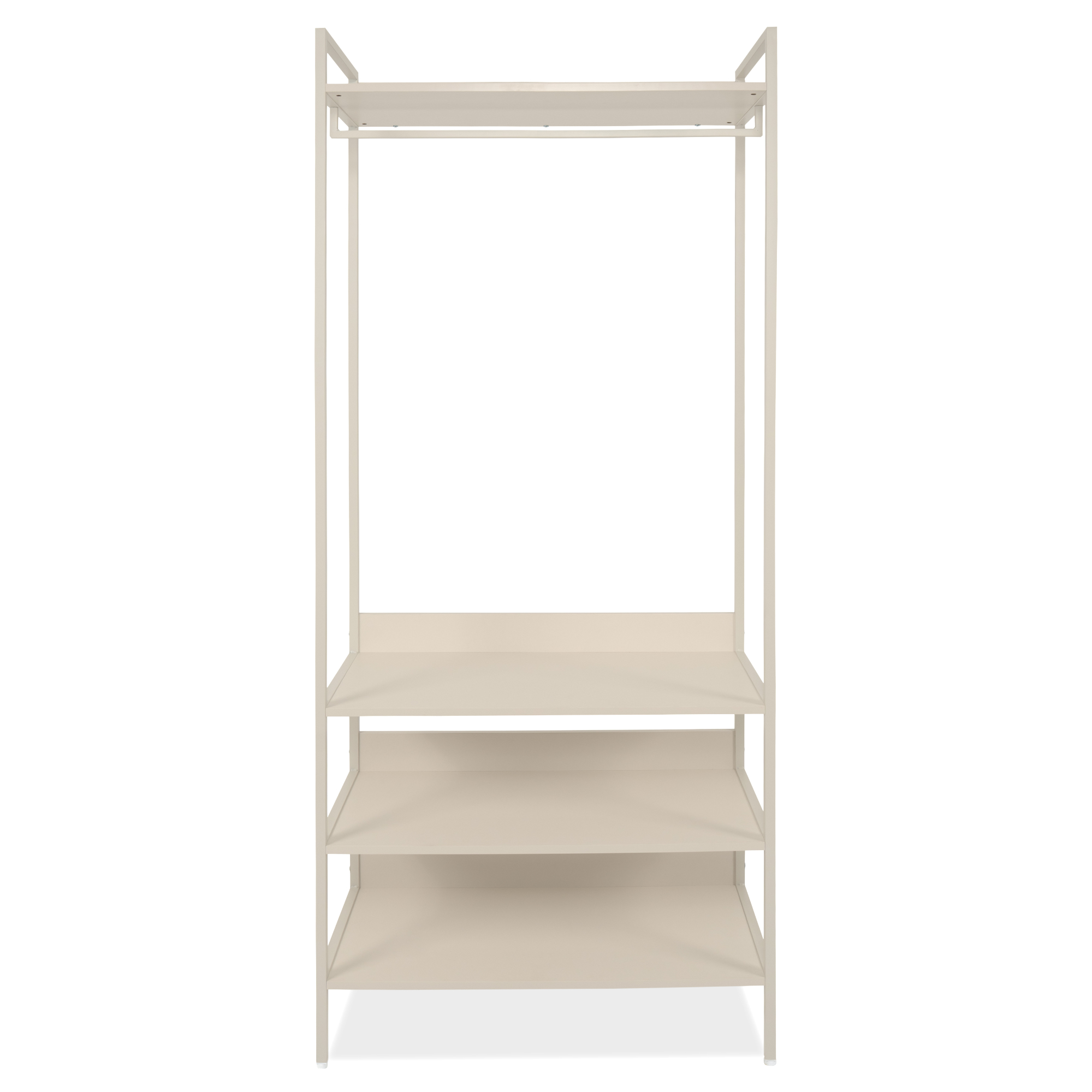 Pevná a stabilná konštrukcia steny a šatníková tyč sú z kovu. Na výrobu políc bola využitá ľahko udržiavateľná laminovaná drevotriesková doska.
