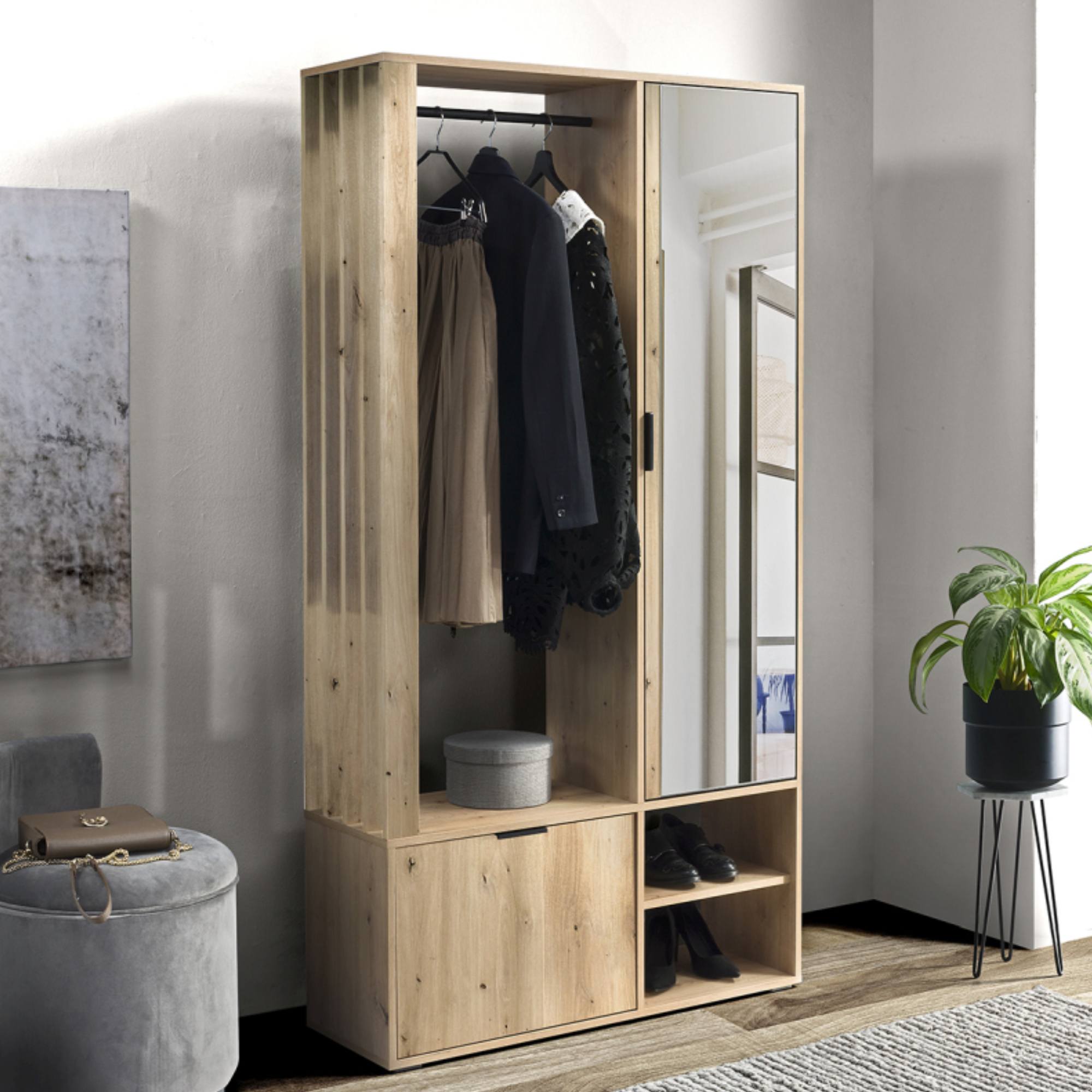 Súčasťou steny sú 4 vložené police umiestnené za dverami, na ktorých vonkajšej strane sa nachádza zrkadlo, v ktorom si vždy pred odchodom z domova môžete skontrolovať váš vzhľad. Za výklopnými dvierkami sa nachádza miesto na odloženie topánok. Pokiaľ ide o otvorený úložný priestor, ten ponúkne nielen ďalšiu vloženú policu, ale aj šatníkovú tyč.