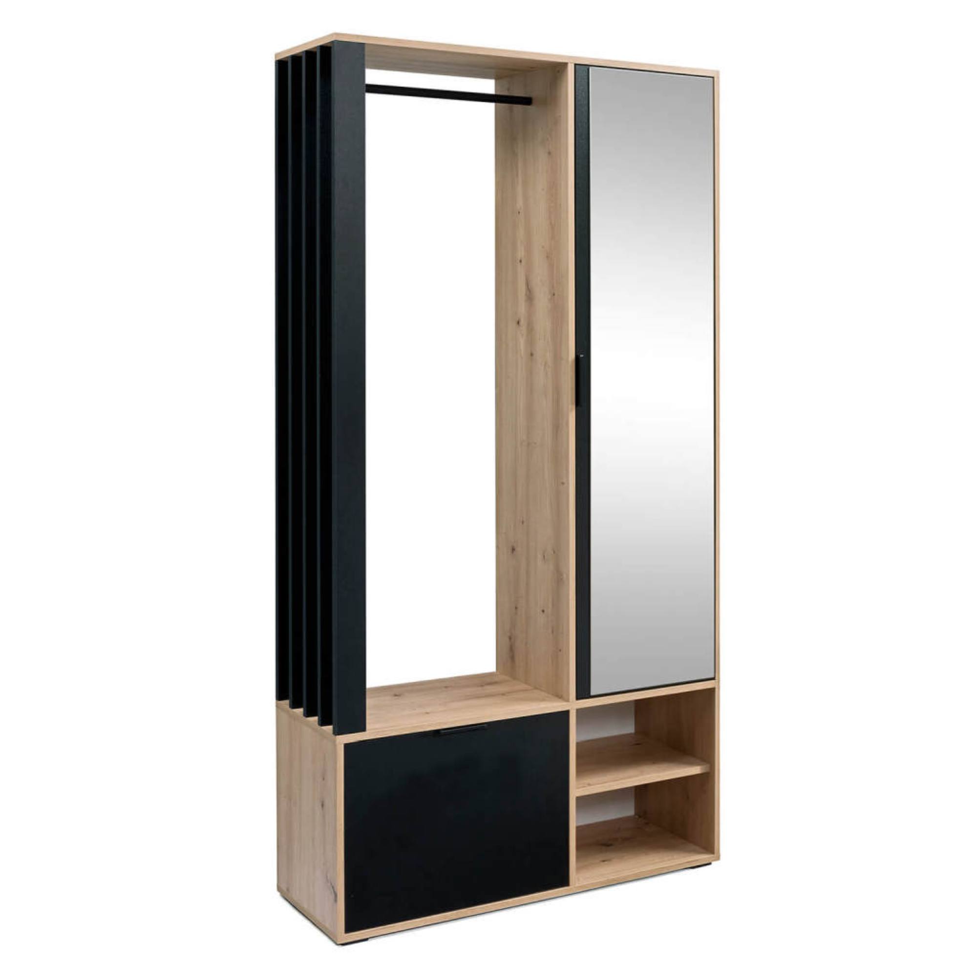 Súčasťou steny sú 4 vložené police umiestnené za dverami, na ktorých vonkajšej strane sa nachádza zrkadlo, v ktorom si vždy pred odchodom z domova môžete skontrolovať váš vzhľad. Za výklopnými dvierkami sa nachádza miesto na odloženie topánok. Pokiaľ ide o otvorený úložný priestor, ten ponúkne nielen ďalšiu vloženú policu, ale aj šatníkovú tyč.