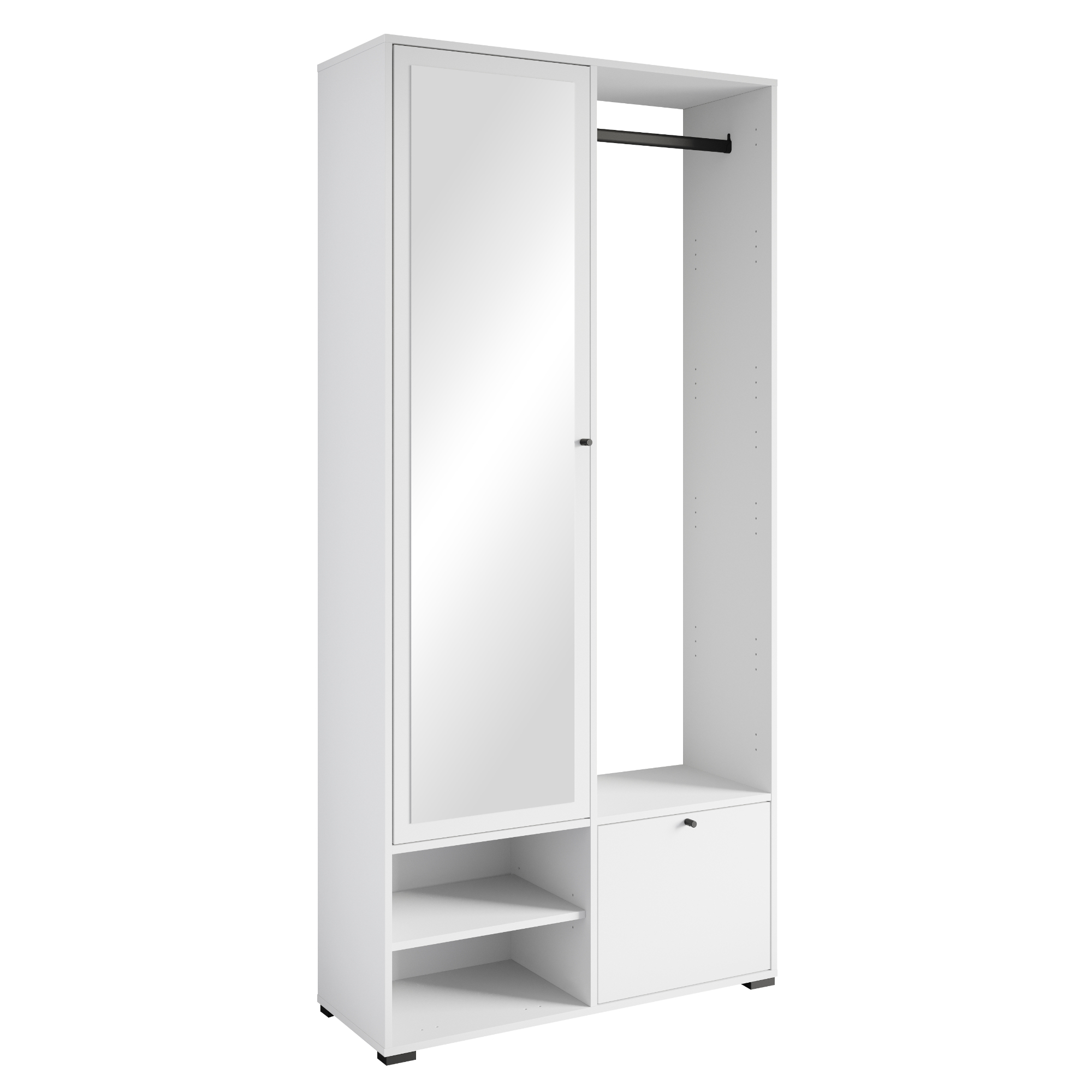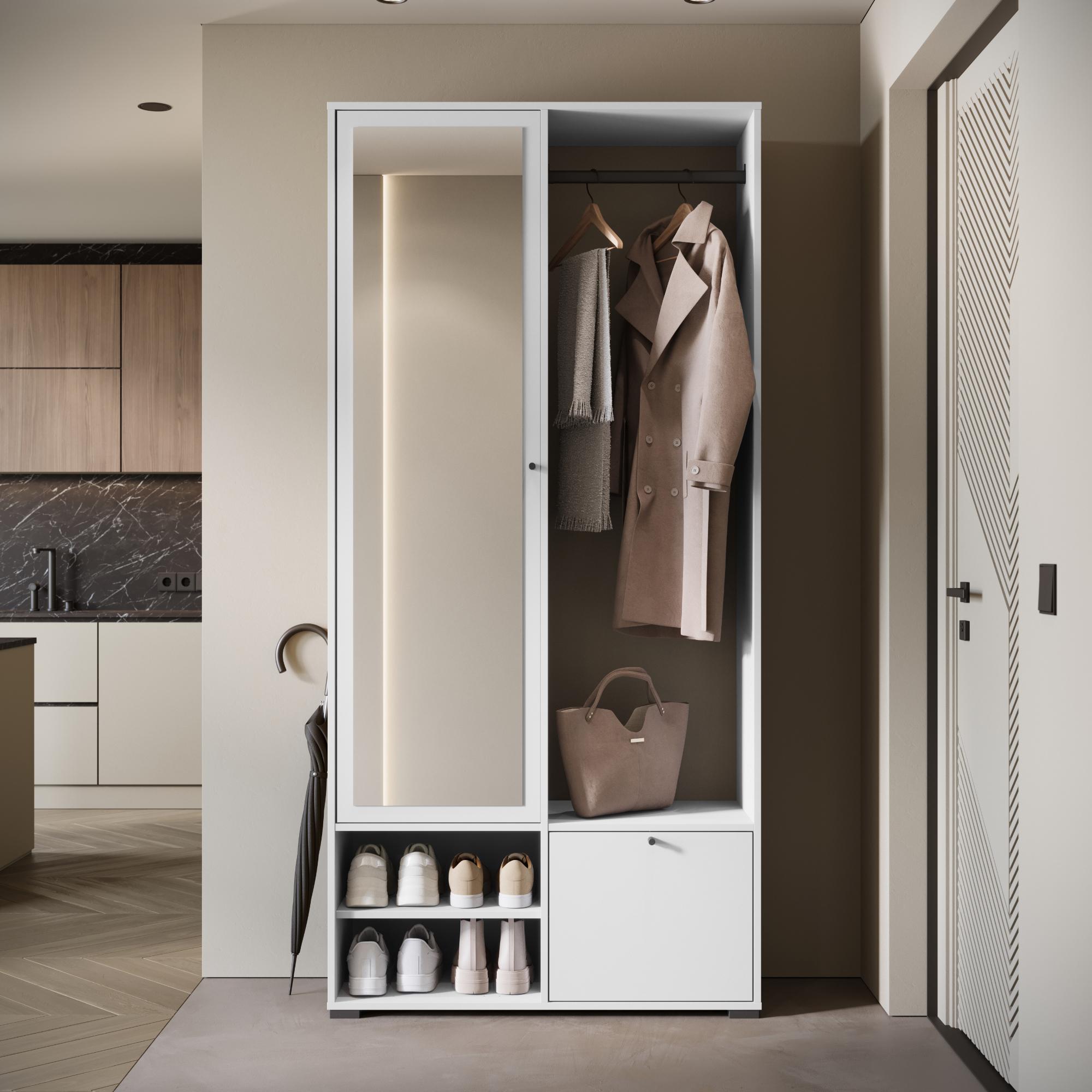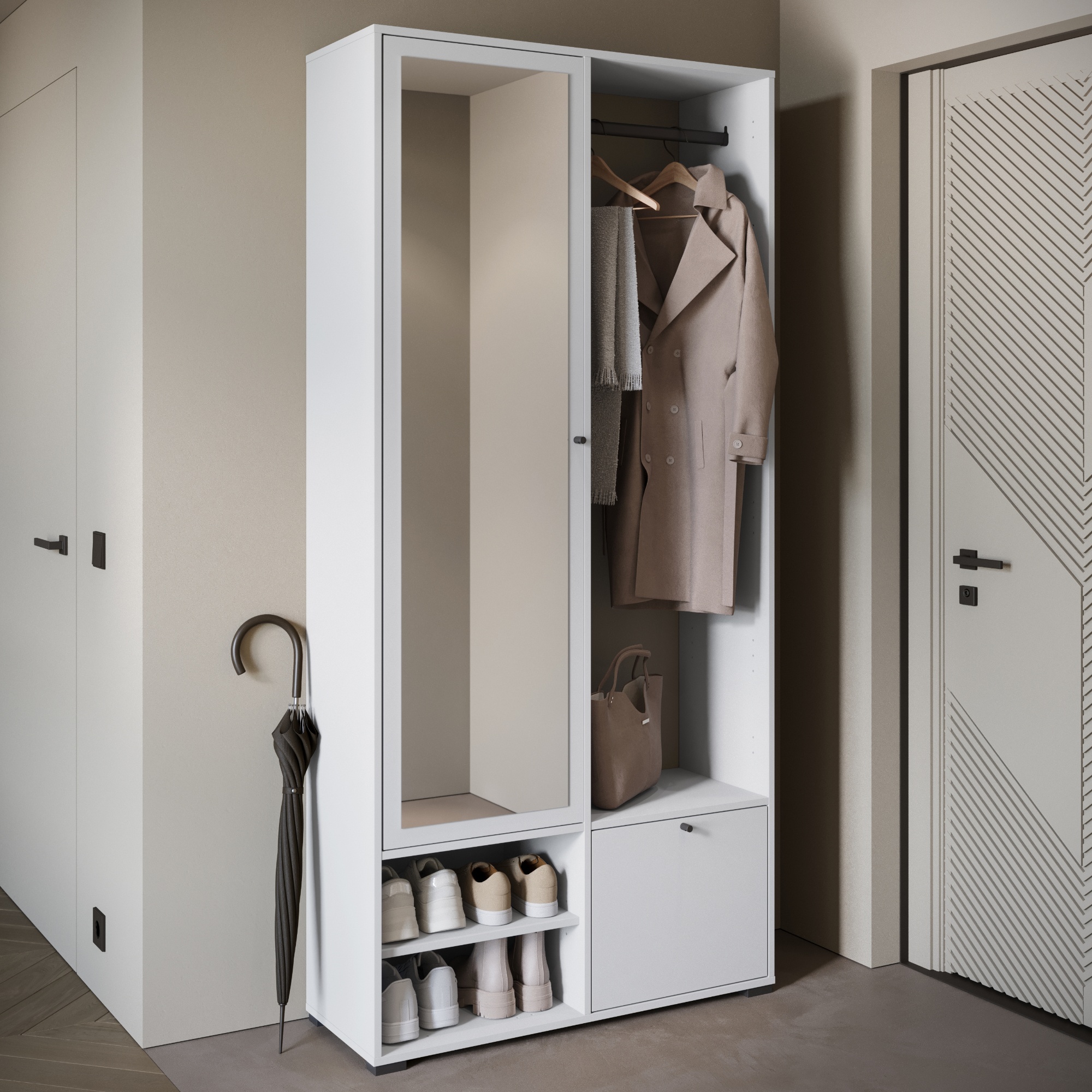 Táto predsieňová stena ponúka dostatok úložného priestoru na 16 párov topánok a jej nosnosť je 48 kg. Stena je vybavená nielen 5 nastaviteľnými policami, z ktorých 4 sú umiestnené za dvierkami, ale aj 1 šatníkovou tyčou. Nechýba ani zrkadlo, ktoré vám umožní vždy pred odchodom z domu skontrolovať váš vzhľad. Pretože skrinku so zrkadlovými dverami je možné namontovať na pravú aj ľavú stranu, môžete stenu dokonale prispôsobiť vašim potrebám.