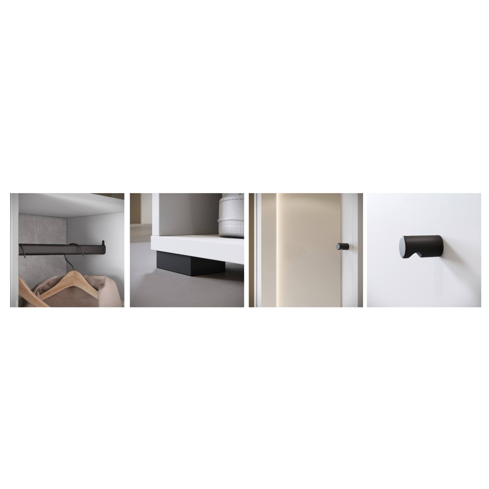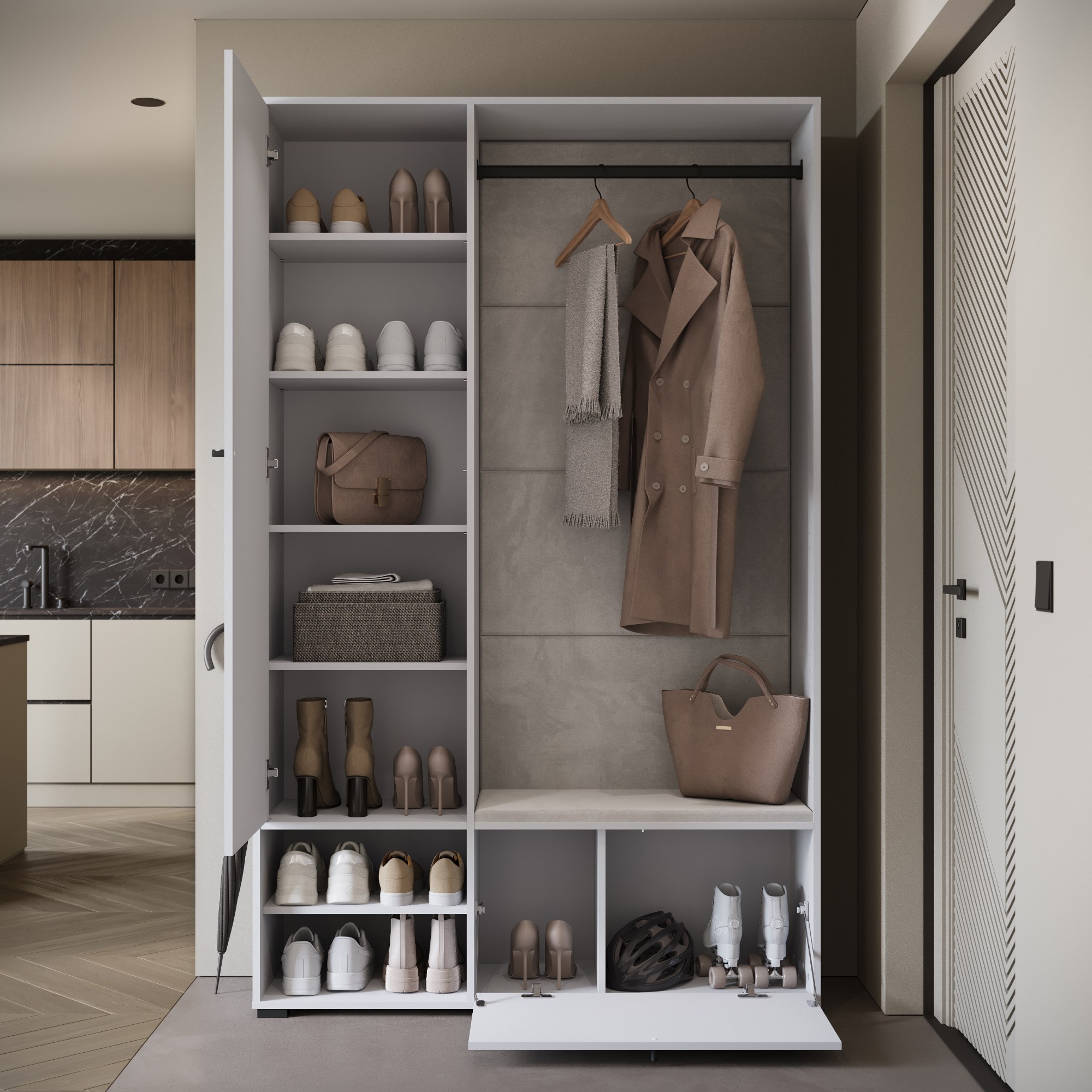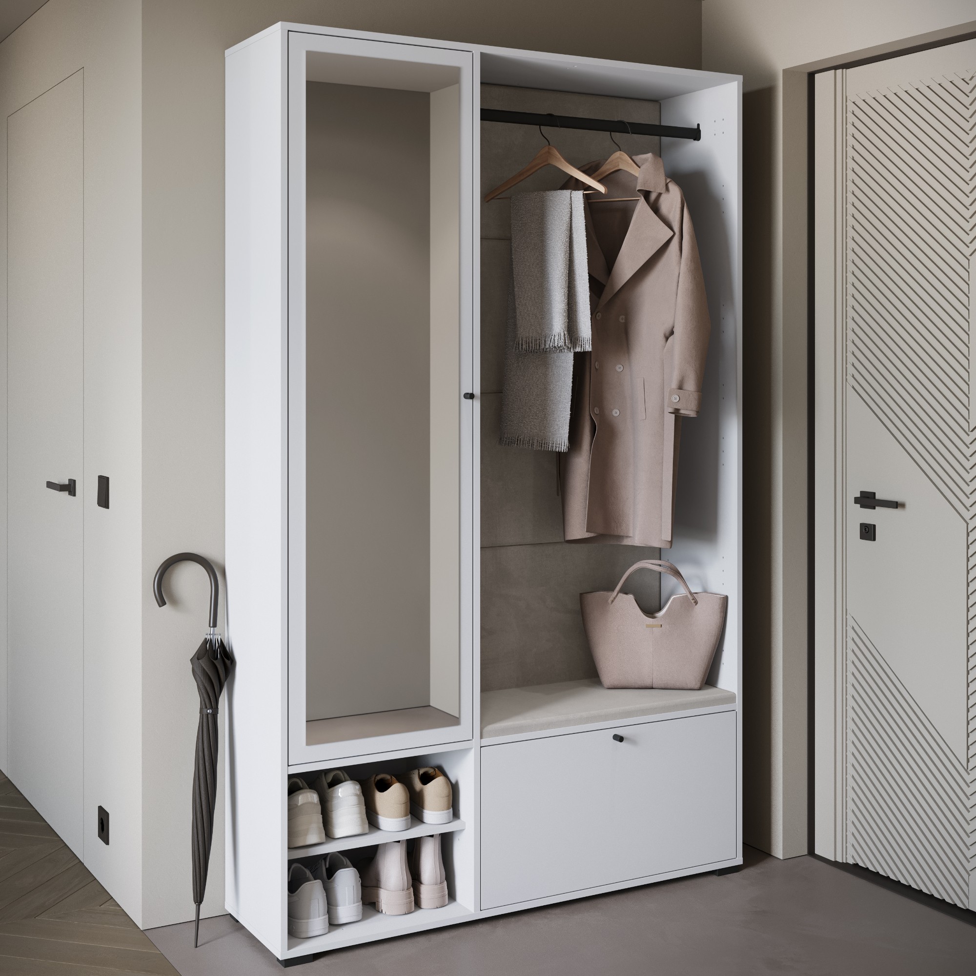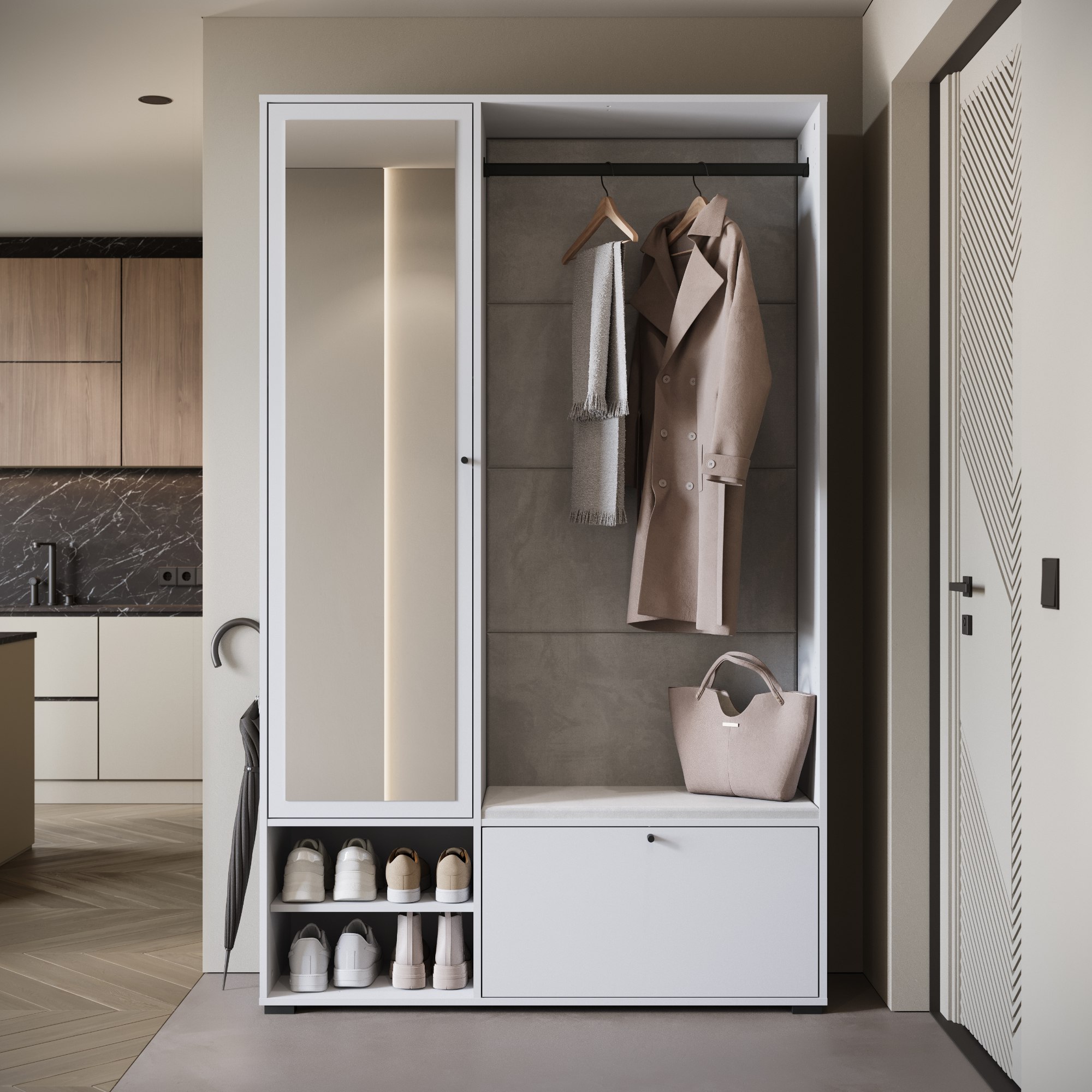 Súčasťou steny je 5 nastaviteľných políc, z ktorých 4 sa ukrývajú za otočnými dvierkami. Aby sa s dvierkami dobre manipulovalo, sú vybavené plastovými rúčkami. Nechýba ani 1 kovová šatníková tyč a zrkadlo, v ktorom si budete môcť vždy pred odchodom z domu skontrolovať váš vzhľad. Dvierka so zrkadlom je možné namontovať na pravú aj ľavú stranu steny.