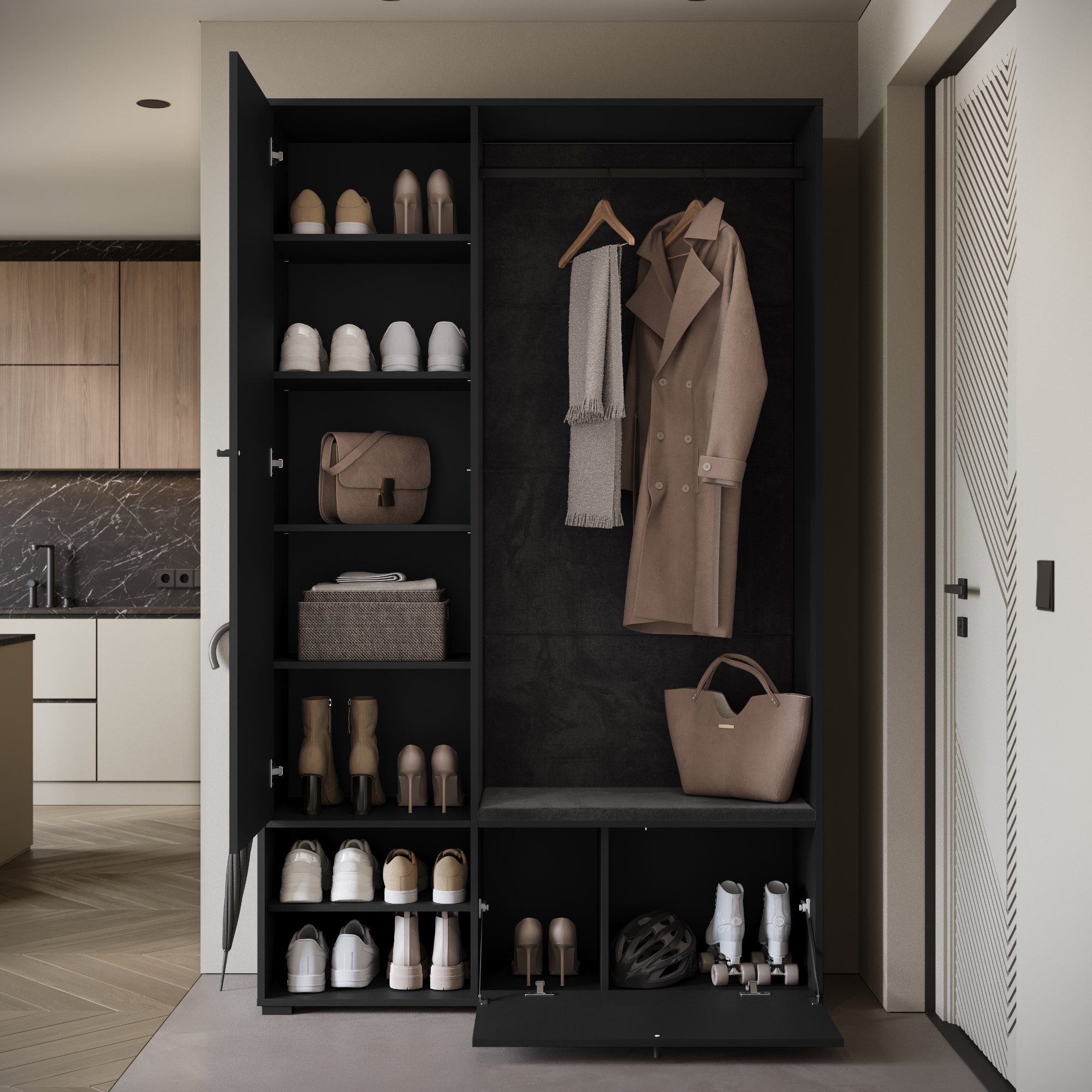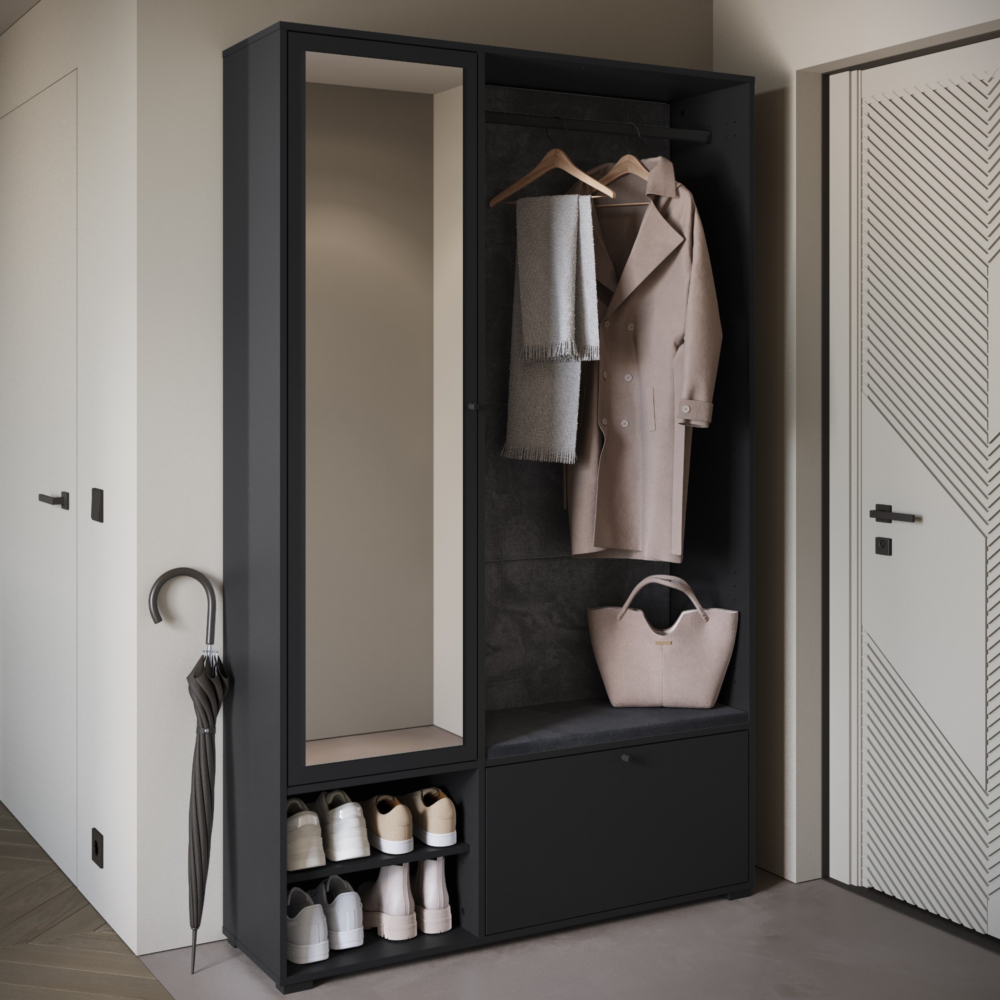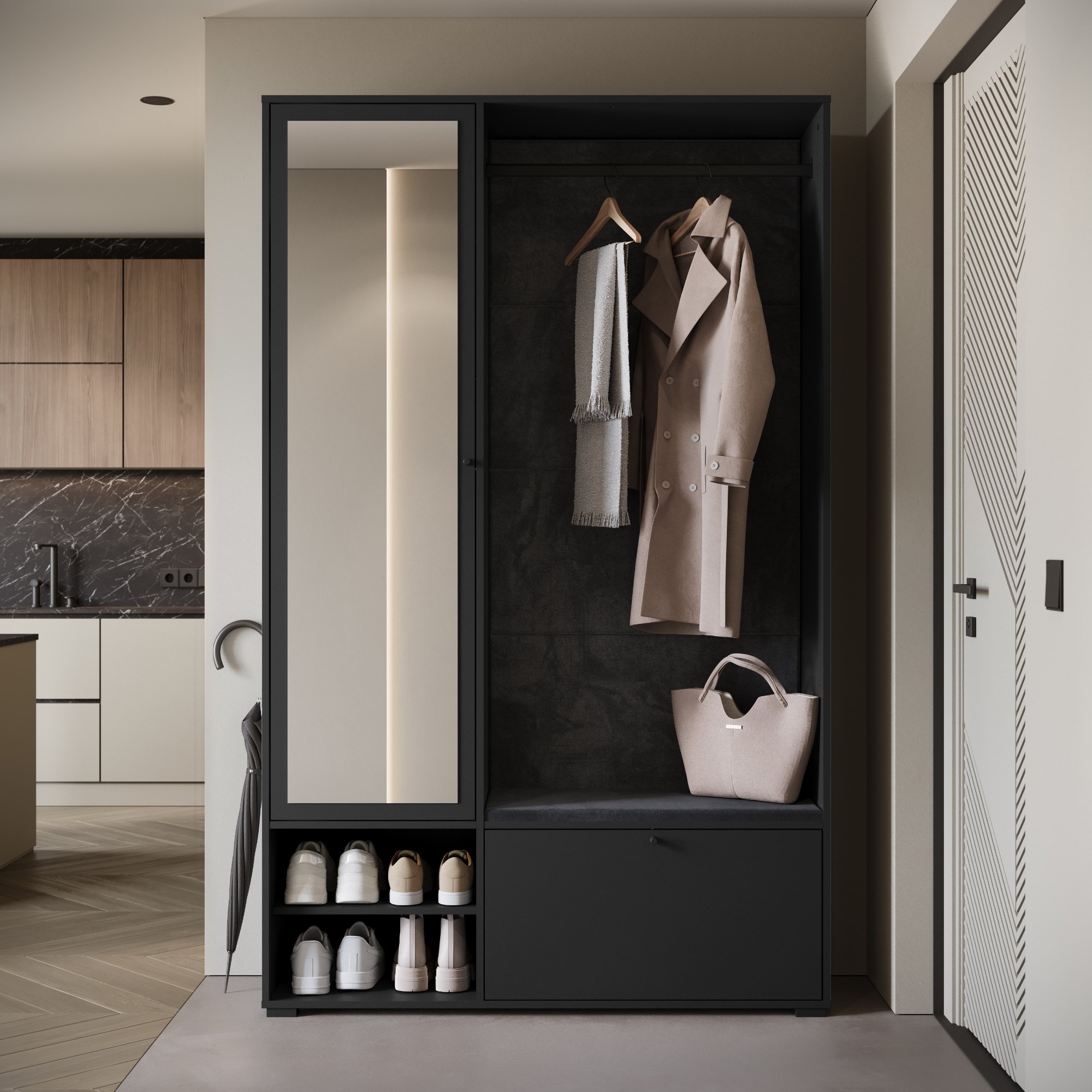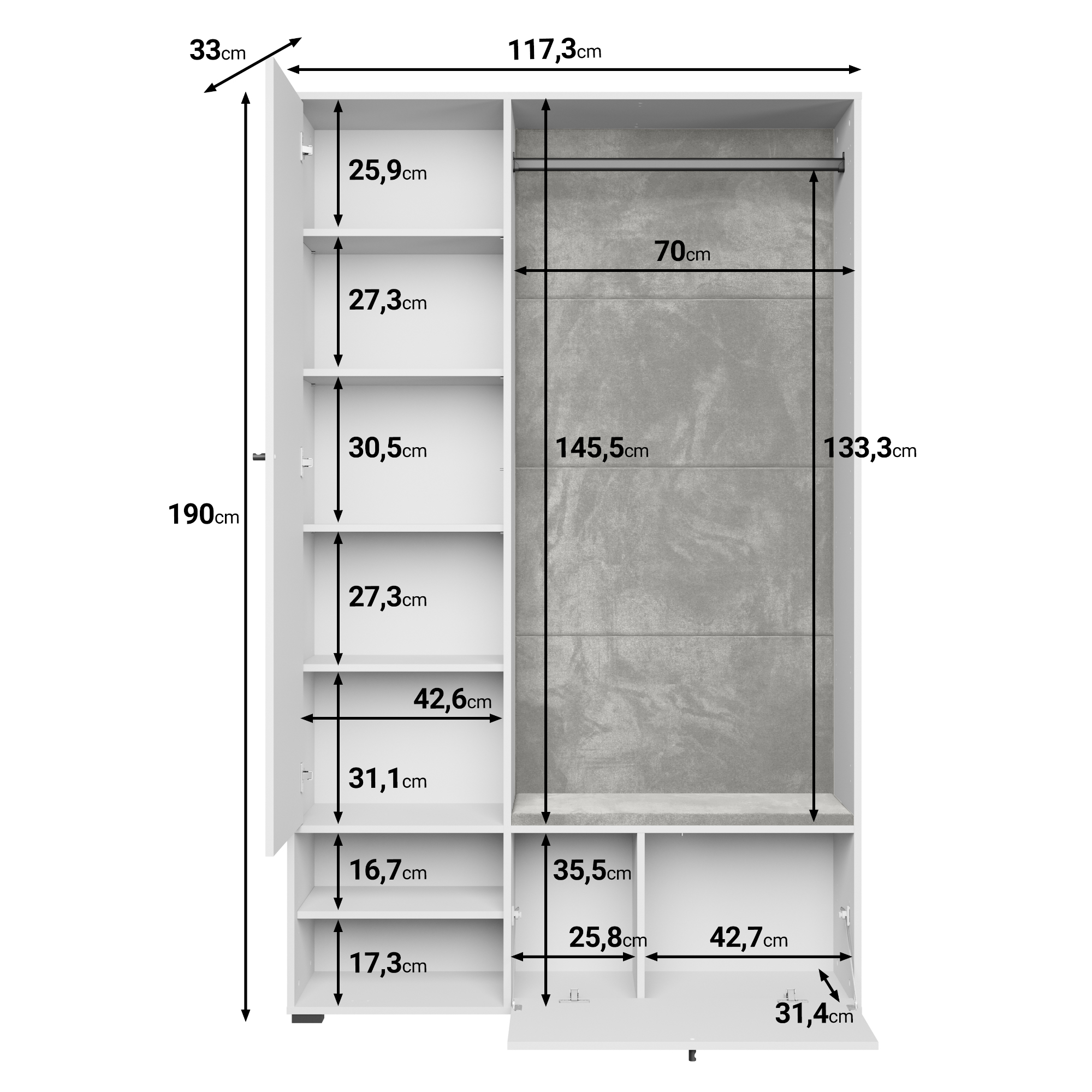 Súčasťou steny je 5 nastaviteľných políc, z ktorých 4 sa ukrývajú za otočnými dvierkami. Aby sa s dvierkami dobre manipulovalo, sú vybavené plastovými rúčkami. Nechýba ani 1 kovová šatníková tyč a zrkadlo, v ktorom si budete môcť vždy pred odchodom z domu skontrolovať váš vzhľad. Dvierka so zrkadlom je možné namontovať na pravú aj ľavú stranu steny.