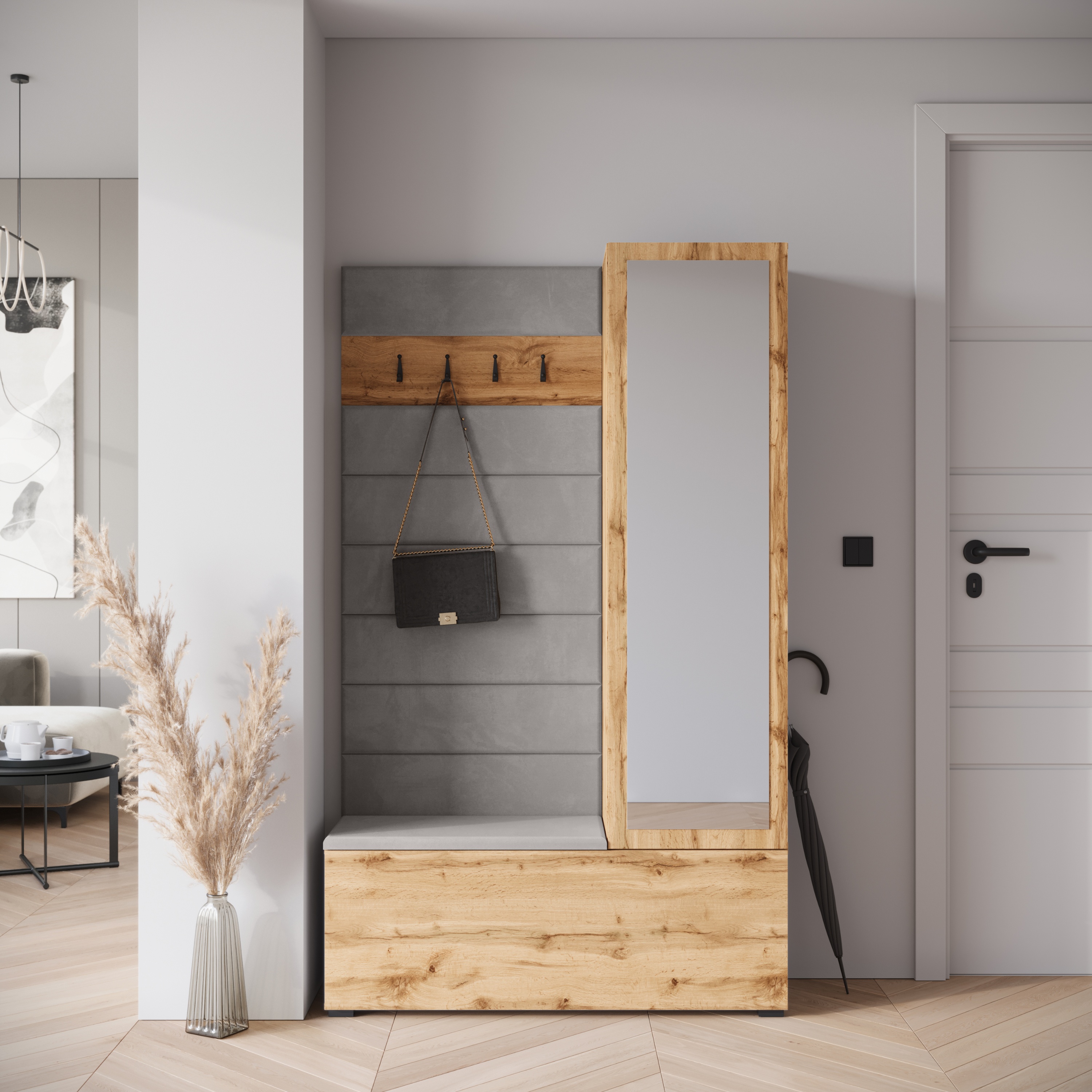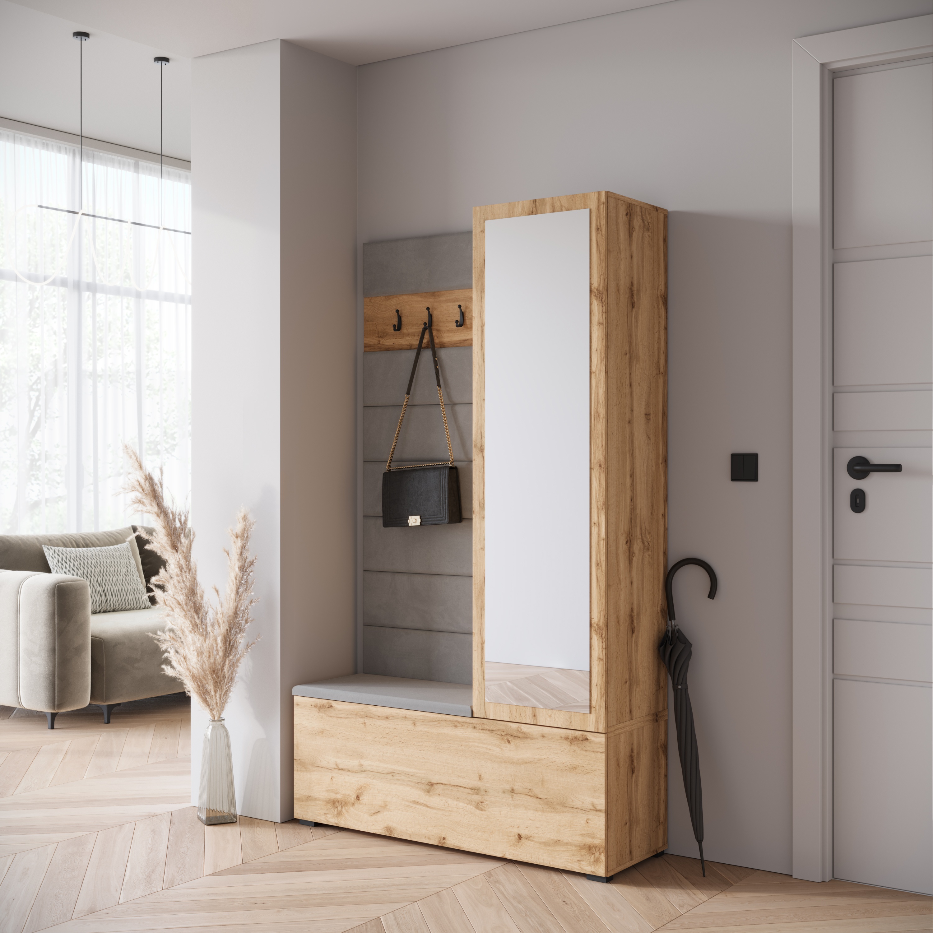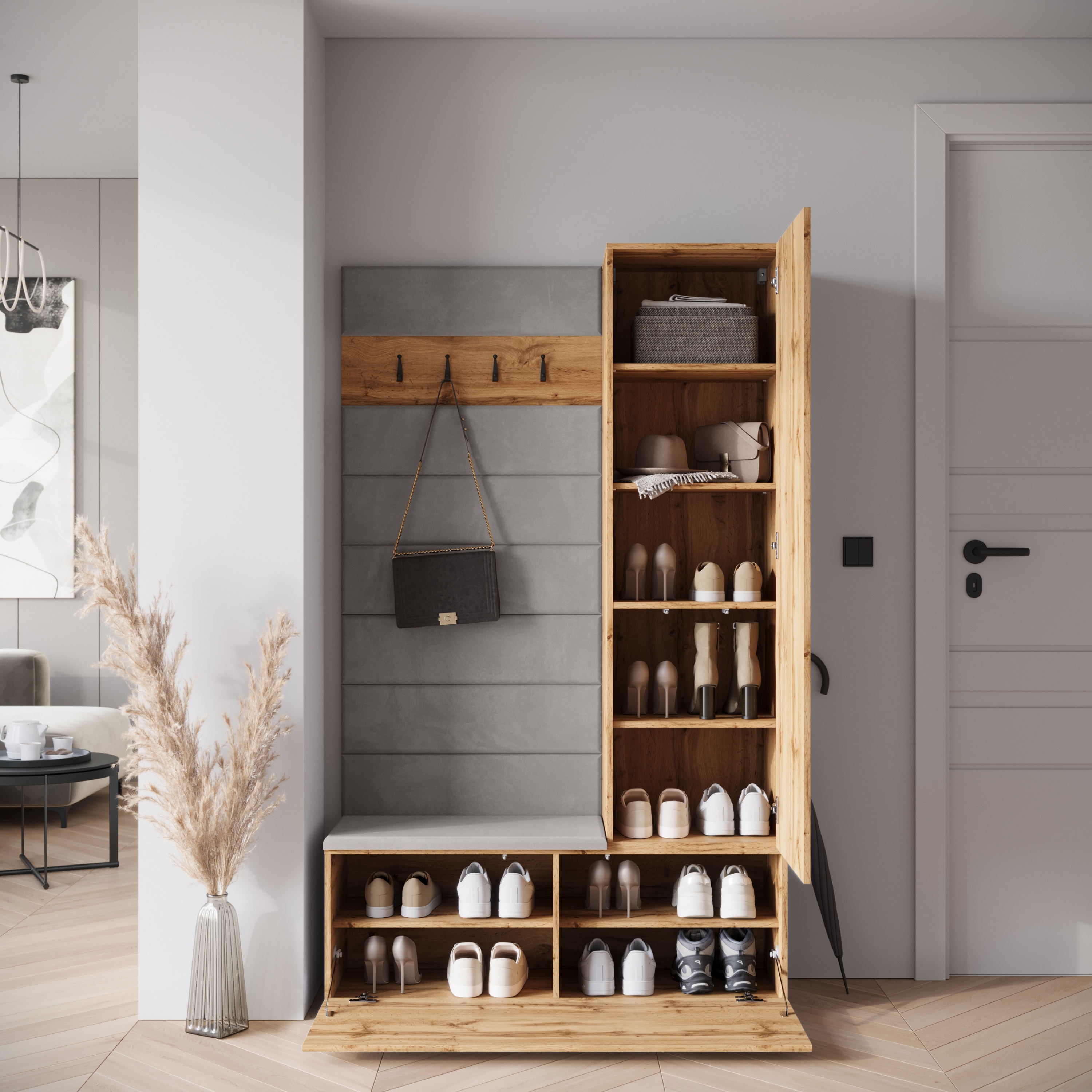 Vešiakový panel so 4 odkladacími háčikmi ponúka miesto na kabáty, bundy či kabelky, zatiaľ čo čalúnená lavica so skrinkou na topánky spríjemní prezúvanie. Spodný úložný priestor je vybavený výklopnými dverami, za ktorými sa nachádzajú 2 vložené police ideálne na uloženie obuvi. Poslednou súčasťou zostavy je vysoká skrinka na topánky vybavená ďalšími 4 vloženými policami, ktoré ponúkajú dostatok miesta na topánky, doplnky aj sezónne veci. Integrované zrkadlo opticky zväčší priestor a zároveň umožní rýchlu kontrolu outfitu pred odchodom z domu. Jednotlivé dvere sú opatrené systémom tichého dovierania, ktorý zvyšuje komfort používania a predlžuje životnosť nábytku. Zostava je vyrobená z laminovanej drevotriesky s povrchom nenáročným na údržbu.