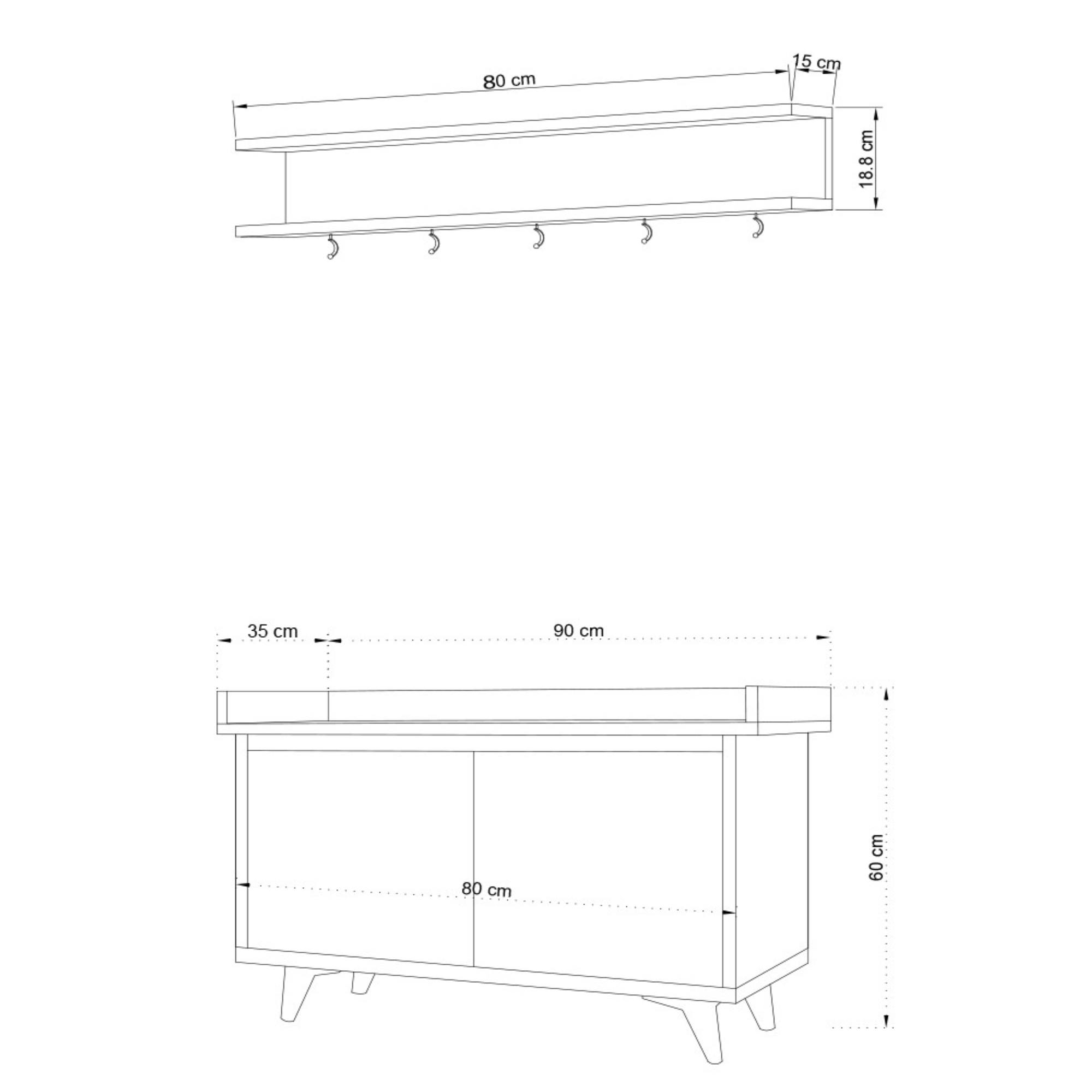 Na neveľkom priestore poskytne zázemie na odložené topánky, kabáty aj kabelky. Neutrálne farebné vyhotovenie v kombinácii s dekorom dreva pôsobí nerušivým dojmom a rozjasní aj menší vstupný priestor. Poskytne zázemie nielen odloženým kabátom a topánkam, ale ponúka aj miesto na sedenie pri obúvaní a priestor na odloženie kľúčov, kabeliek iných drobností, ktoré chcete mať pri odchode z domu po ruke. Skladá sa z lavice s odkladacím priestorom na topánky a police s háčikmi.
