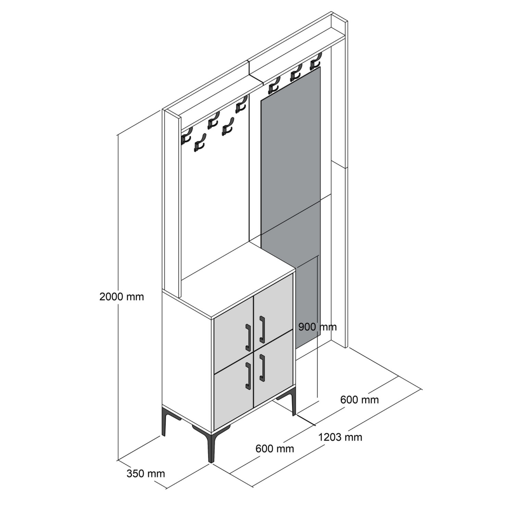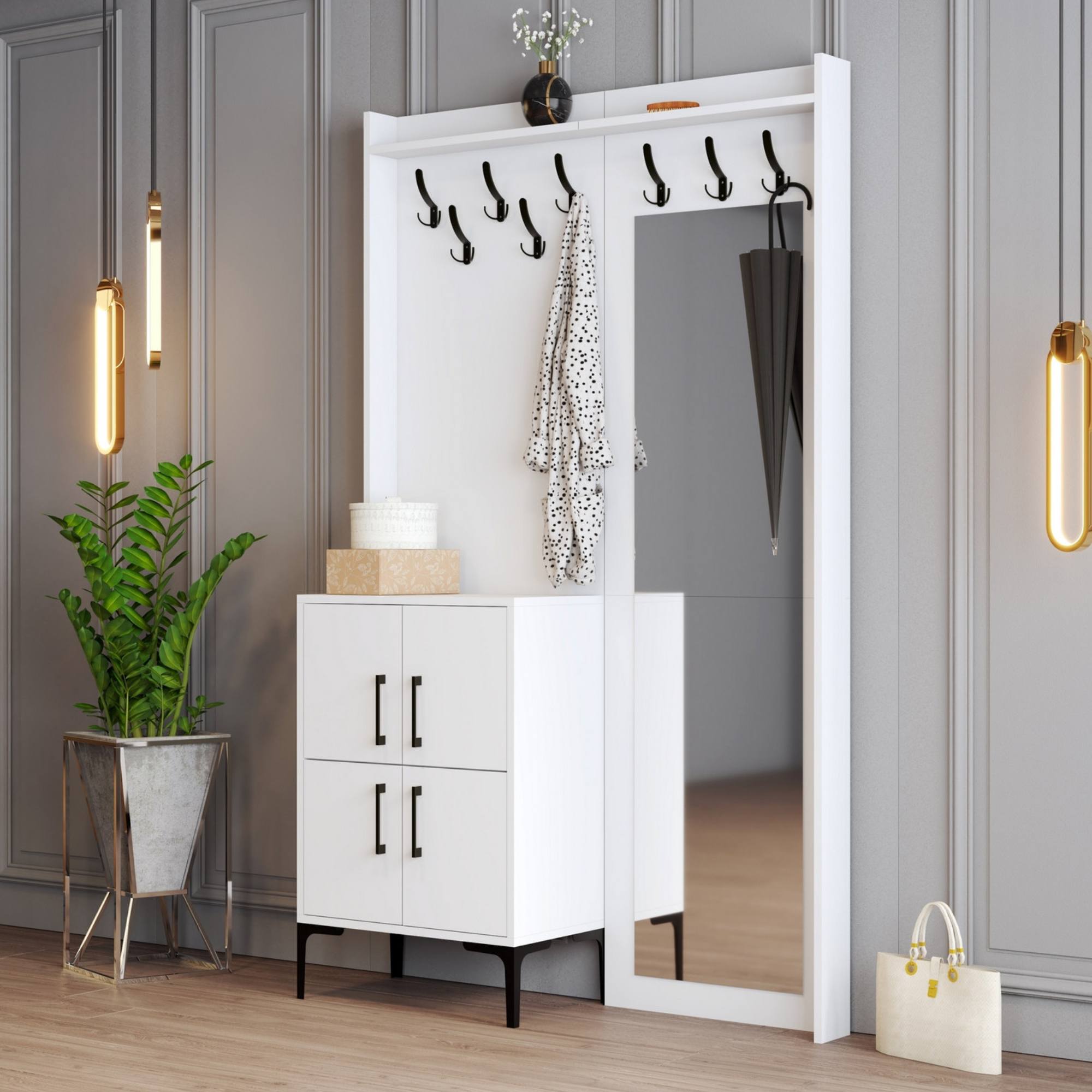 Zostava ponúka dostatok úložného priestoru. Jej súčasťou sú 2 police, z ktorých 1 sa nachádza za otočnými dvierkami. Tie sú pre lepšiu manipuláciu vybavené kovovými rúčkami. Nechýba ani 8 kovových dvojitých háčikov, na ktoré si môžete zavesiť obľúbené odevy aj módne doplnky, a zrkadlo, v ktorom si môžete vždy pred odchodom z domova overiť, že vyzeráte bezchybne.