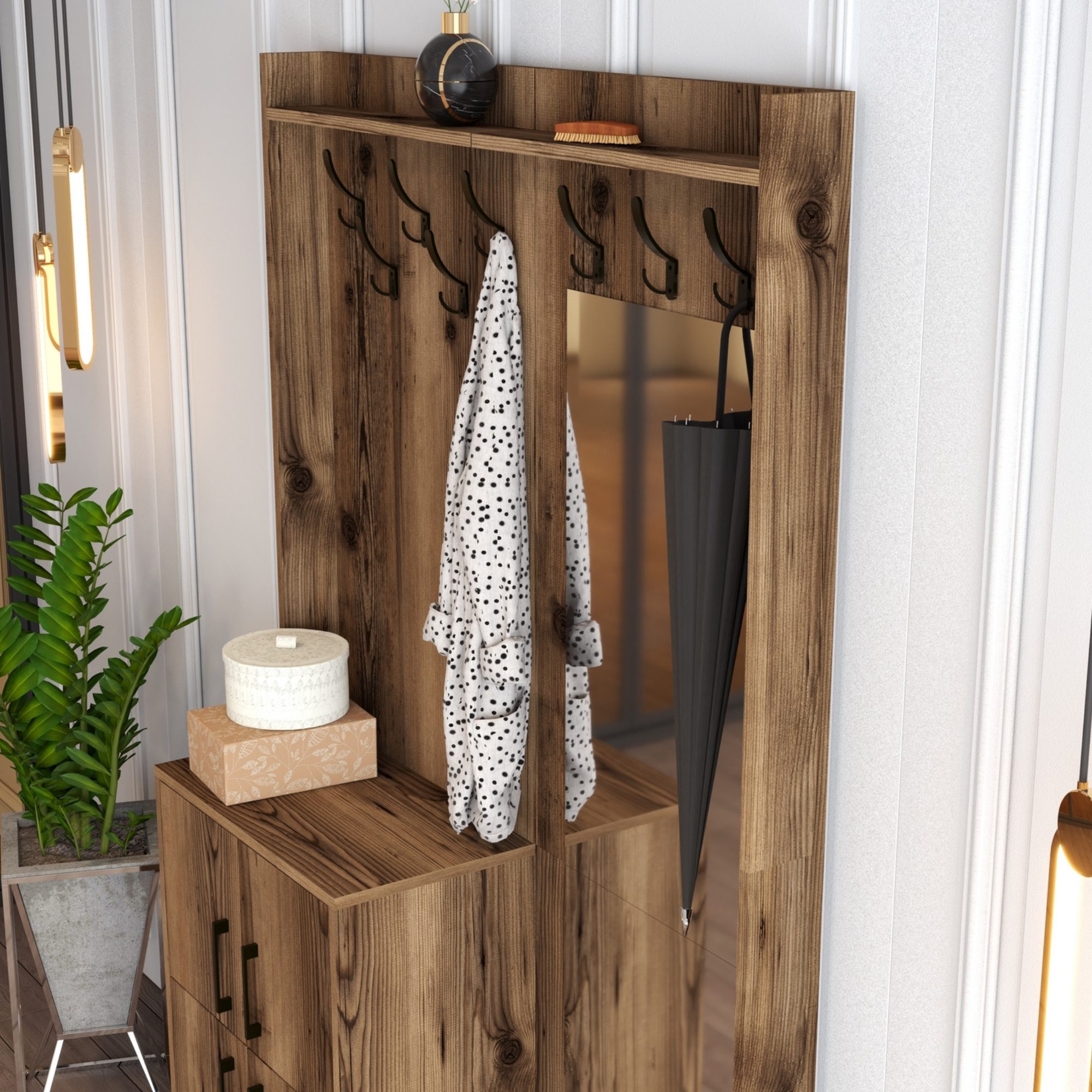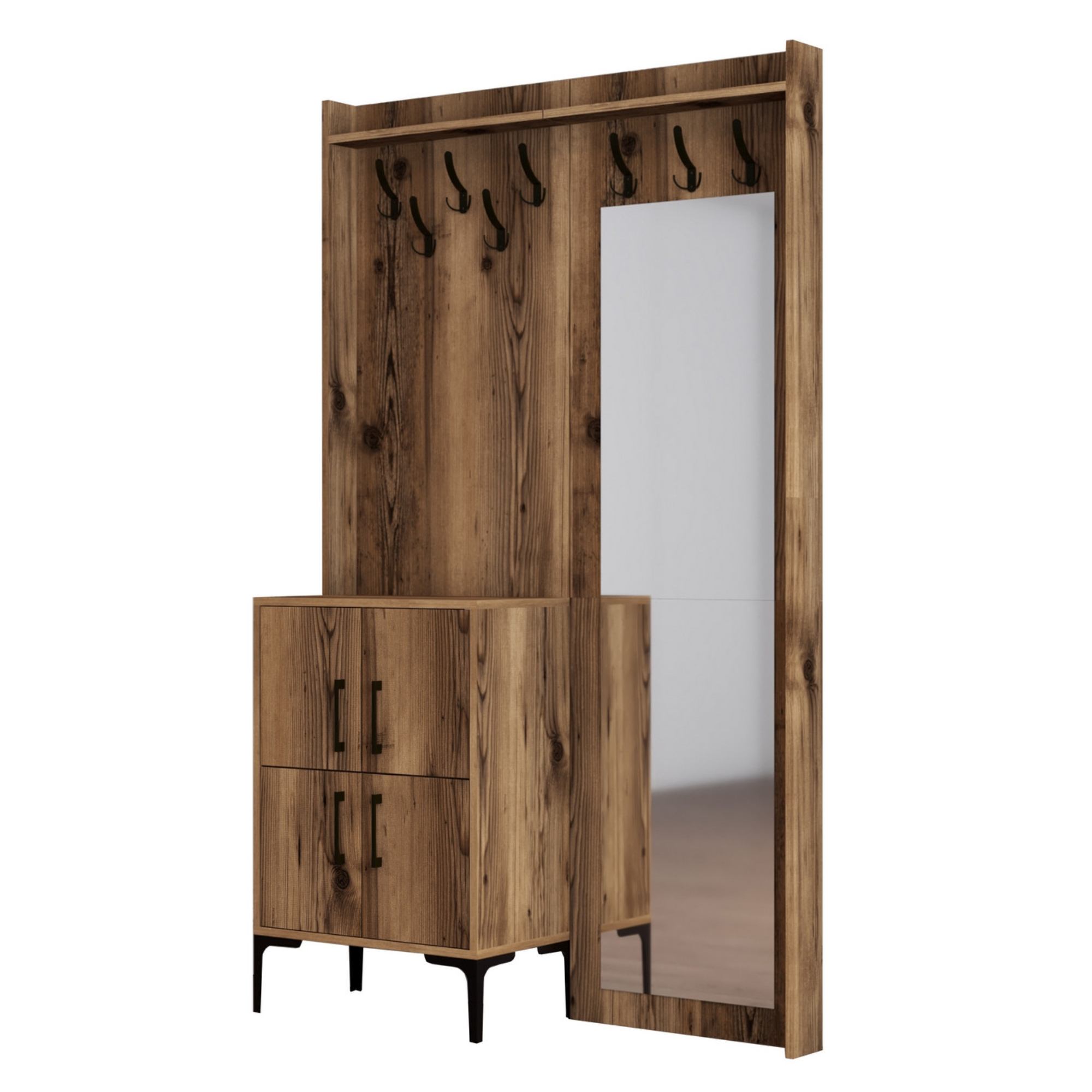 Zostava ponúka dostatok úložného priestoru. Jej súčasťou sú 2 police, z ktorých 1 sa nachádza za otočnými dvierkami. Tie sú pre lepšiu manipuláciu vybavené kovovými rúčkami. Nechýba ani 8 kovových dvojitých háčikov, na ktoré si môžete zavesiť obľúbené odevy aj módne doplnky, a zrkadlo, v ktorom si môžete vždy pred odchodom z domova overiť, že vyzeráte bezchybne.