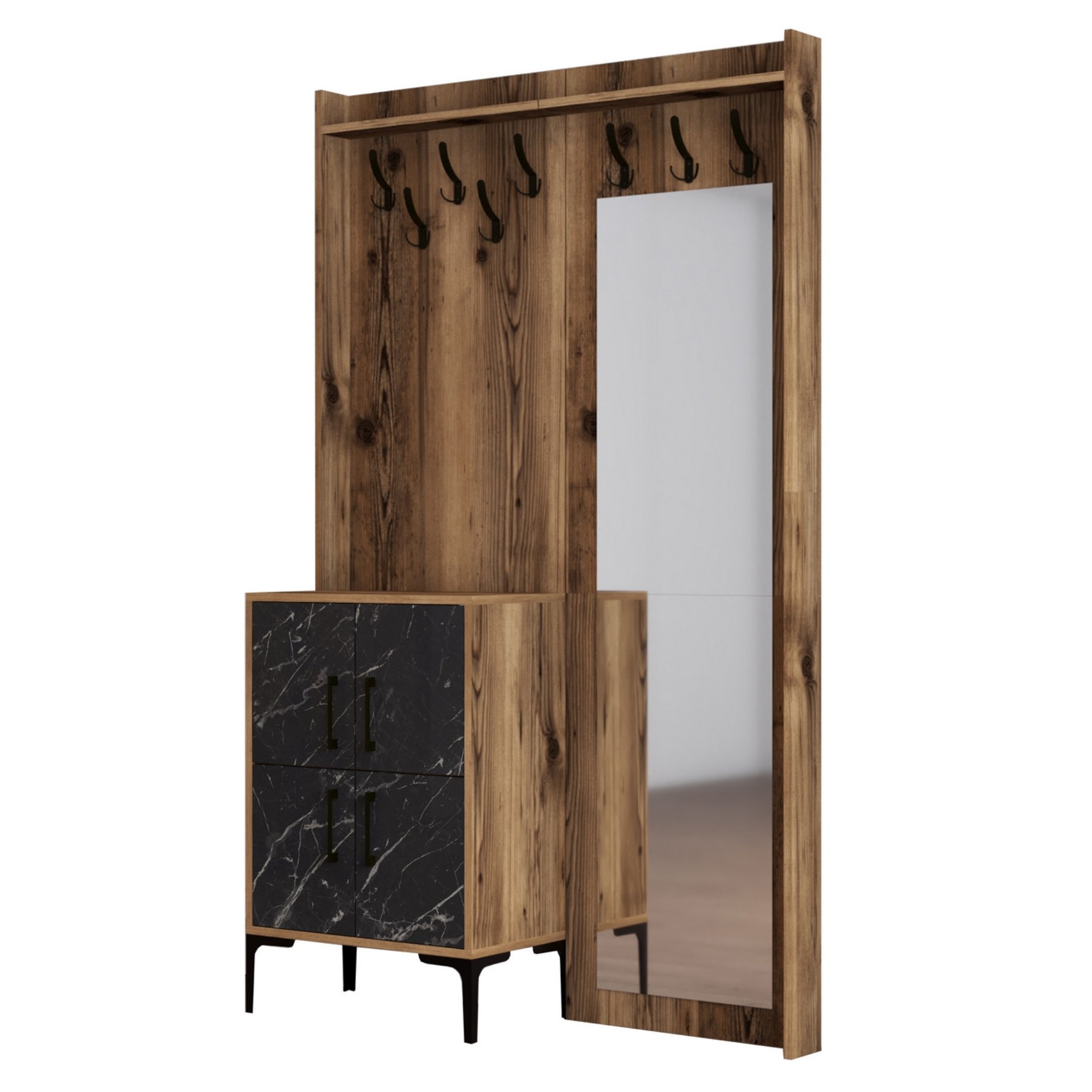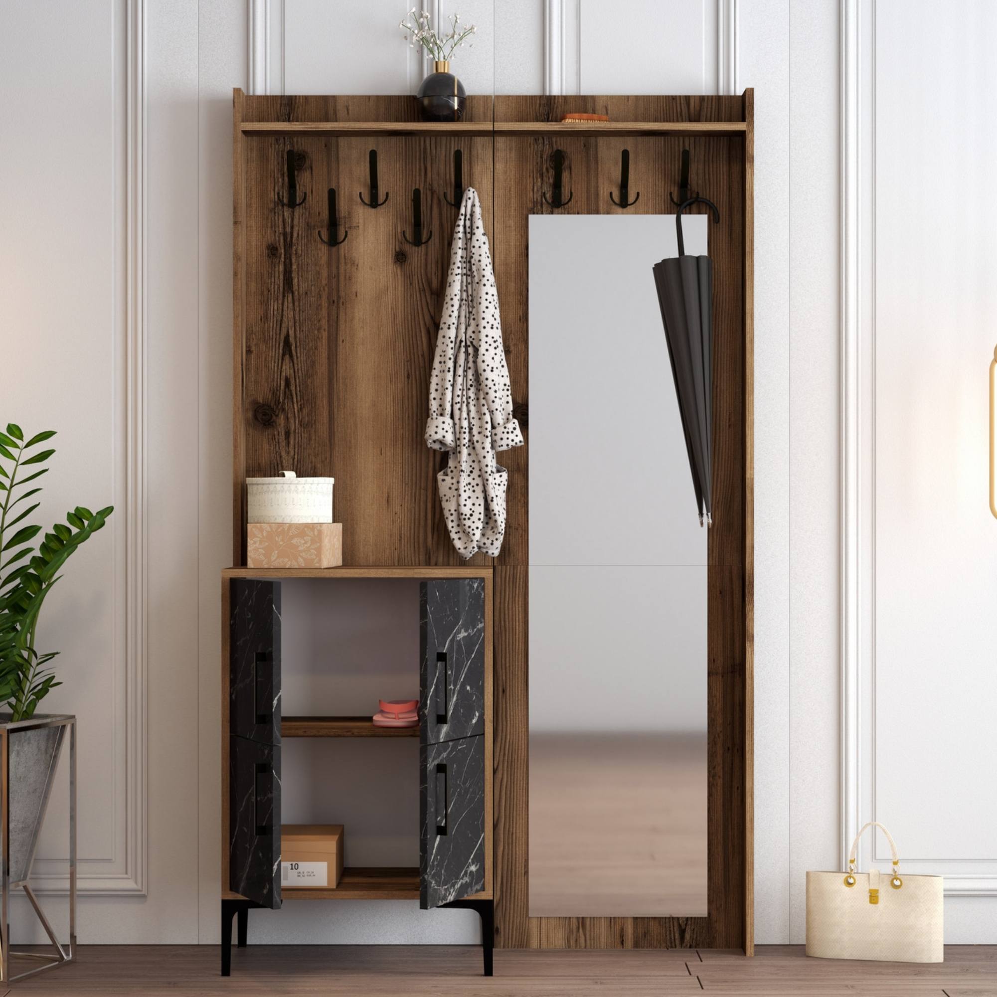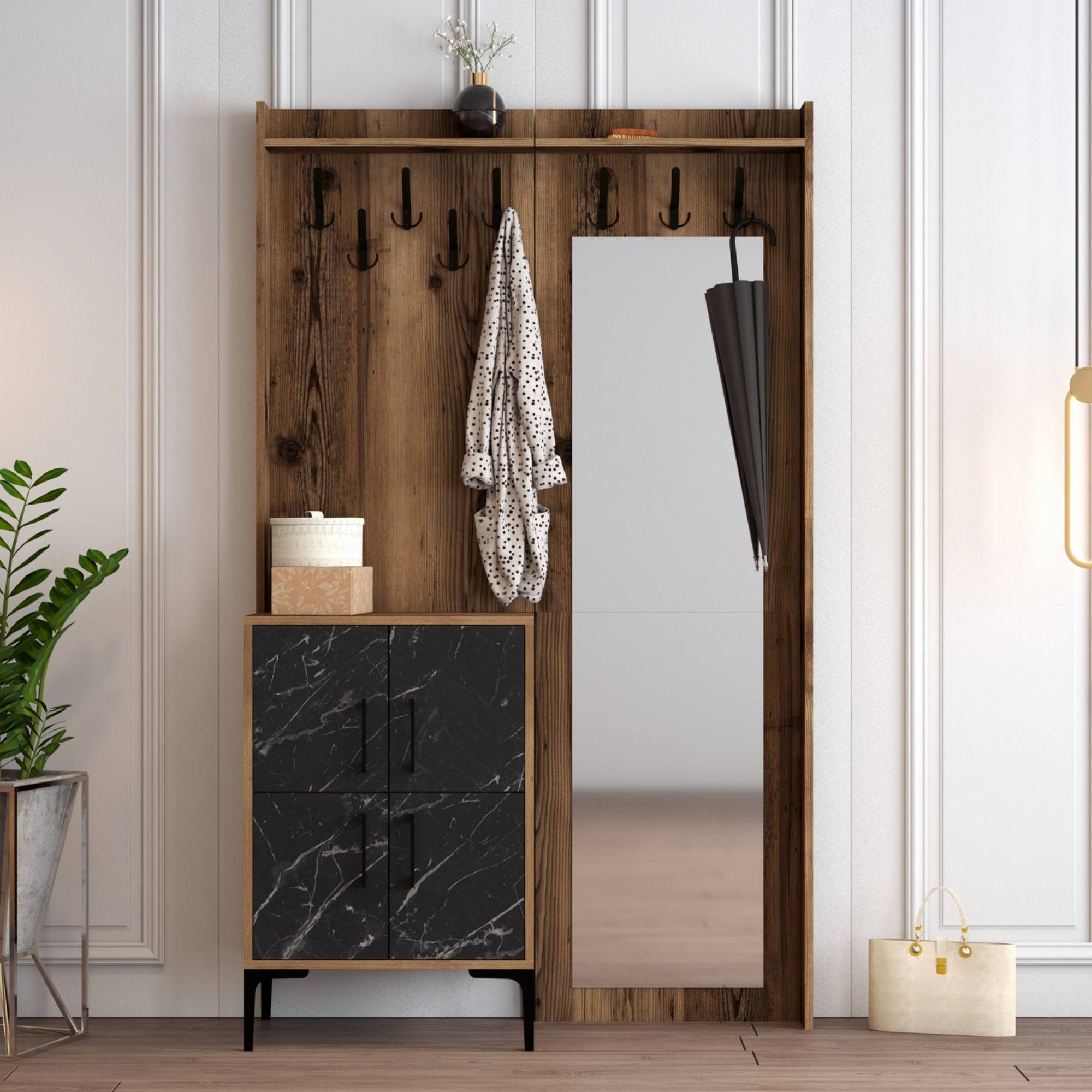 Zostava ponúka dostatok úložného priestoru. Jej súčasťou sú 2 police, z ktorých 1 sa nachádza za otočnými dvierkami. Tie sú pre lepšiu manipuláciu vybavené kovovými rúčkami. Nechýba ani 8 kovových dvojitých háčikov, na ktoré si môžete zavesiť obľúbené odevy aj módne doplnky, a zrkadlo, v ktorom si môžete vždy pred odchodom z domova overiť, že vyzeráte bezchybne.