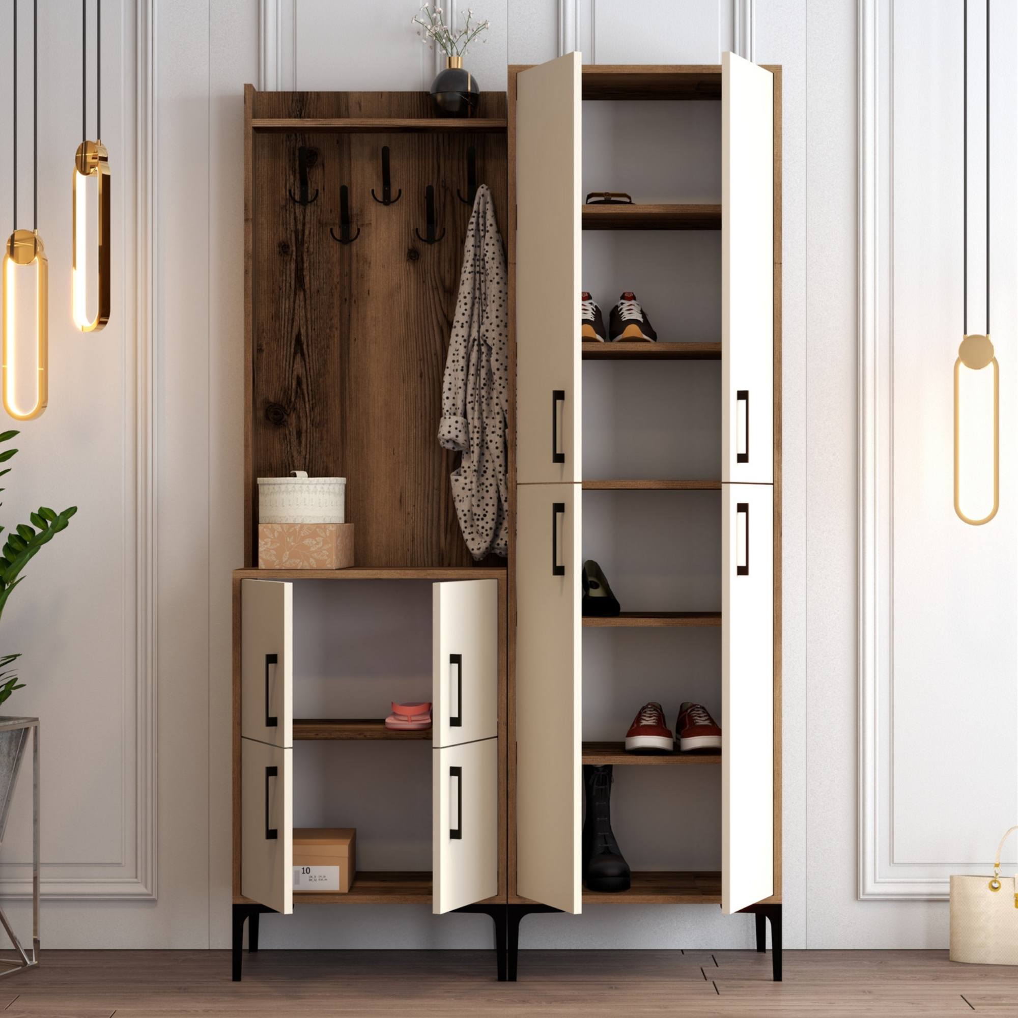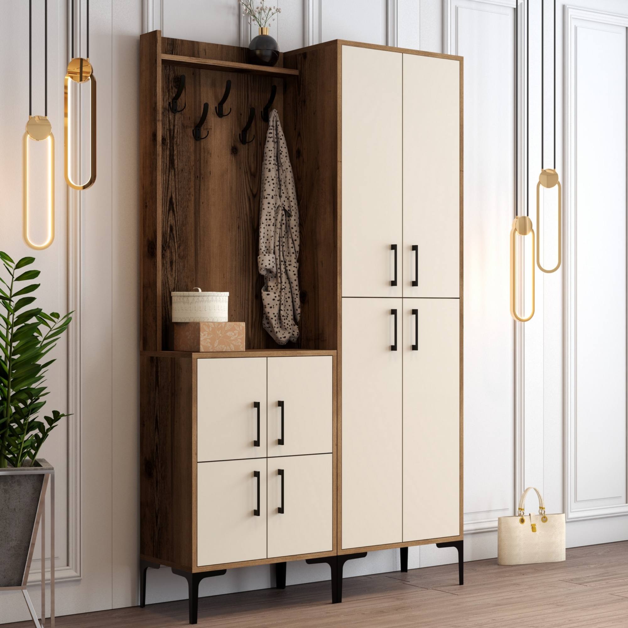 Zostava ponúka dostatok úložného priestoru. Jej súčasťou je 7 políc, z ktorých 6 sa ukrýva za otočnými dvierkami. Aby sa s týmito dvierkami dobre manipulovalo, sú vybavené plastovými rúčkami. Nechýbajú ani 5 kovových dvojitých háčikov, na ktoré si môžete zavesiť obľúbené odevy aj módne doplnky.
