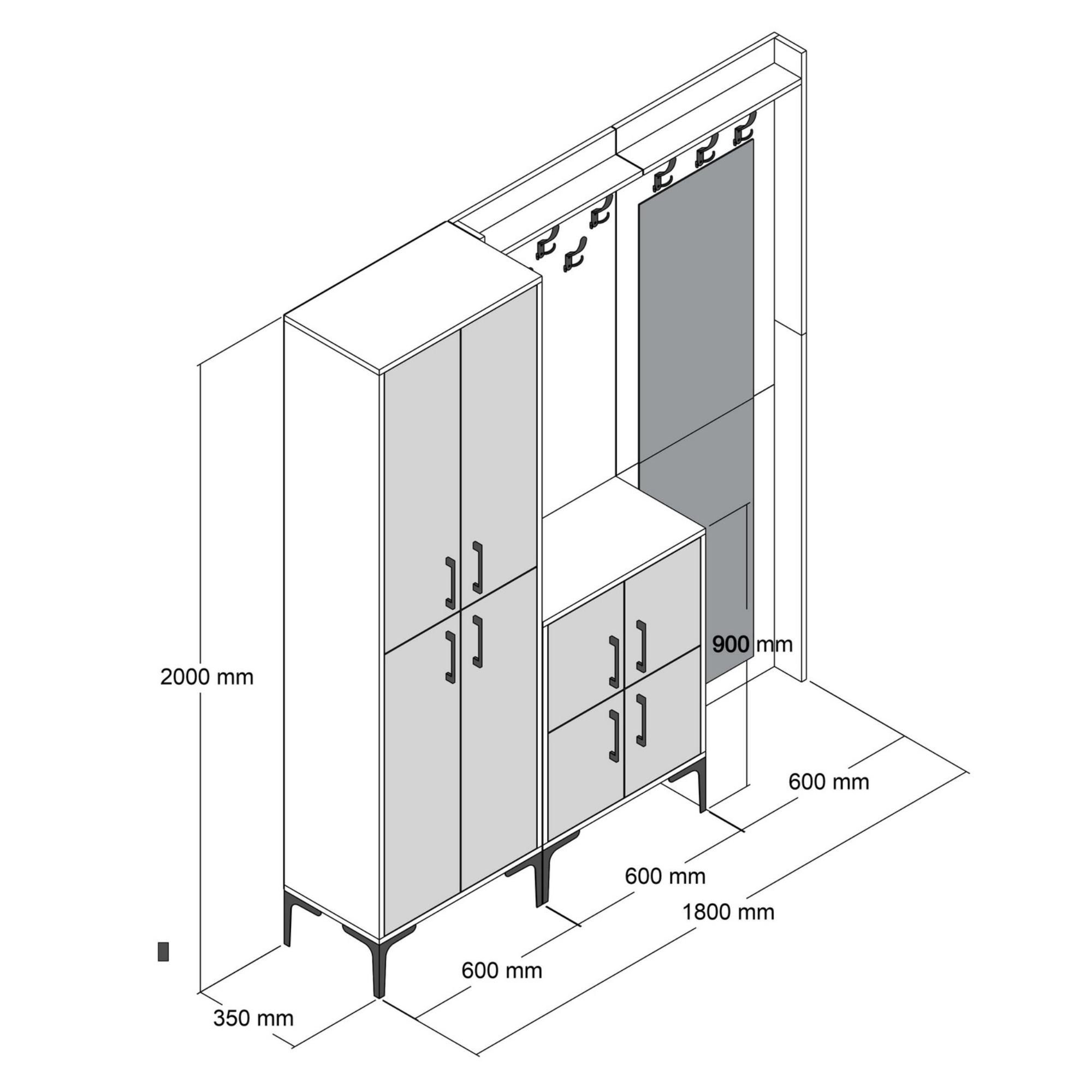 Zostava ponúka dostatok úložného priestoru. Jej súčasťou je 7 políc, z ktorých 6 sa nachádza za otočnými dvierkami. Tie sú pre lepšiu manipuláciu vybavené kovovými rúčkami. Nechýba ani 8 kovových dvojitých háčikov, na ktoré si môžete zavesiť obľúbené odevy aj módne doplnky, a zrkadlo, v ktorom si môžete vždy pred odchodom z domova overiť, že vyzeráte bezchybne.