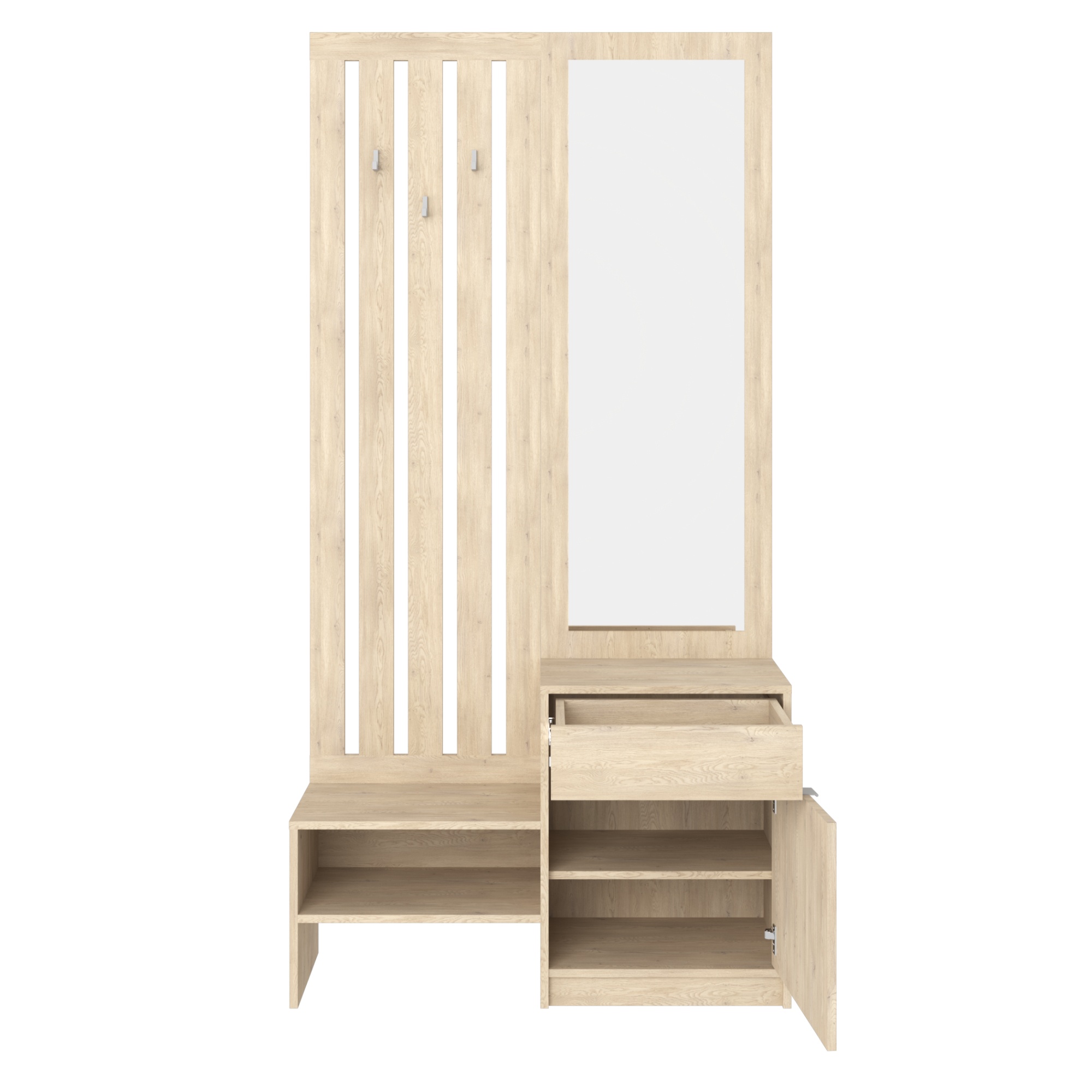 Zostava ponúka dostatok úložného priestoru. Jej súčasťou je nielen 1 vložená polica ukrytá za dvierkami, ale aj 1 zásuvka a 3 praktické háčiky. Nechýba ani zrkadlo, v ktorom si pred odchodom z domu môžete skontrolovať váš vzhľad.