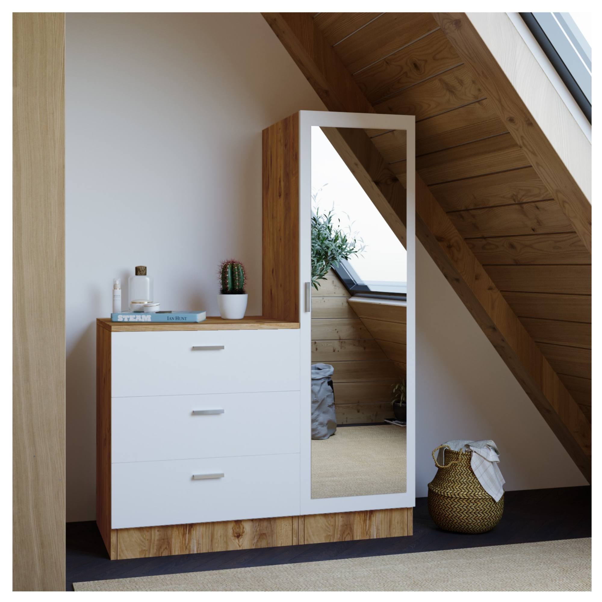 Zostava je vyrobená z laminovanej drevotrieskovej dosky, ktorá sa ľahko udržuje. Obsahuje komodu s tromi priestrannými zásuvkami a skriňu so zrkadlom, ktorá je vybavená šatníkovou tyčou a praktickou policou. Vďaka tomu ponúka dostatok miesta na topánky, kabáty, čiapky a ďalšie doplnky. Horná odkladacia doska komody navyše skvele poslúži na vystavenie dekorácií, kvetov alebo iných drobností, ktoré dodajú vašej predsieni osobitý štýl.