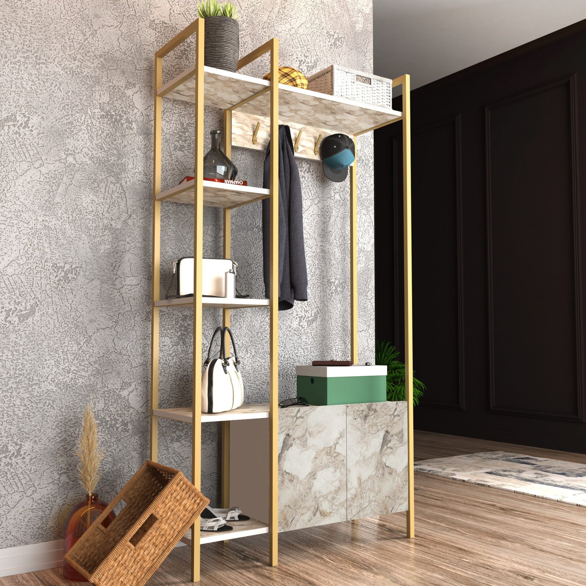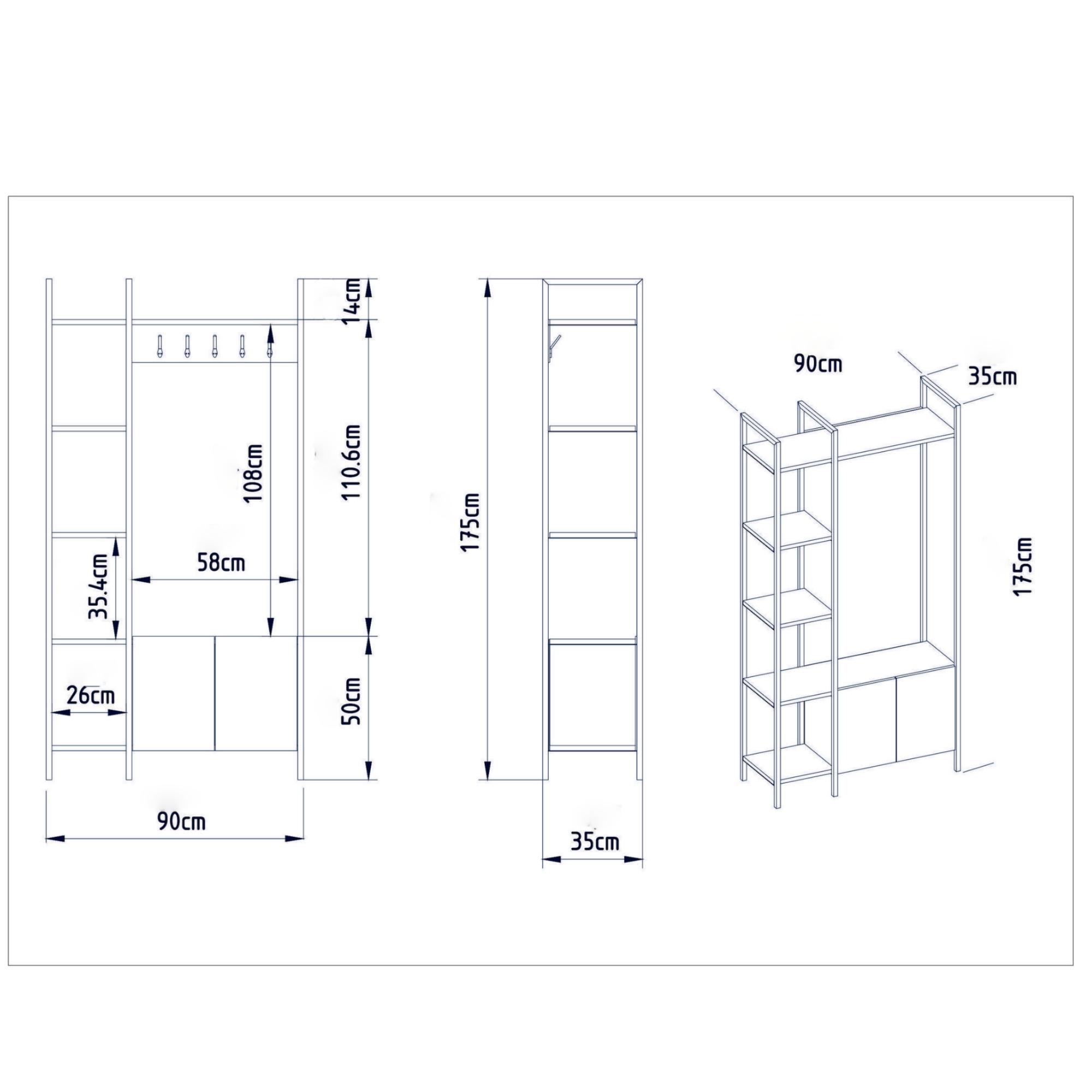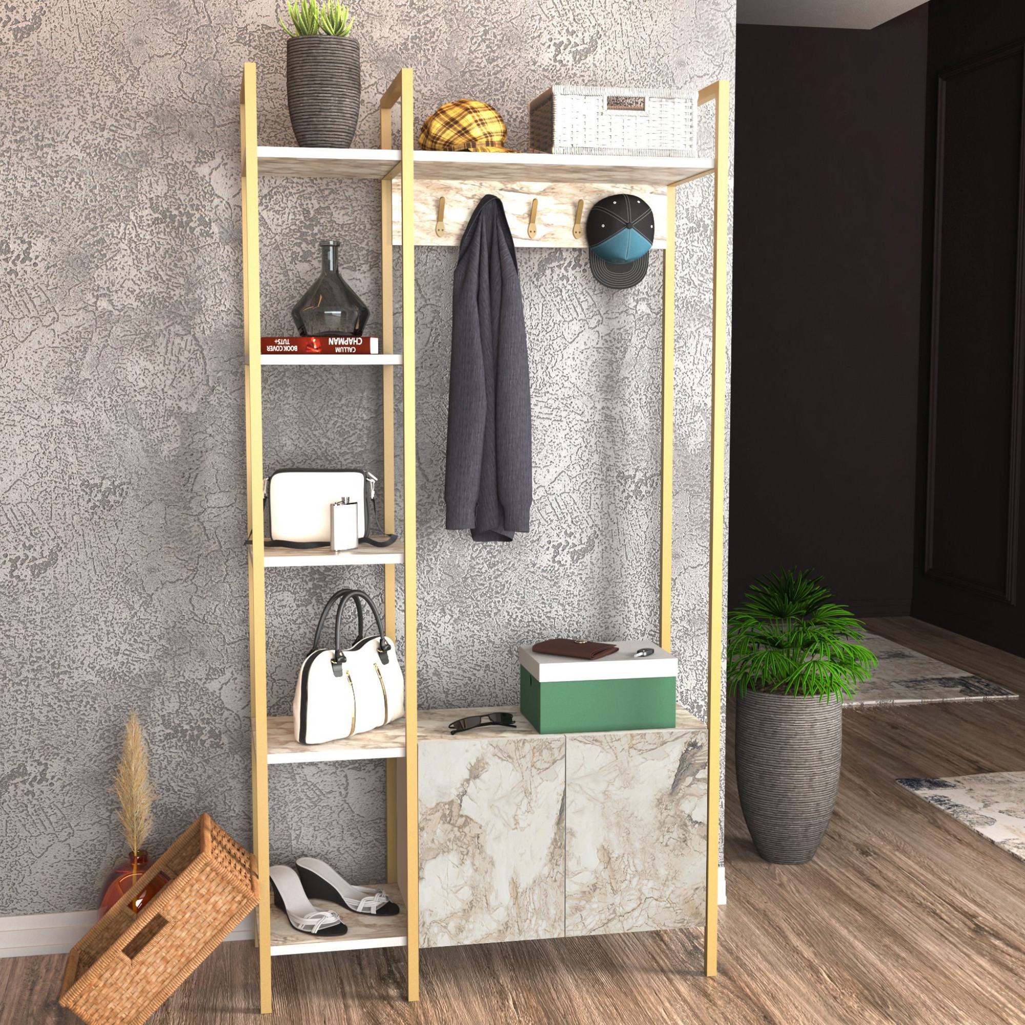 Zostava ponúka dostatok odkladacieho priestoru. Okrem miesta za dvierkami je jej súčasťou aj 6 políc a 5 háčikov. Zostava má vysoké nohy, vďaka ktorým bude upratovanie pod ňou ľahké a bezproblémové.