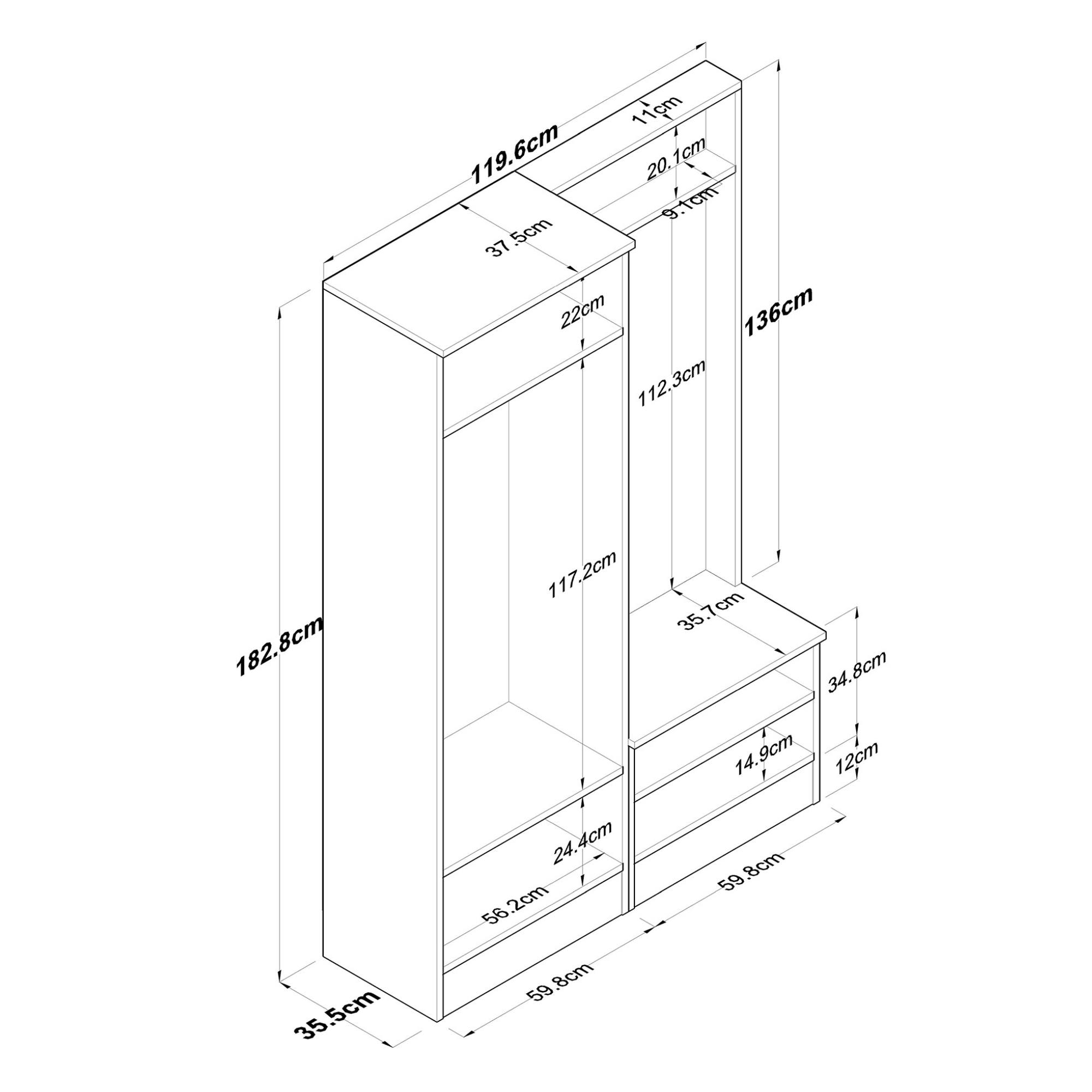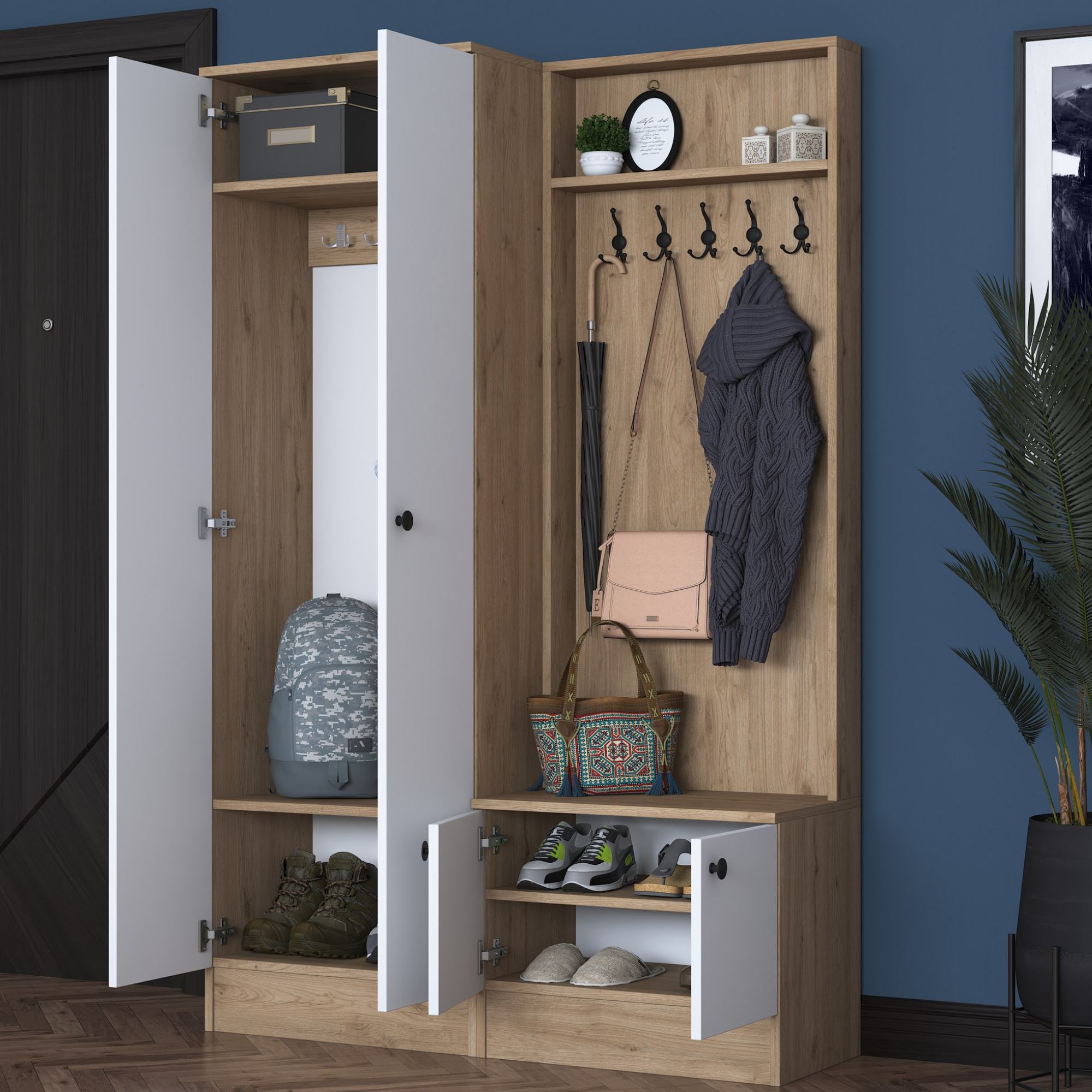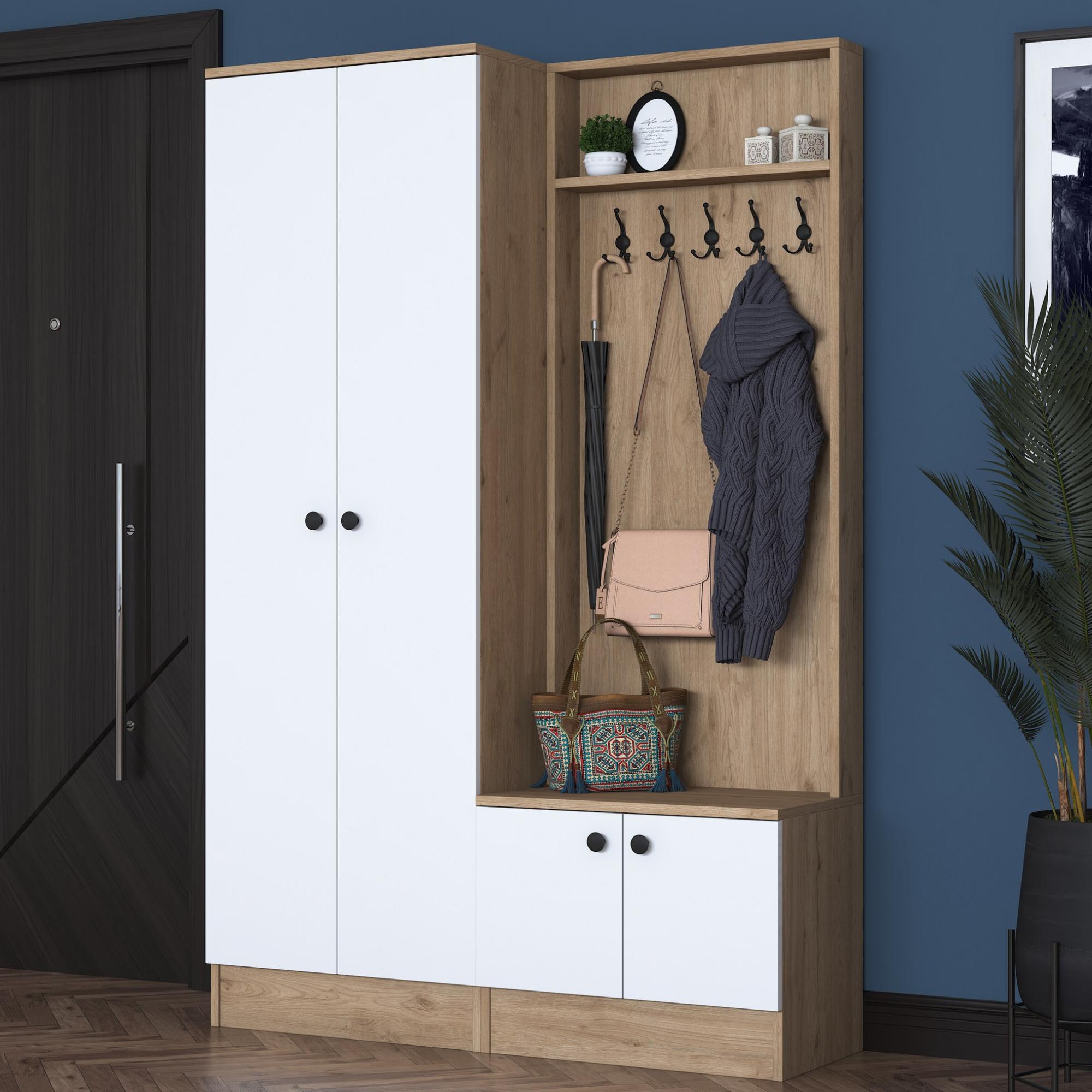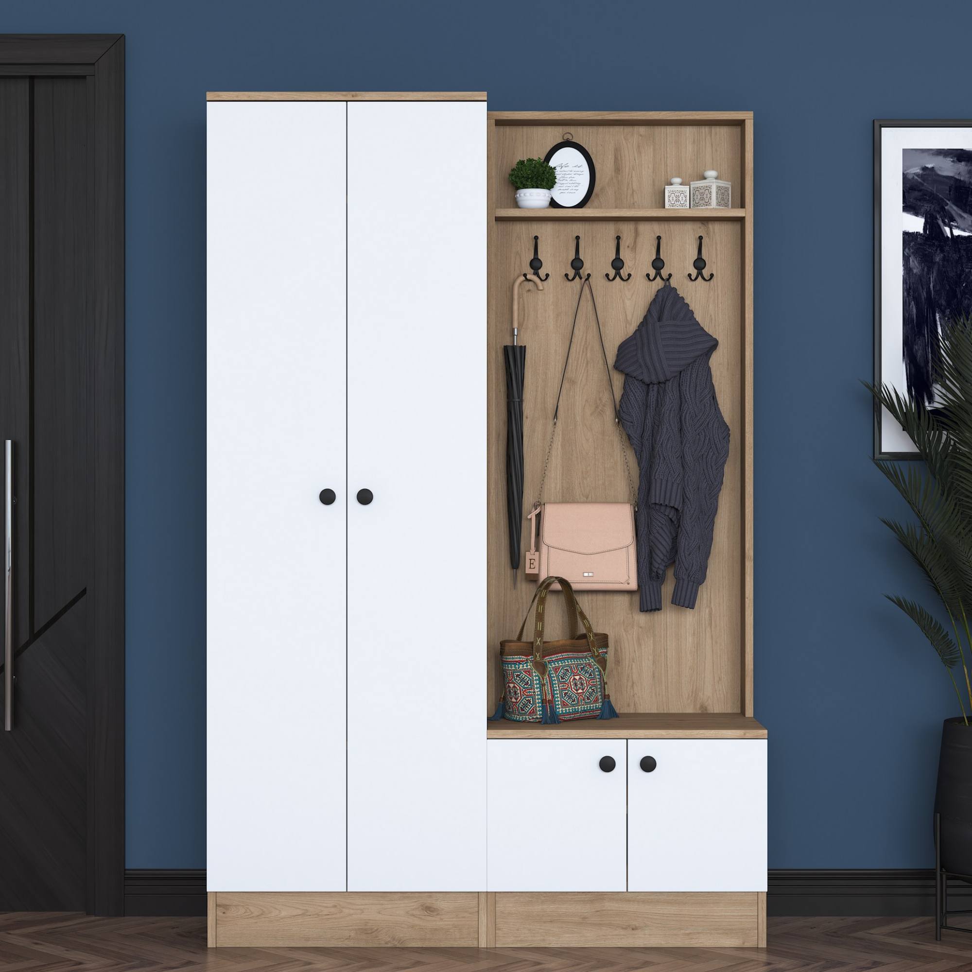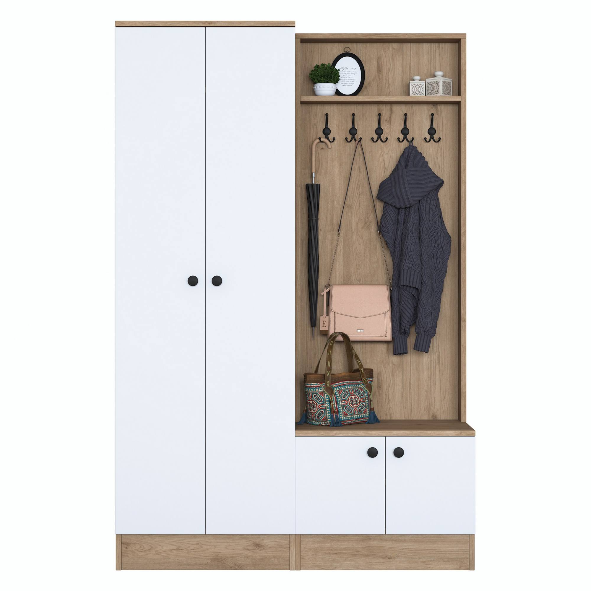 Zostava ponúka dostatok úložného priestoru. Jej súčasťou sú 4 vložené police, z ktorých 3 sa ukrývajú za dvierkami. Aby sa s dvierkami zostavy dobre manipulovalo, sú vybavené rúčkami. Nechýba ani 10 dvojitých háčikov, na ktoré si môžete zavesiť nielen často nosené kabáty či bundy, ale aj rôzne módne doplnky. 5 z týchto háčikov sa nachádza za dvierkami.