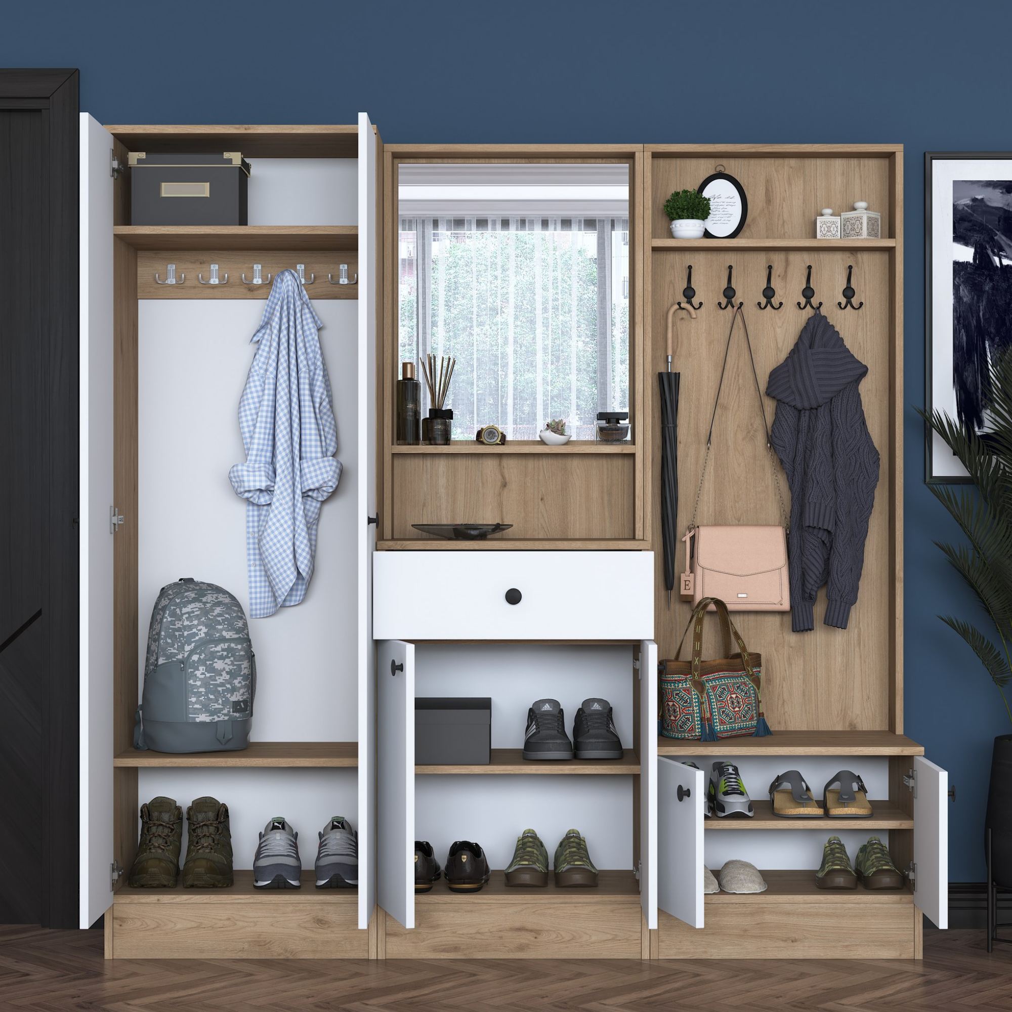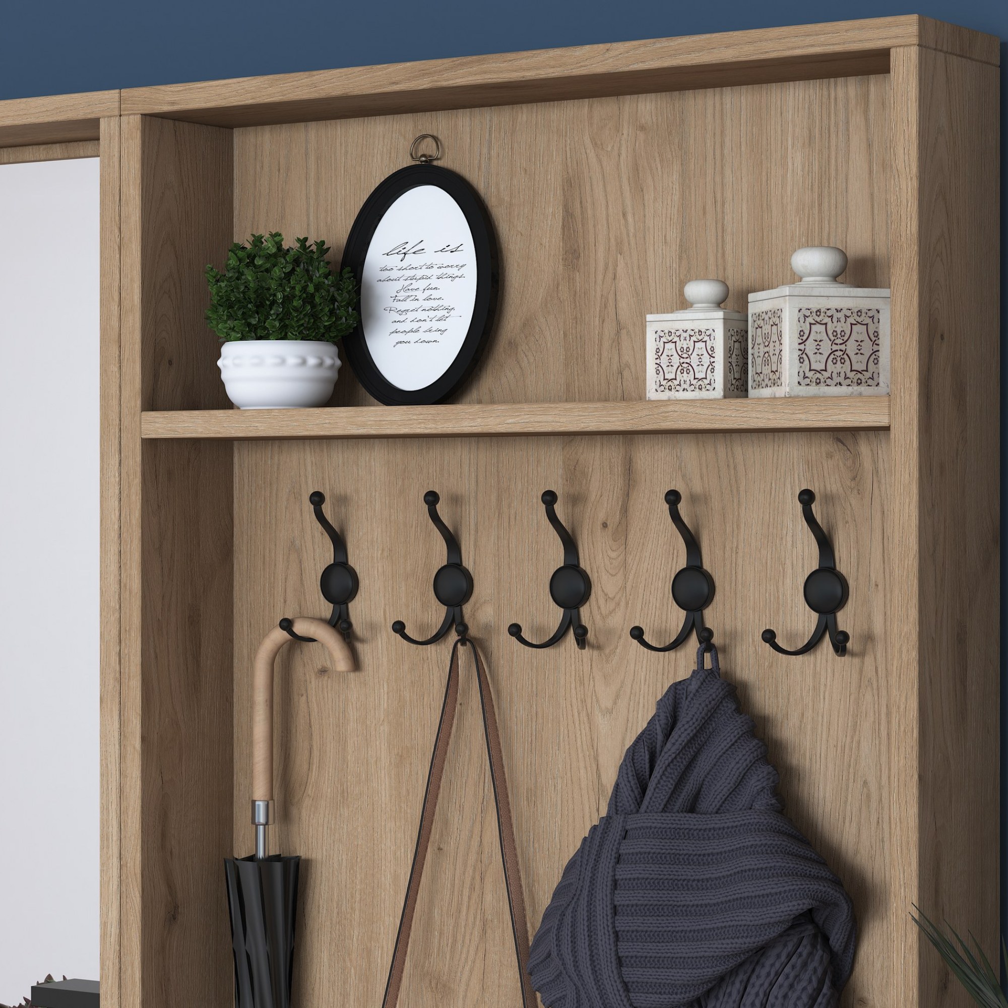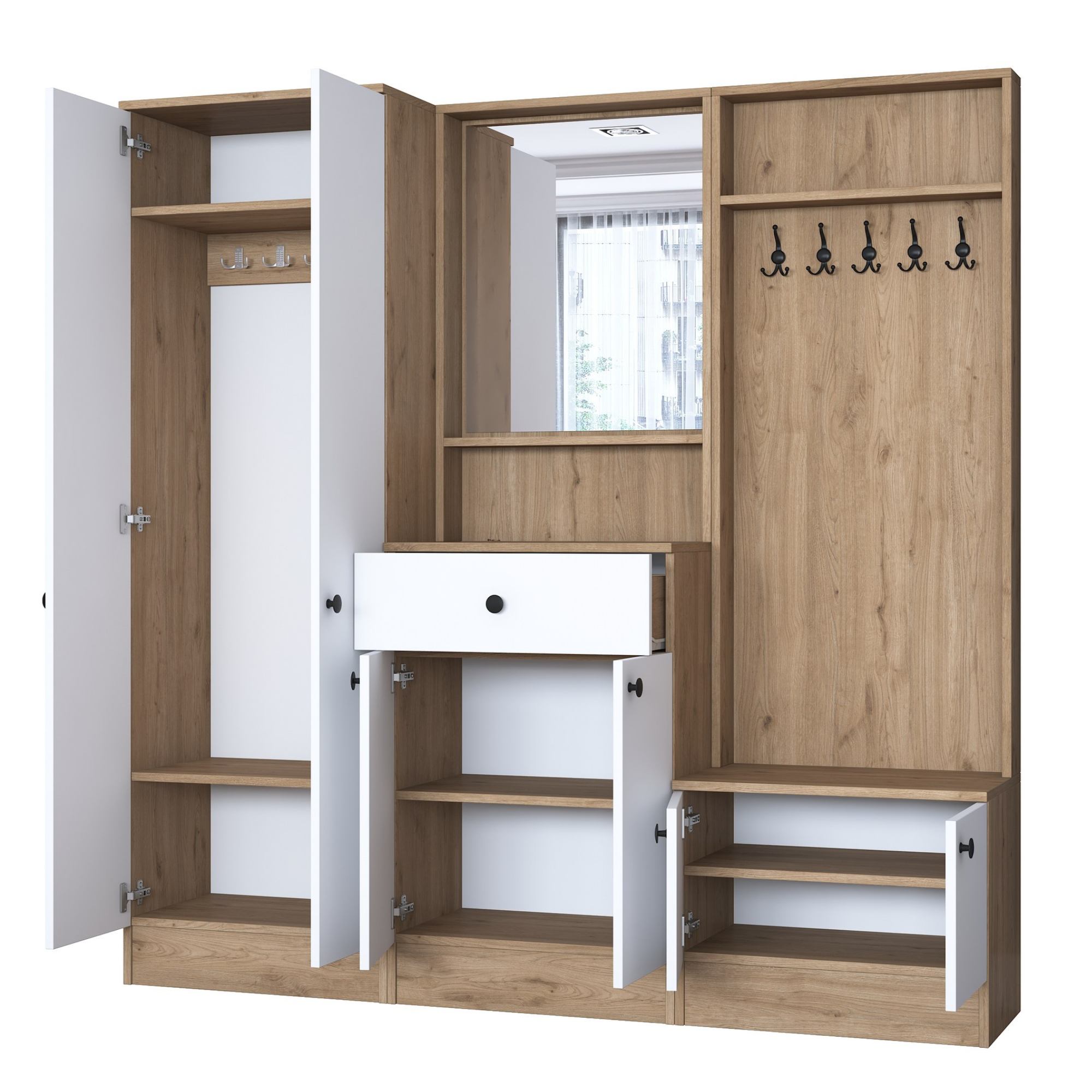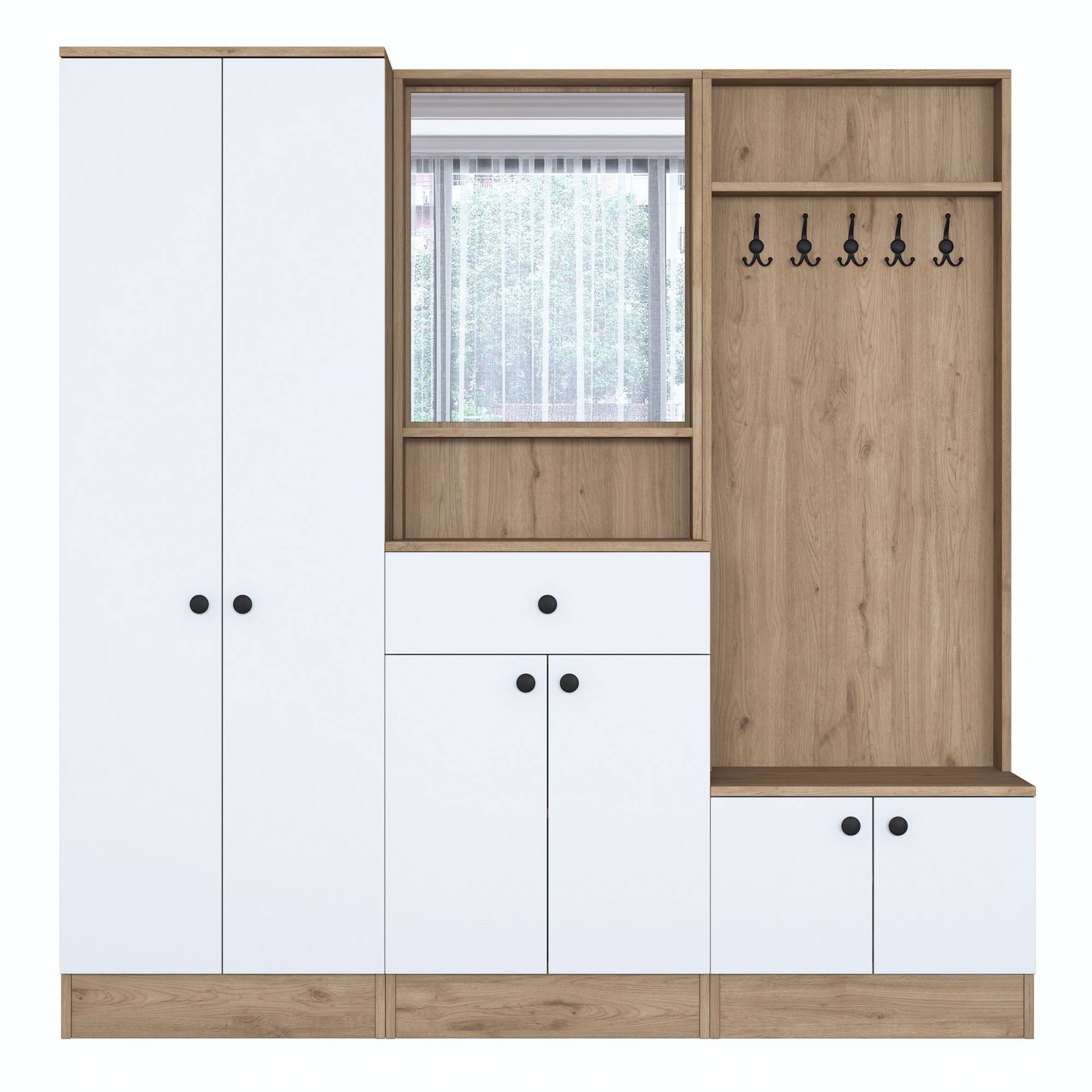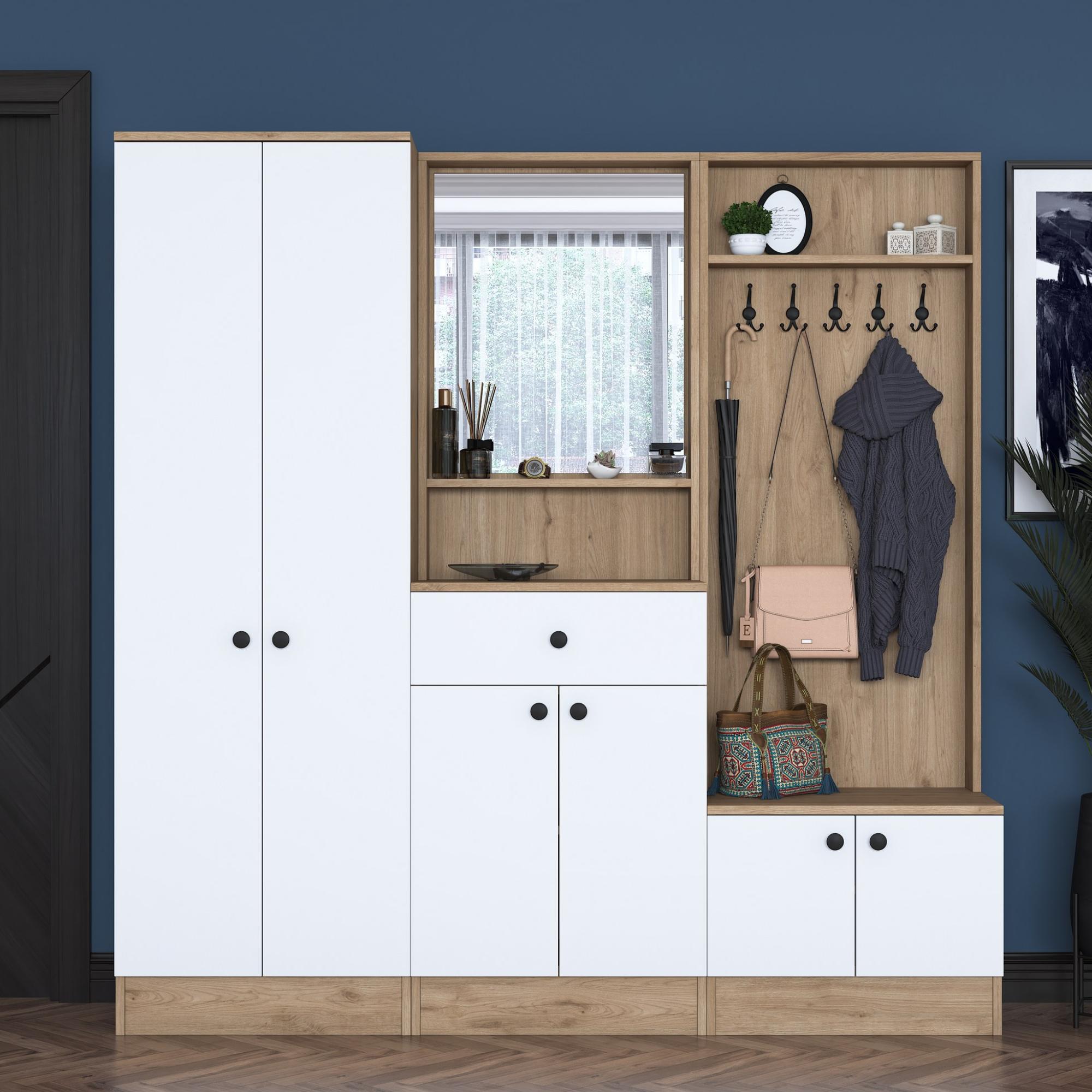 Zostava ponúka dostatok úložného priestoru. Ten zahŕňa 5 vložených políc, z ktorých 4 sa ukrývajú za dvierkami, a 1 zásuvku ideálnu na uloženie drobností. Aby sa s dvierkami a zásuvkou dobre manipulovalo, sú vybavené rúčkami. Nechýba ani 10 dvojitých háčikov, na ktoré si môžete zavesiť nielen často nosené kabáty či bundy, ale aj rôzne módne doplnky. 5 z týchto háčikov sa nachádza za dvierkami. Súčasťou zostavy je aj zrkadlo, v ktorom si môžete vždy pred odchodom z domu skontrolovať váš vzhľad.