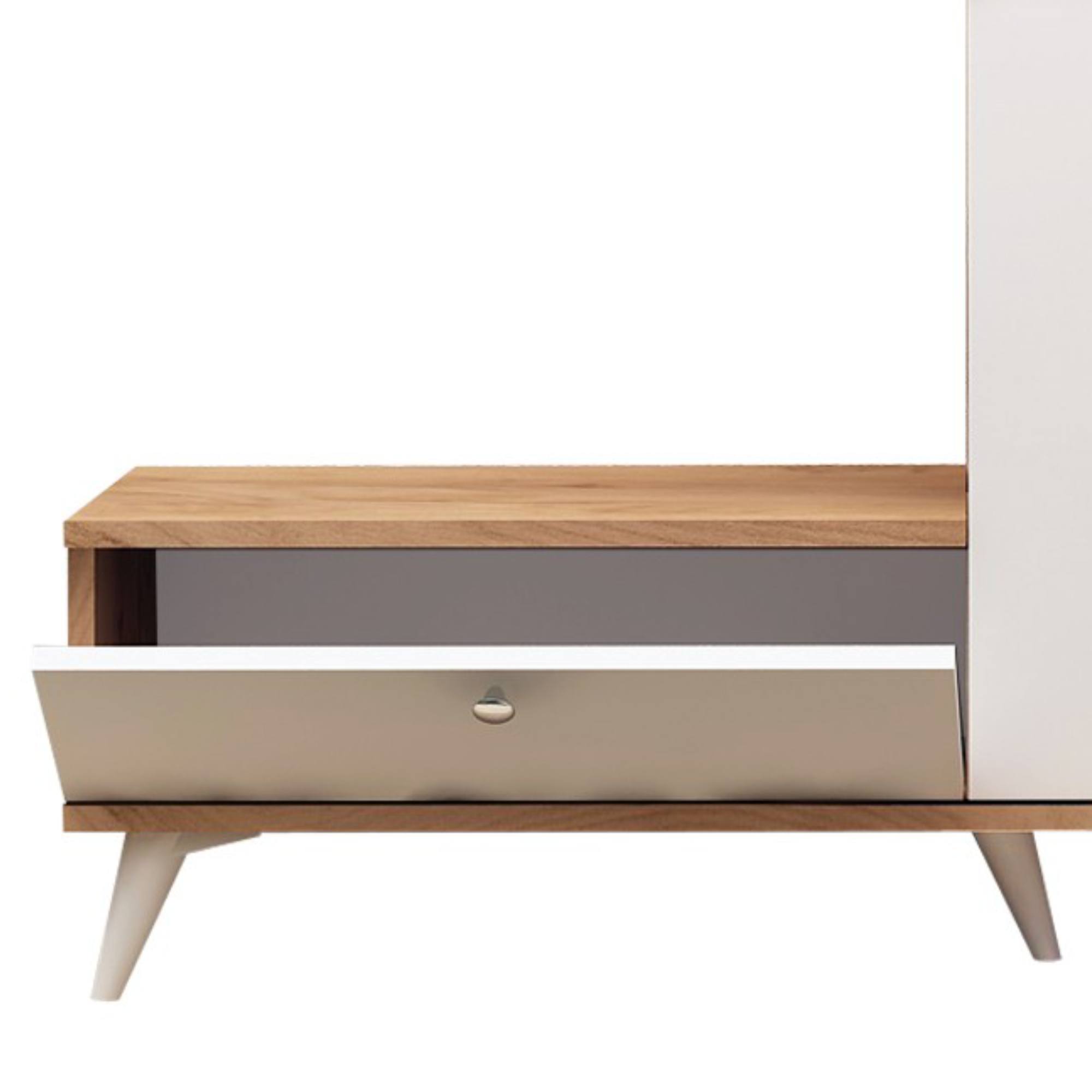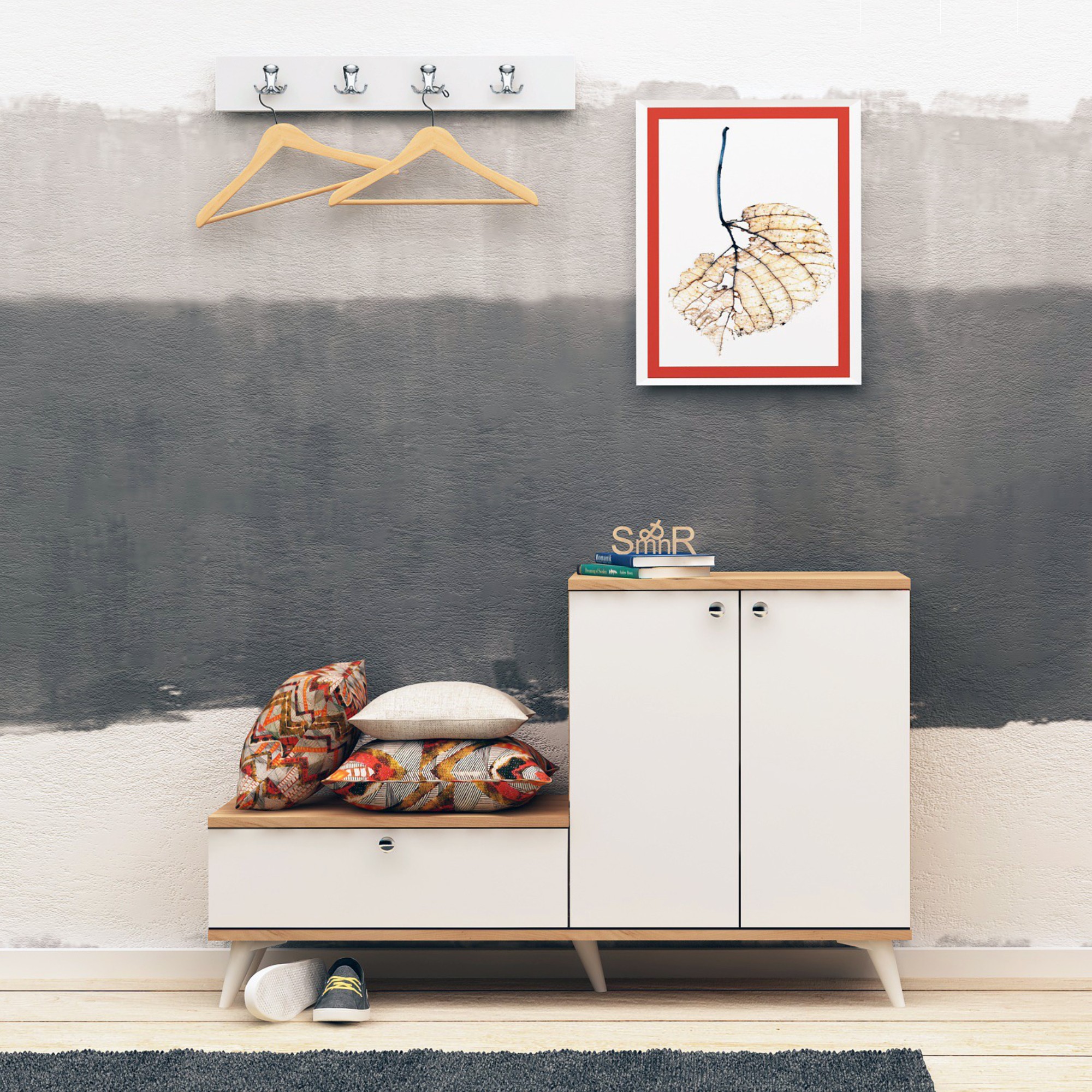 Kombinácia skrinky na topánky/komody, odkladacej lavice a nástenného panelu s dvojitými háčikmi poskytne zázemie nielen odloženým kabátom a topánkam, ale ponúka aj miesto na odloženie kľúčov, kabeliek a iných drobností. Krytý úložný priestor s otočnými dvierkami, delený policami, poskytne miesto niekoľkým párom topánok. Hornú dosku komody môžete využiť na dekoráciu, kvet alebo si tu odložíte nevyhnutné drobnosti a doplnky, ktoré potrebujete mať pri odchode z domu hneď po ruke. Lavicu môžete využiť na odloženie tašiek, kľúčov, kabelky či neroztriedenej došlej pošty. Za výklopnými dvierkami je k dispozícii ďalší odkladací priestor, ktorý je možné využiť napríklad na prípravky na ošetrenie obuvi. Dvojité háčiky vešiaka zase unesú váhu plných vreciek odloženej bundy alebo kabátu.