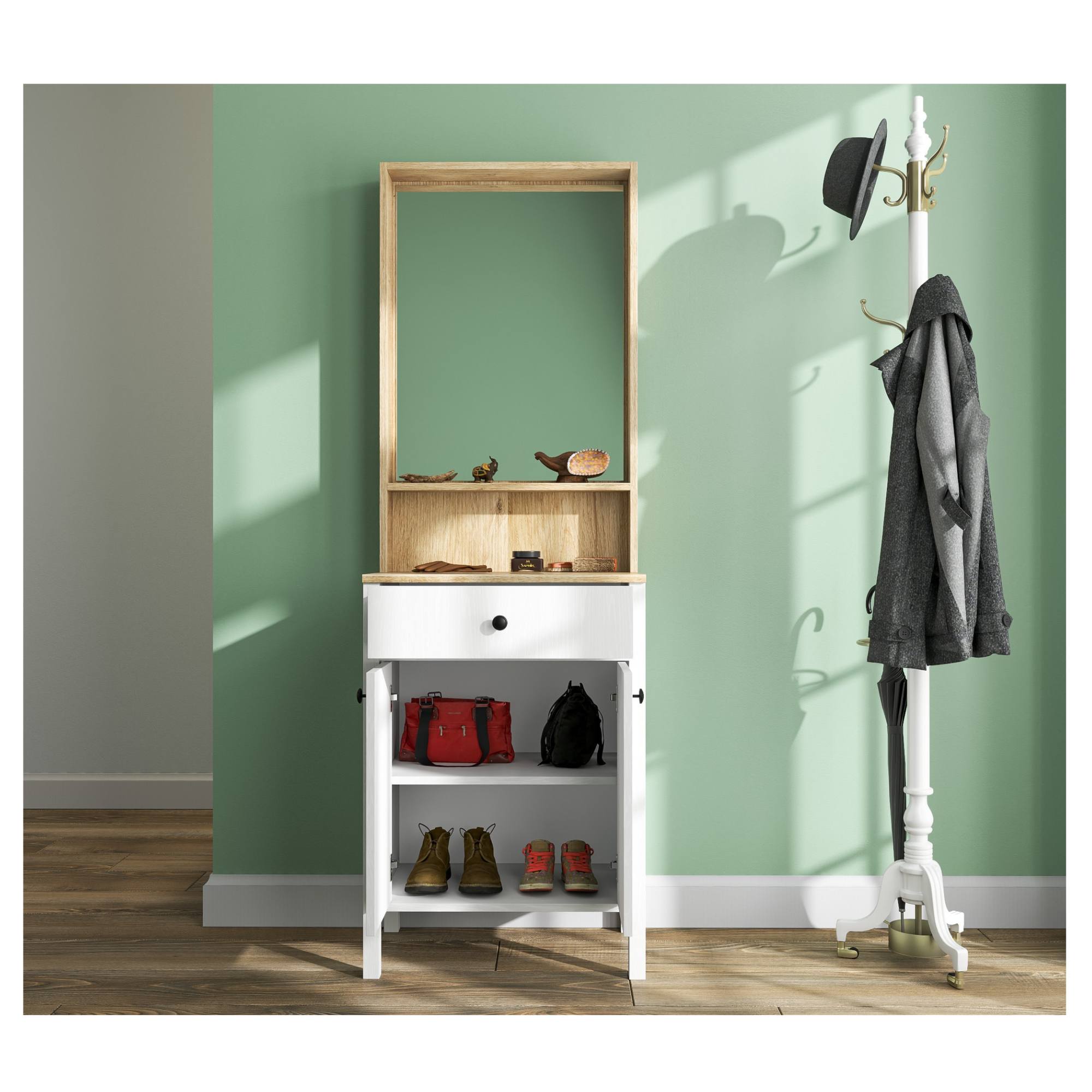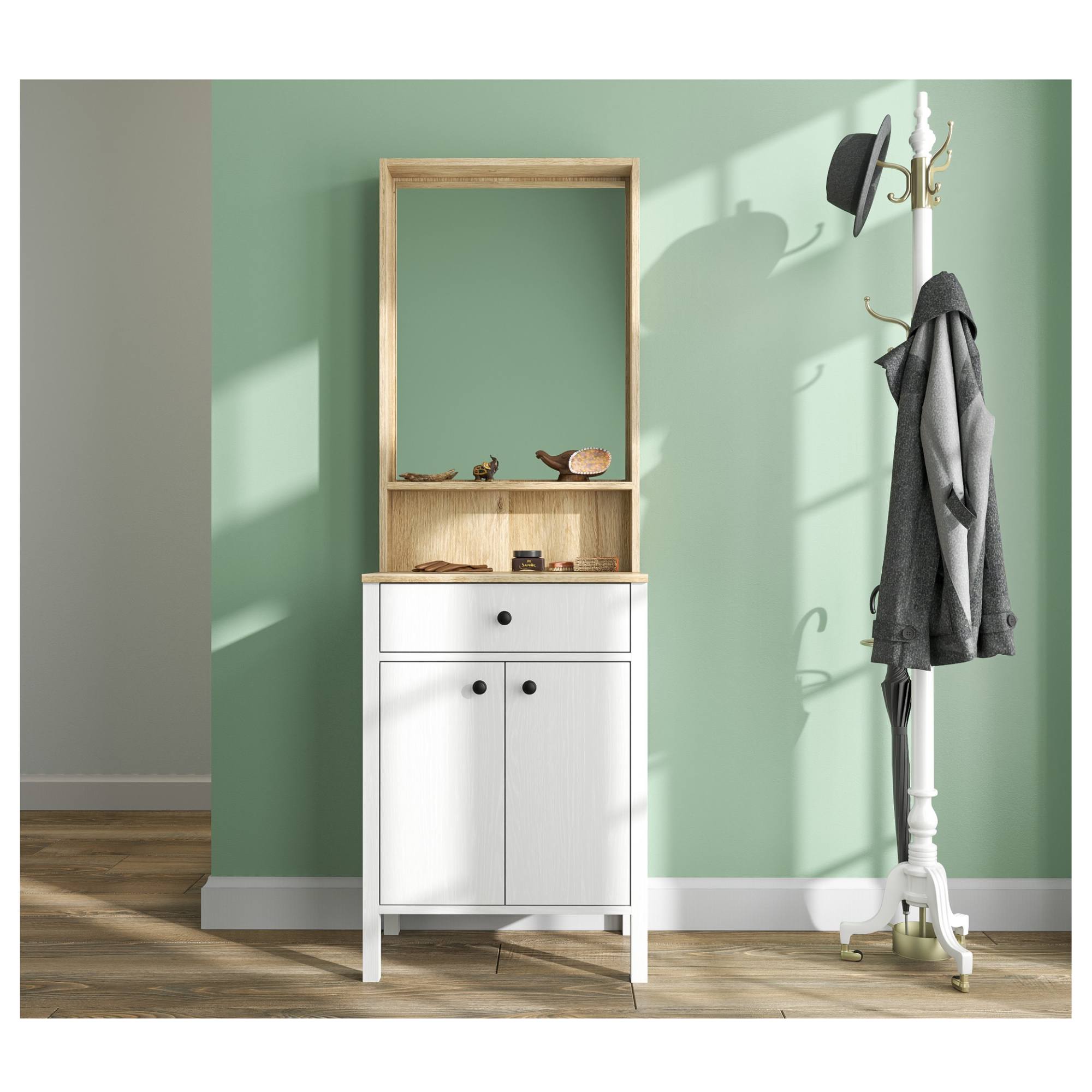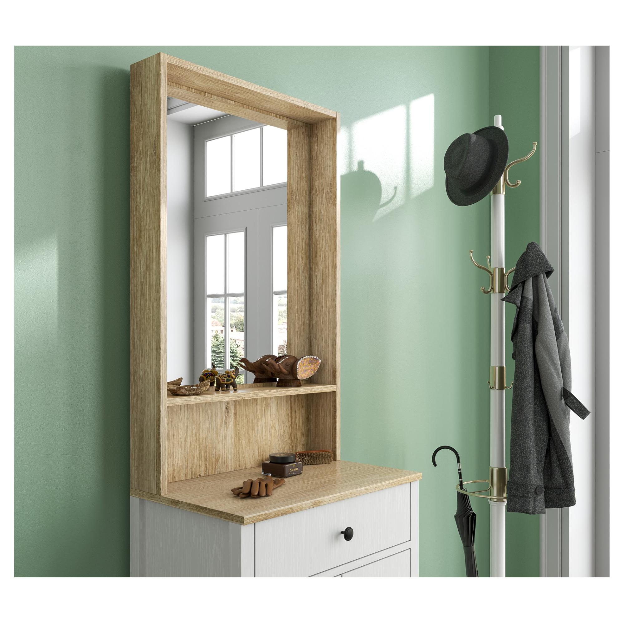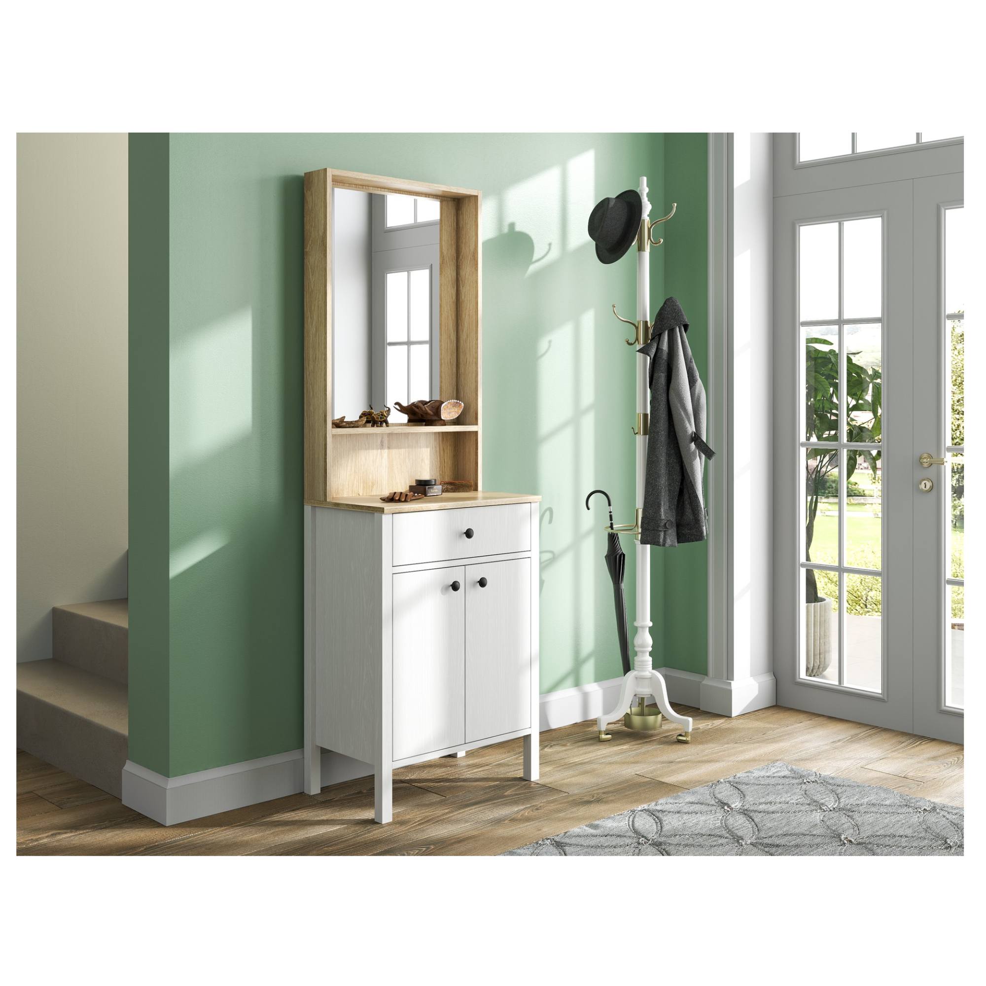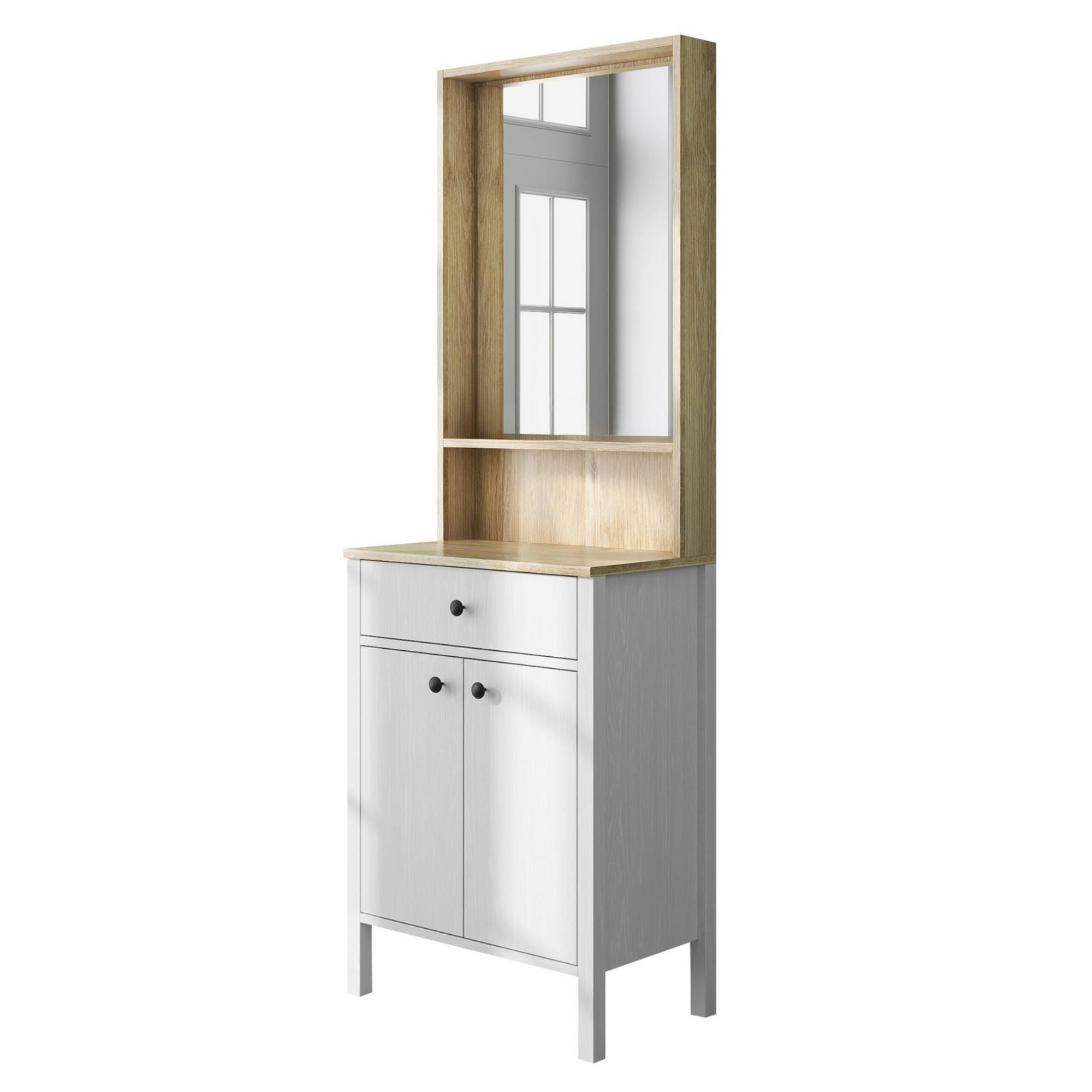 Pokiaľ ide o úložný priestor, ponúka zostava 2 vložené police, z ktorých 1 je umiestnená za dvierkami, a 1 zásuvku. Pre lepšiu manipuláciu sú dvierka vybavené kovovými rúčkami. Nechýba ani zrkadlo, v ktorom si môžete vždy pred odchodom z domu skontrolovať váš vzhľad.