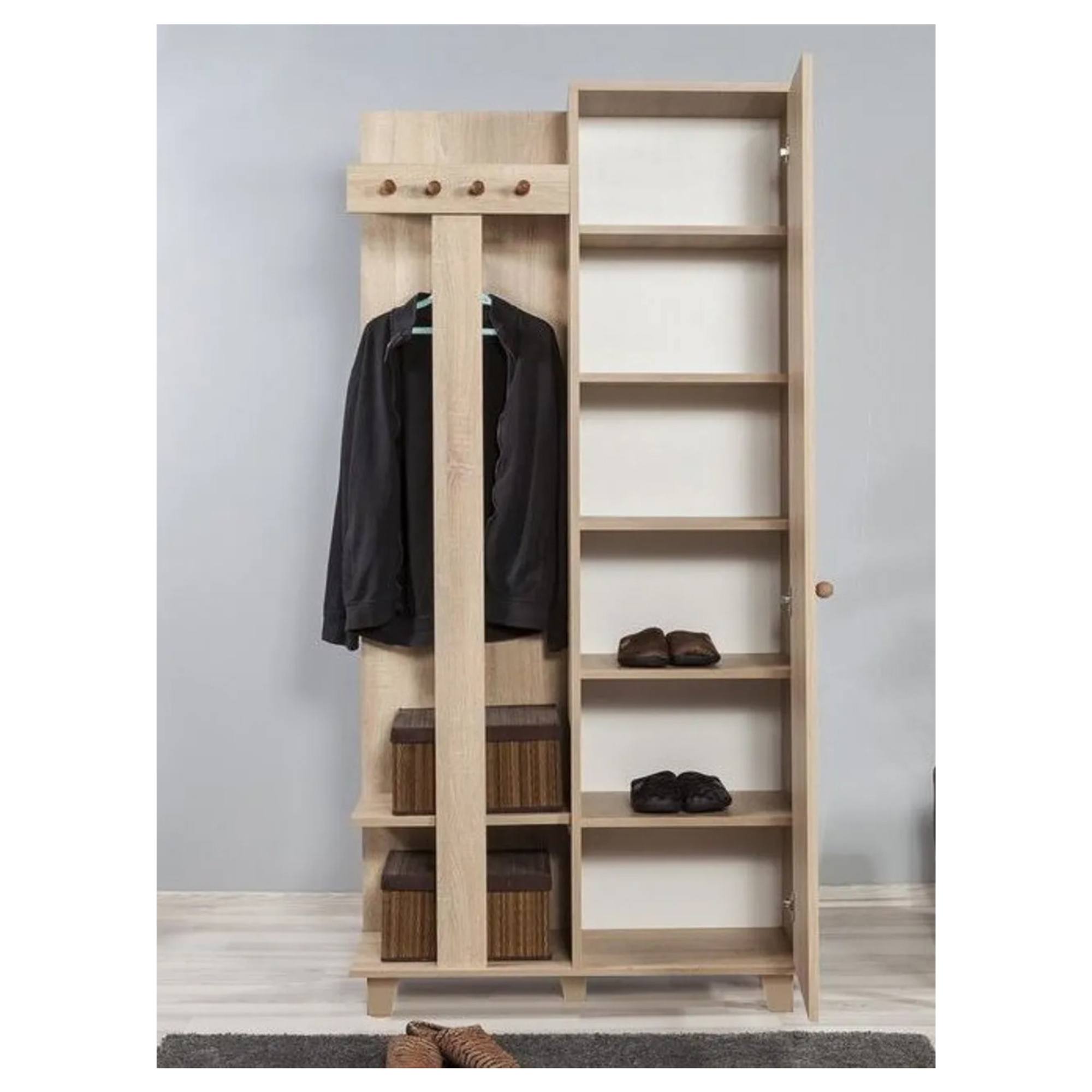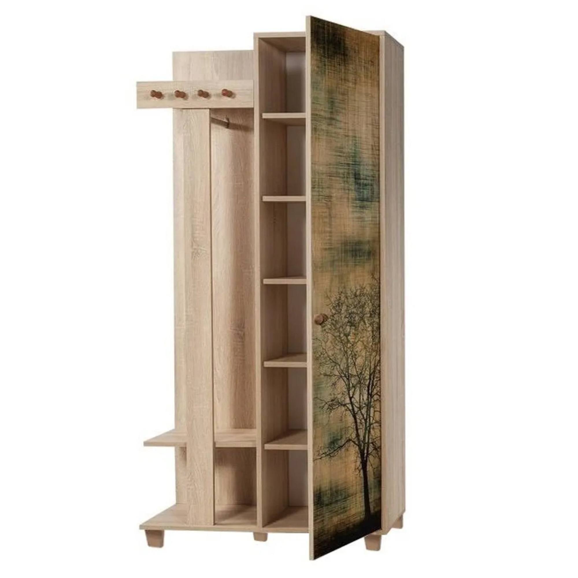 Okrem vzhľadu vás táto zostava poteší aj dostatkom úložného priestoru. Jej súčasťou je 6 vložených políc, z ktorých 5 je umiestnených za dvierkami. Aby sa s dvierkami lepšie manipulovalo, sú vybavené rúčkou. Zostava ďalej disponuje 4 háčikmi a 1 šatníkovou tyčou.