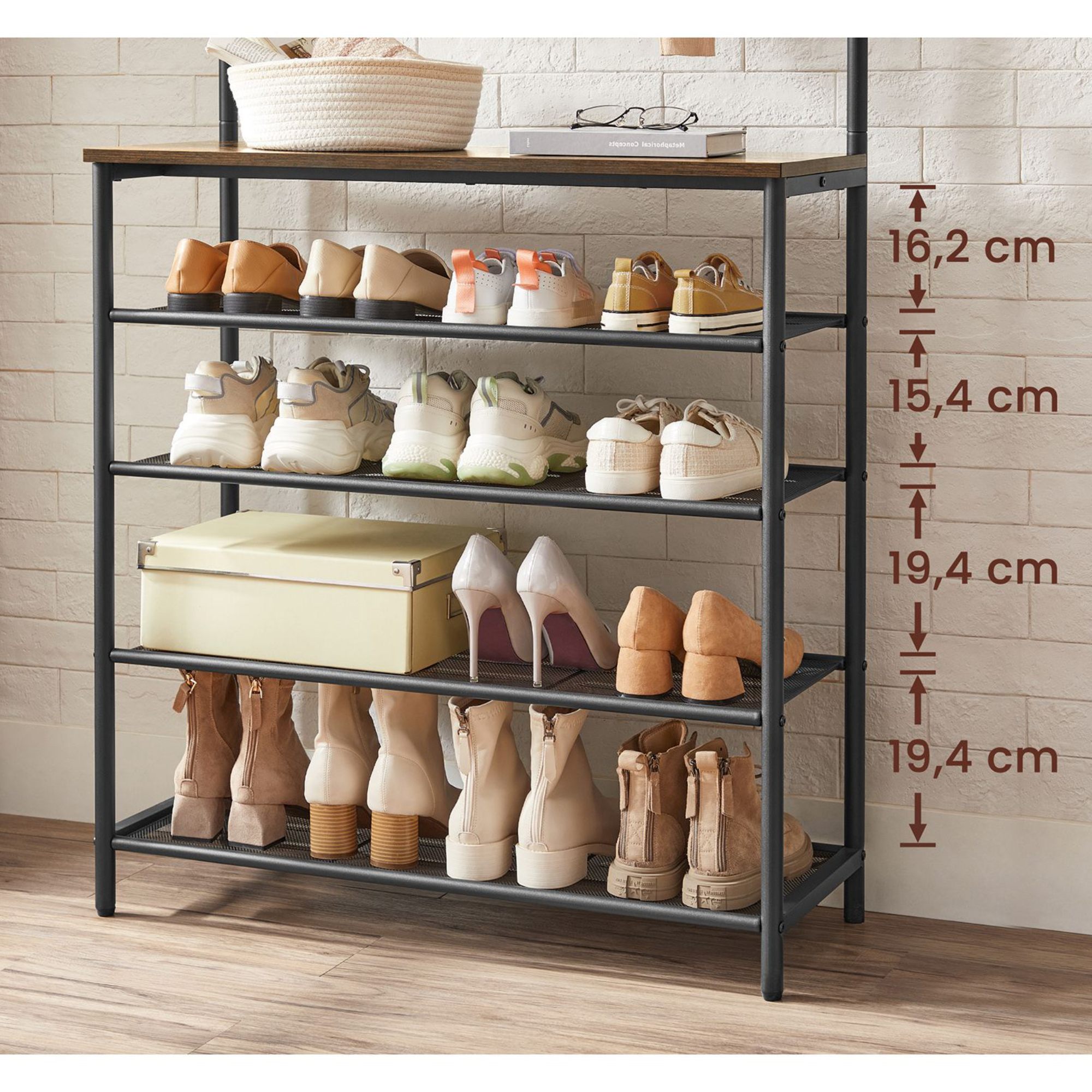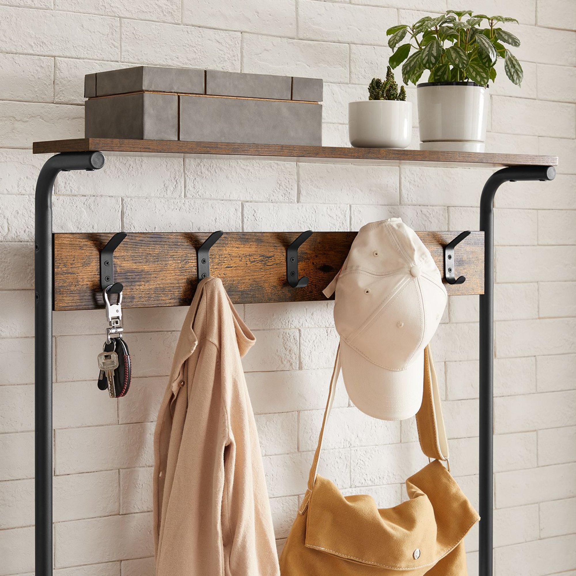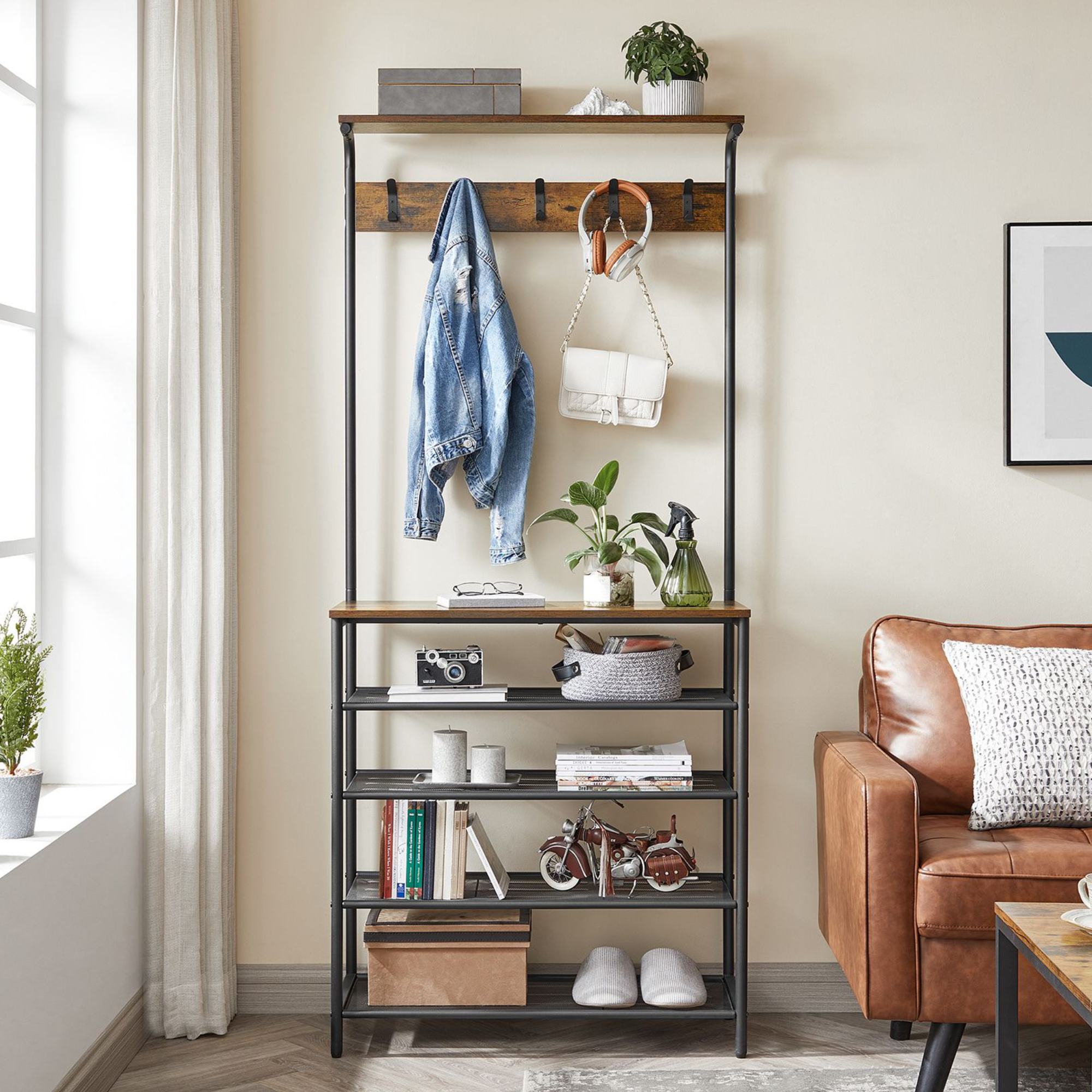 Stabilná kovová konštrukcia v kombinácii s panelmi v dekore dreva tvorí jedinečný kus nábytku v industriálnom duchu. Police poskytnú miesto na všetku vašu obuv. Vešiakové háčiky bez problémov unesú plné vrecká, šatiek a iného oblečenia.