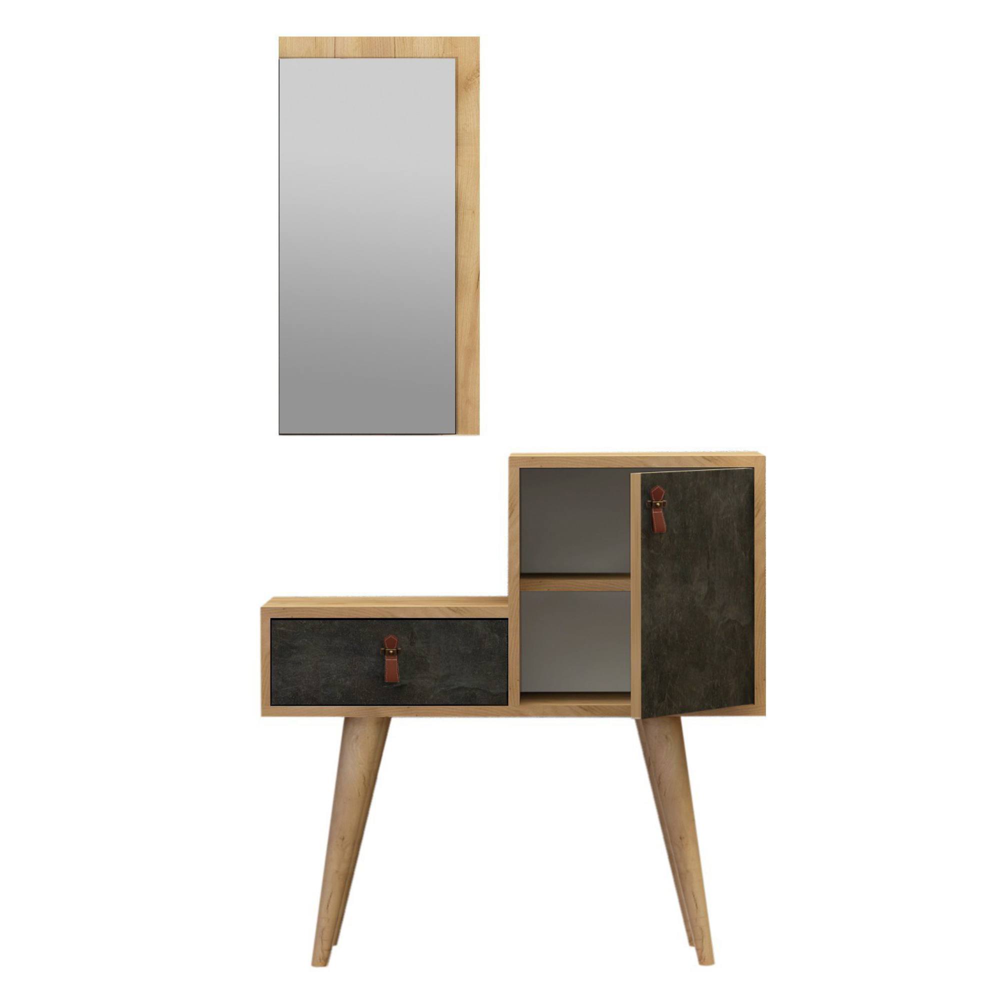 Skrinka ponúka dostatok úložného priestoru. Jej súčasťou je nielen 1 vložená polica, ale aj 1 zásuvka. Aby sa s dvierkami aj zásuvkou dobre manipulovalo, sú vybavené rúčkami zo syntetickej kože. Skrinka má vysoké nohy, ktoré uľahčujú upratovanie pod ňou. Zrkadlo vám zas umožní vždy pred odchodom z domu skontrolovať váš vzhľad.