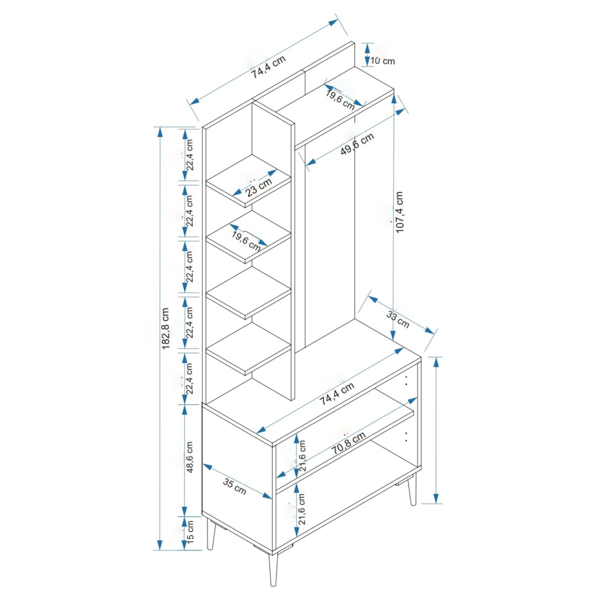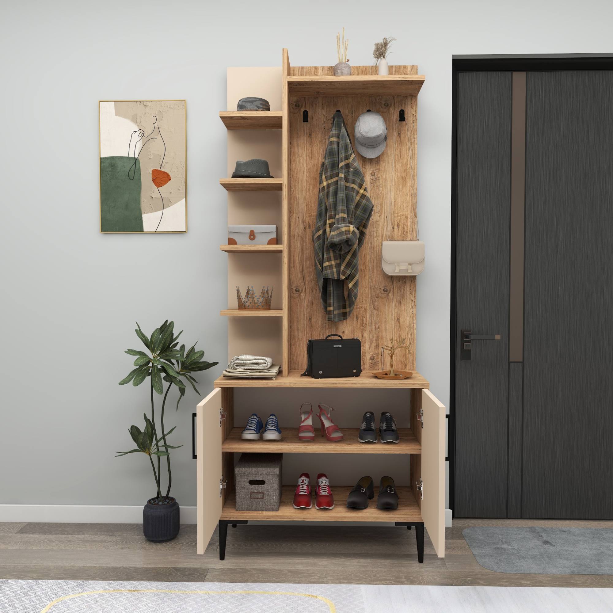 Zostava ponúka dostatok úložného priestoru. Jej súčasťou je 6 vložených políc, z ktorých 1 je ukrytá za otočnými dvierkami. Aby sa s týmito dvierkami dobre manipulovalo, sú vybavené rúčkami. Nechýbajú ani 4 háčiky, na ktoré si môžete zavesiť nielen často nosené kabáty či bundy, ale aj rôzne módne doplnky. Zostava má vysoké nohy, ktoré uľahčujú upratovanie pod ňou.