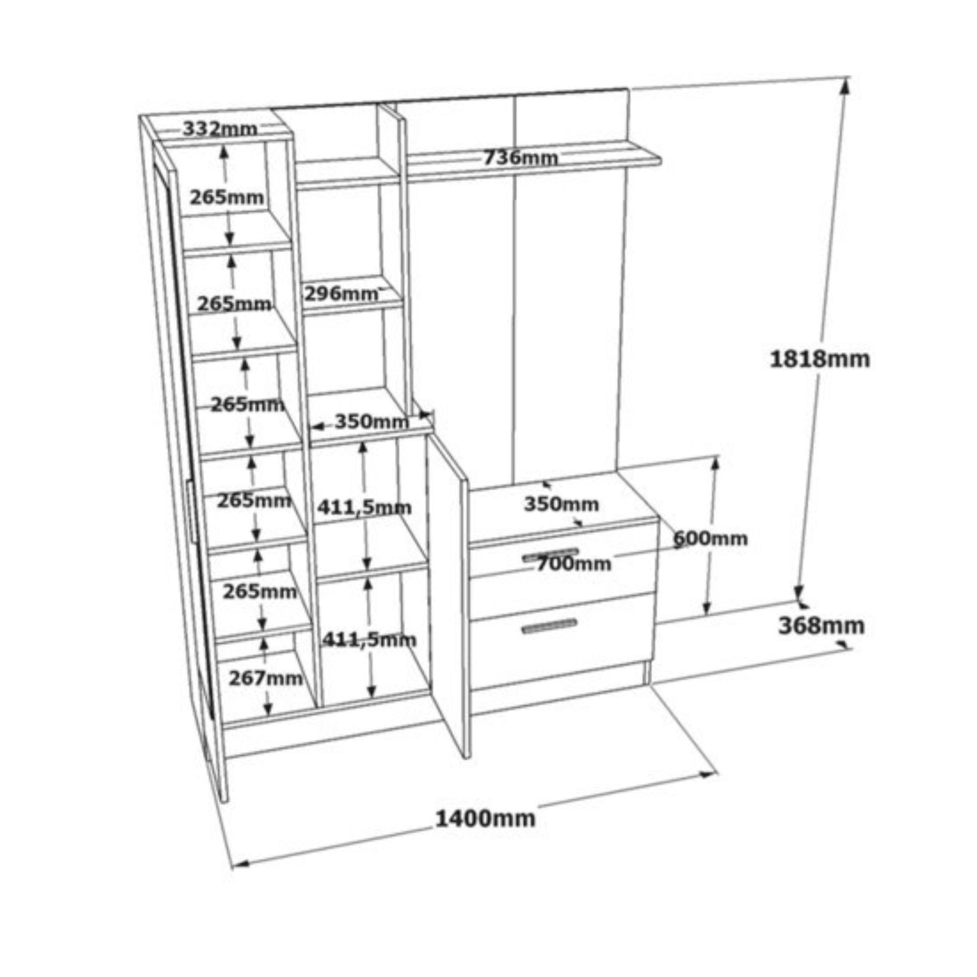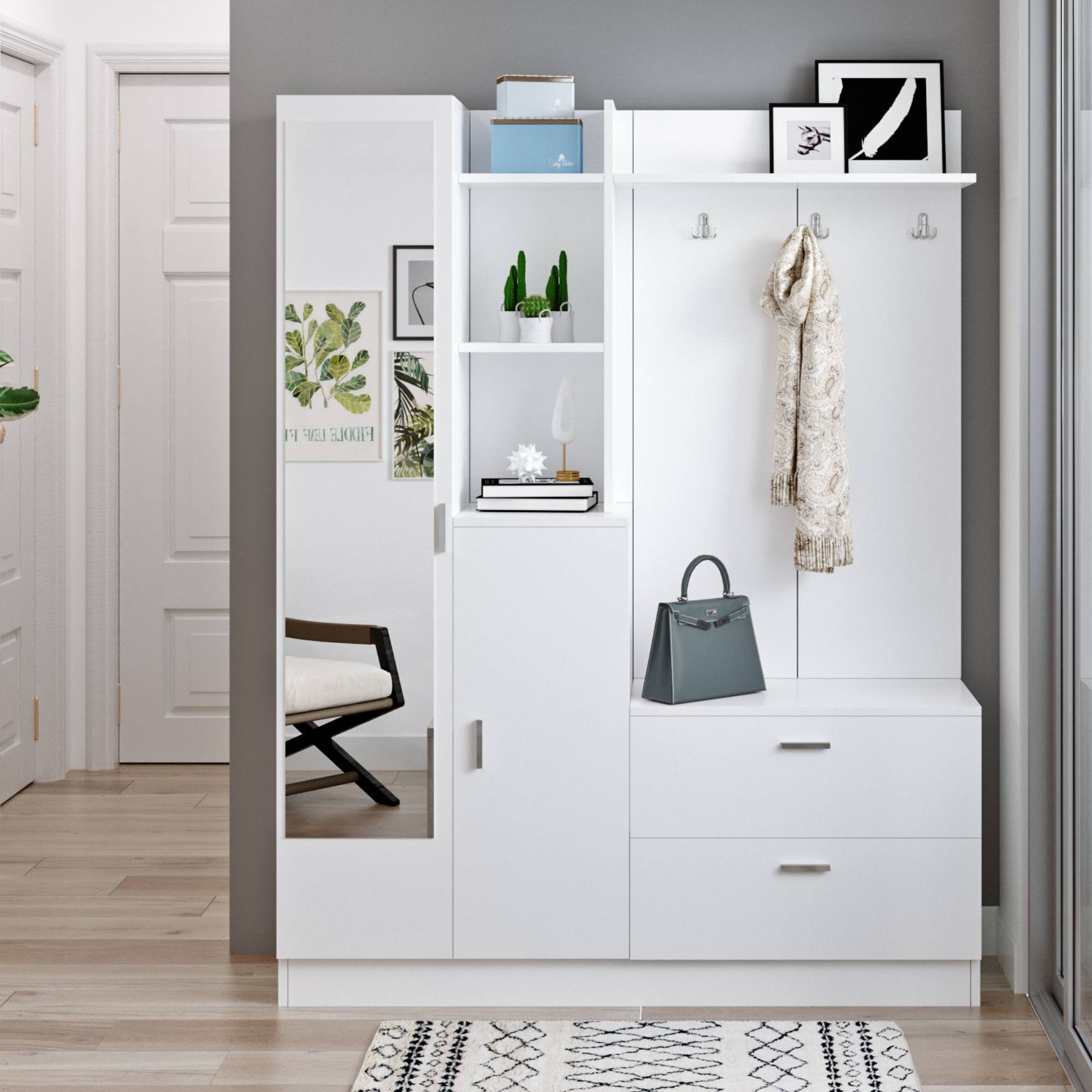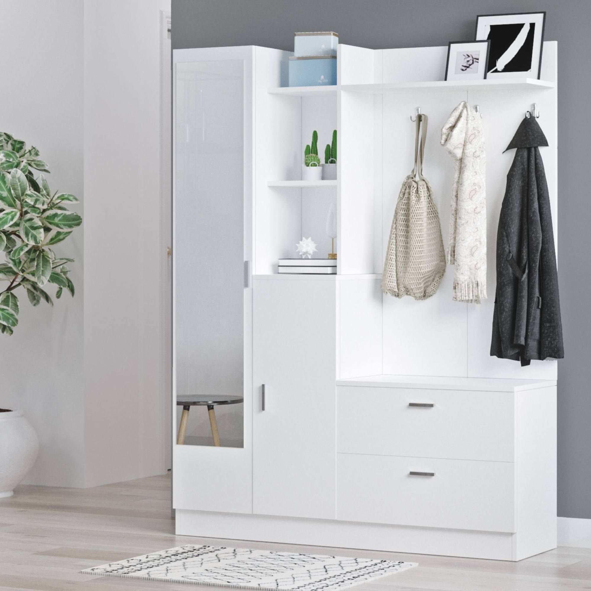 Zostava ponúka dostatok úložného priestoru. Je vybavená nielen 10 policami, ale aj 3 dvojitými háčikmi. Nechýba ani zrkadlo, v ktorom si môžete pred odchodom z domu skontrolovať váš vzhľad. Aby sa s dvierkami zostavy ľahšie manipulovalo, je vybavená praktickými rúčkami.