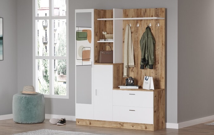 Zostava ponúka dostatok úložného priestoru. Je vybavená nielen 8 policami, ale aj 4 dvojitými háčikmi. Nechýba ani zrkadlo, v ktorom si môžete pred odchodom z domu skontrolovať váš vzhľad. Aby sa s dvierkami zostavy ľahšie manipulovalo, je vybavená praktickými rúčkami.