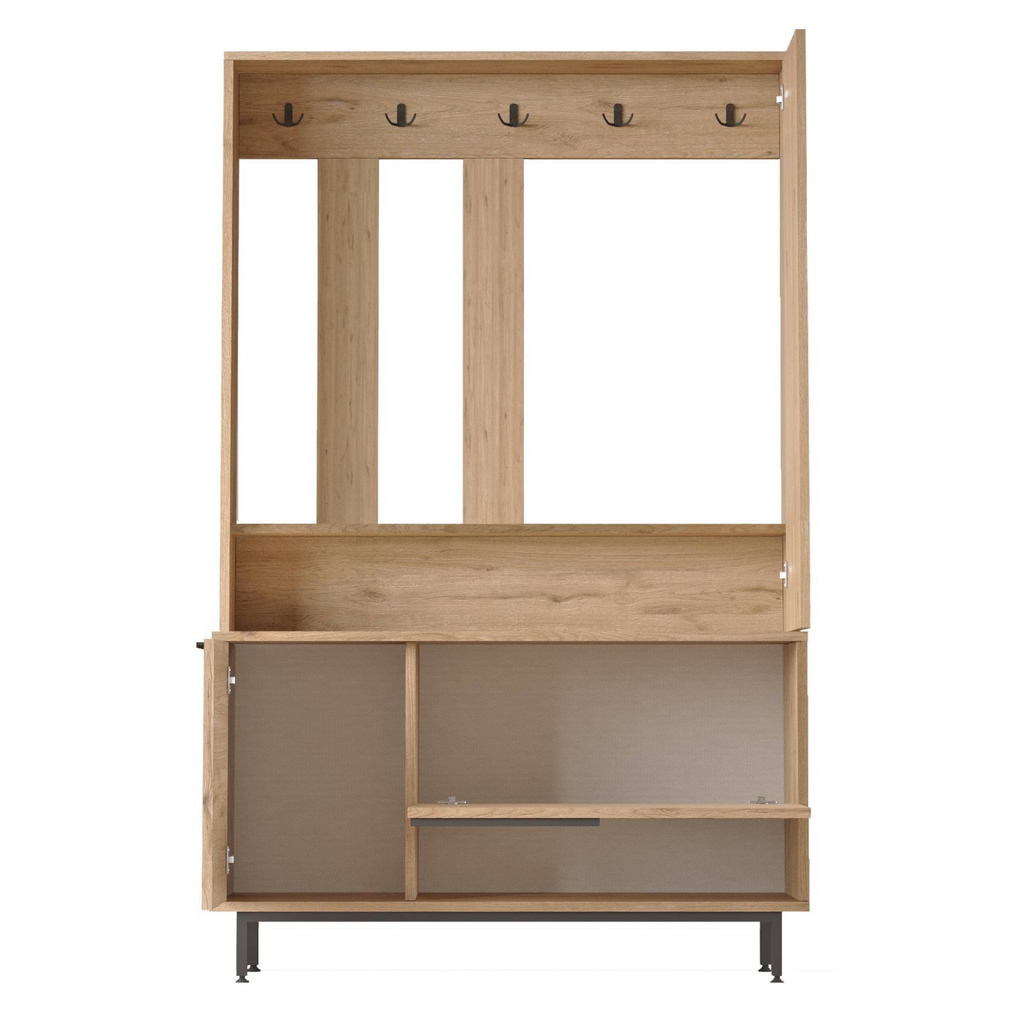 Zostava poskytuje dostatok úložného priestoru, čím vám pomôže udržať poriadok a organizáciu. Okrem otvorených častí obsahuje aj päť praktických háčikov, na ktoré si môžete zavesiť kabáty, bundy, kabelky či módne doplnky. V hornej časti na pravej strane sa nachádzajú 1 otočné dvierka s praktickým zrkadlom, ktoré vám uľahčia každodennú úpravu zovňajšku.