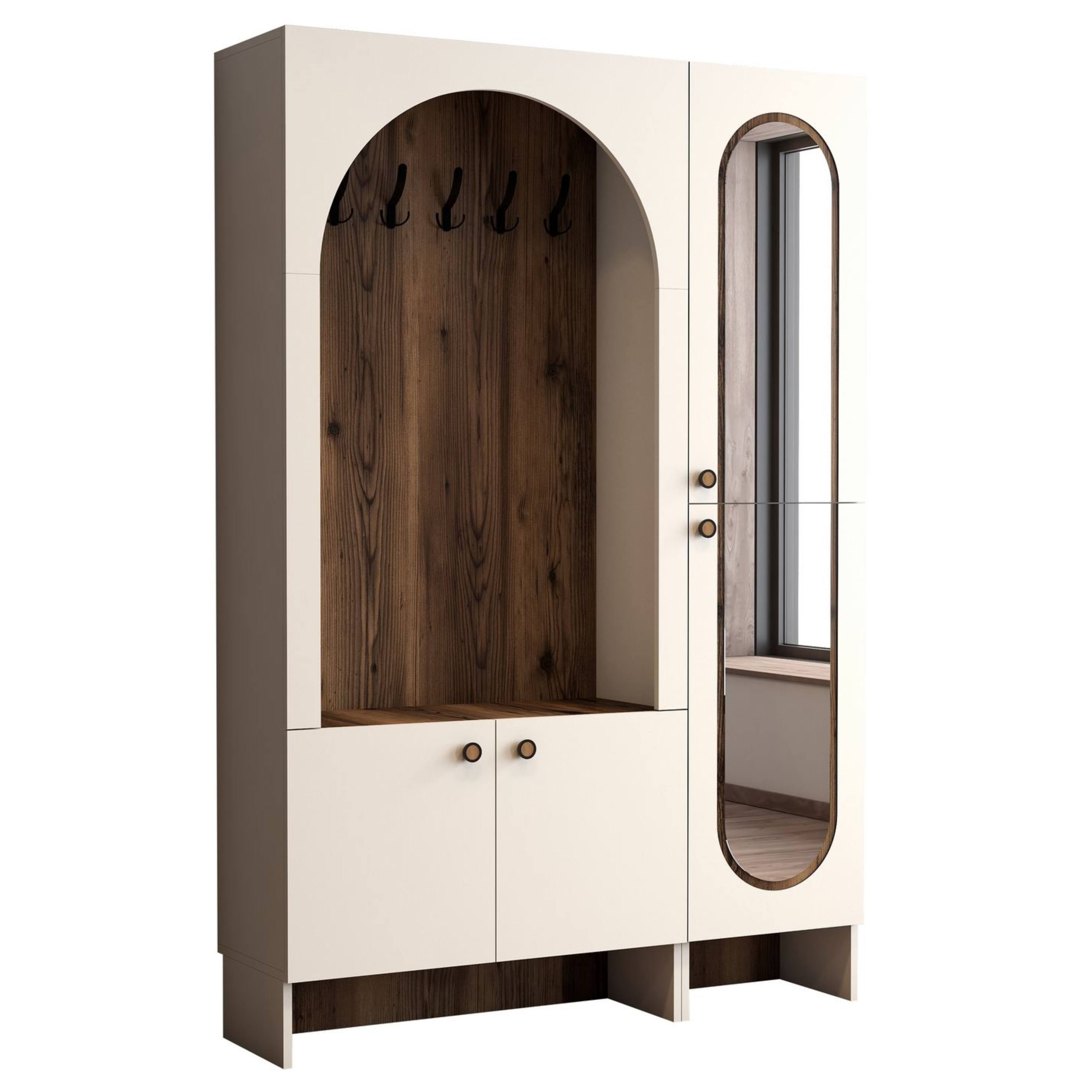 Zostava ponúka otvorený priestor s kontrastným atraktívnym dekorom, v ktorom je umiestnených 6 dvojitých háčikov na prehľadné zavesenie kabátov, búnd či doplnkov. Nechýba ani odkladacia plocha na drobnosti, ktoré chcete mať vždy poruke. V spodnej časti sa nachádza uzatvárateľný úložný priestor s otočnými dverami a praktickými úchytkami. Vnútorný priestor je vybavený vloženou policou, ktorá umožňuje prehľadné usporiadanie obuvi a ďalších predmetov. Uzatvárateľná policová časť na pravej strane je potom vybavená zrkadlovými otočnými dverami.