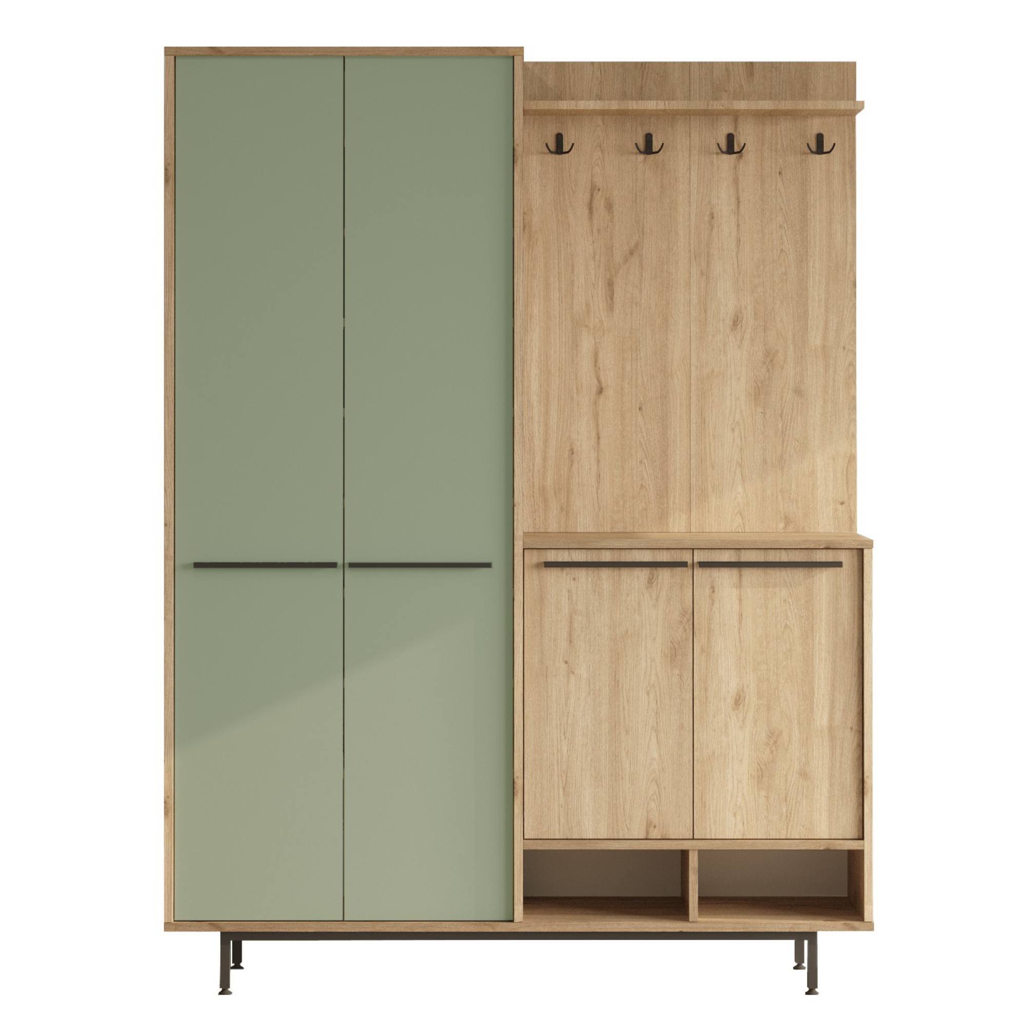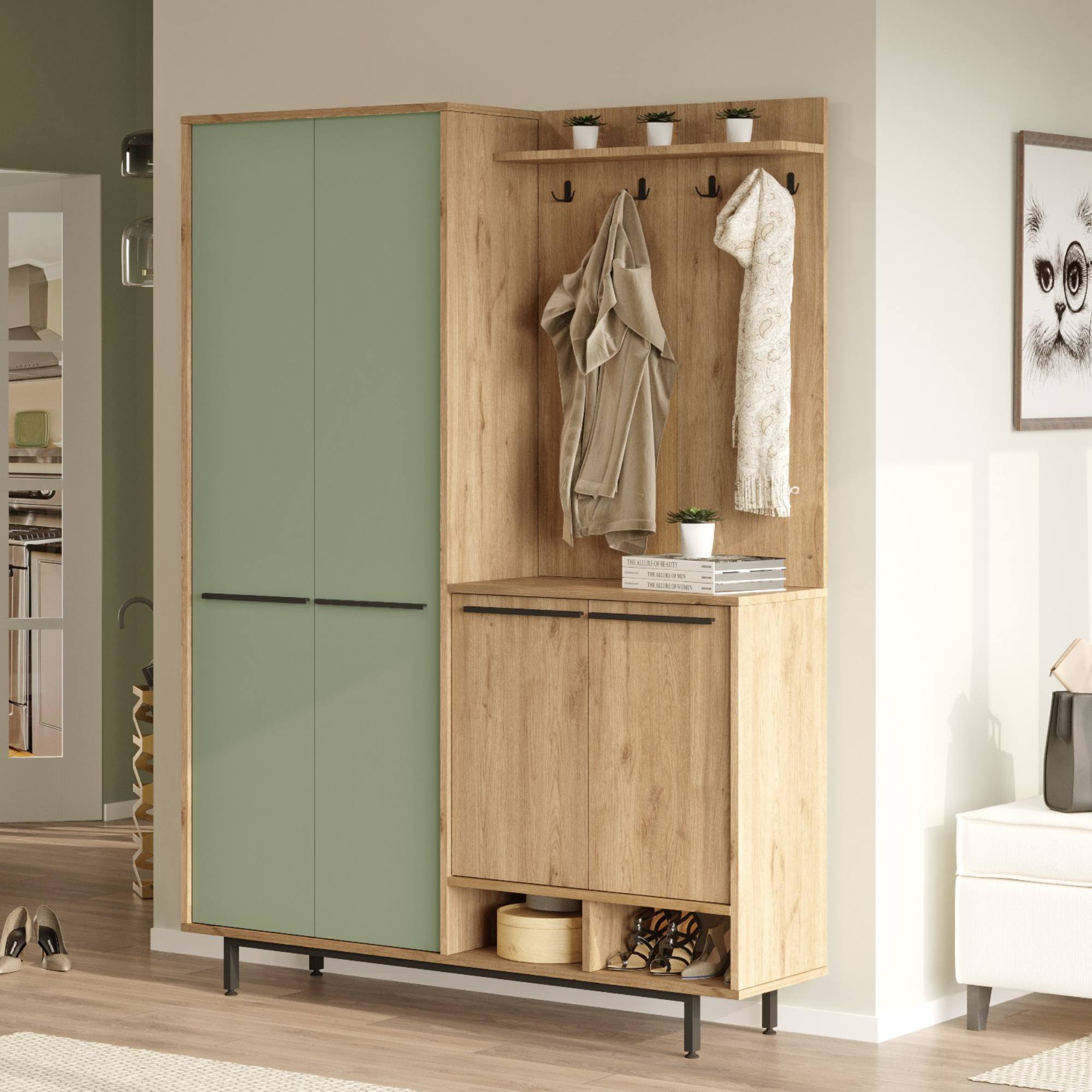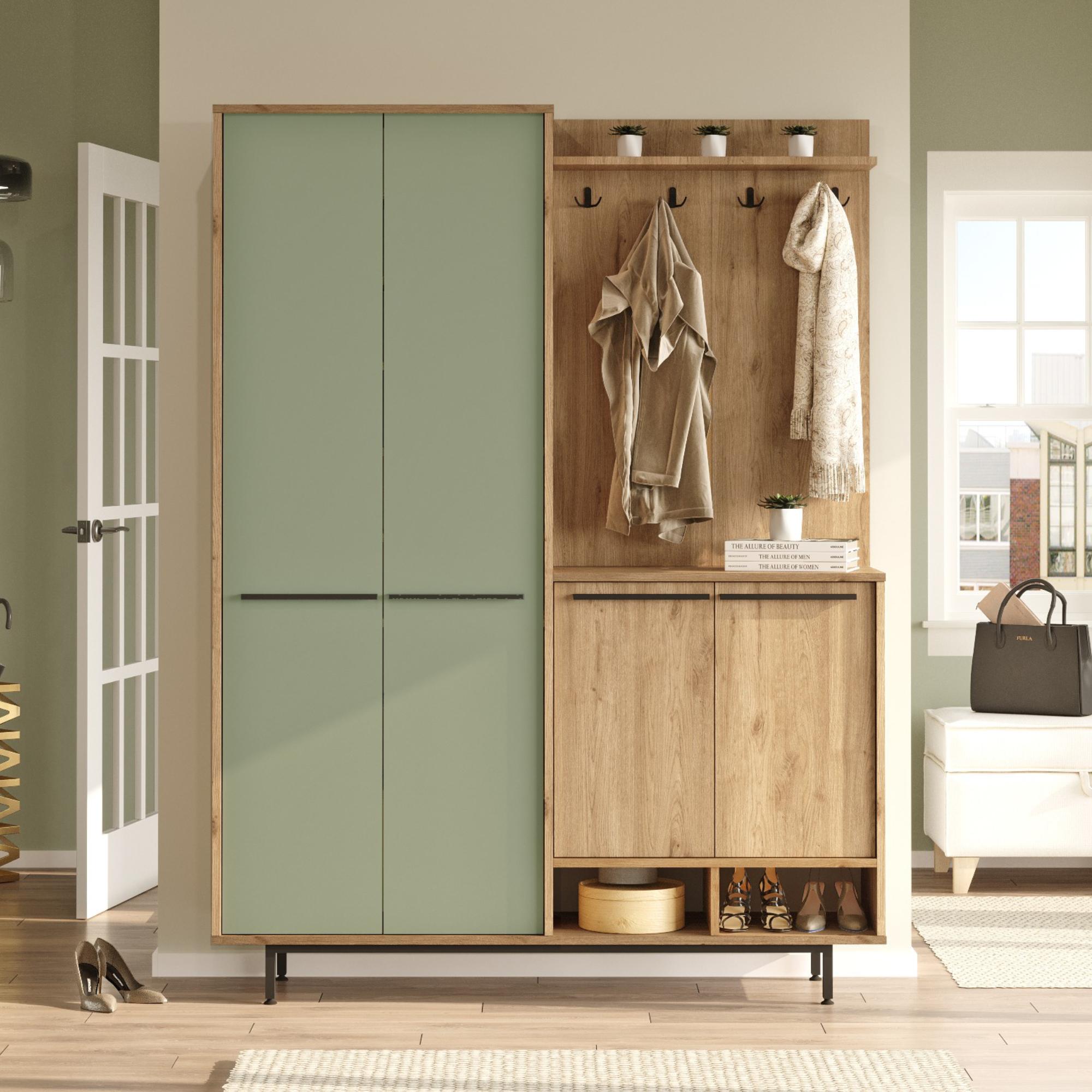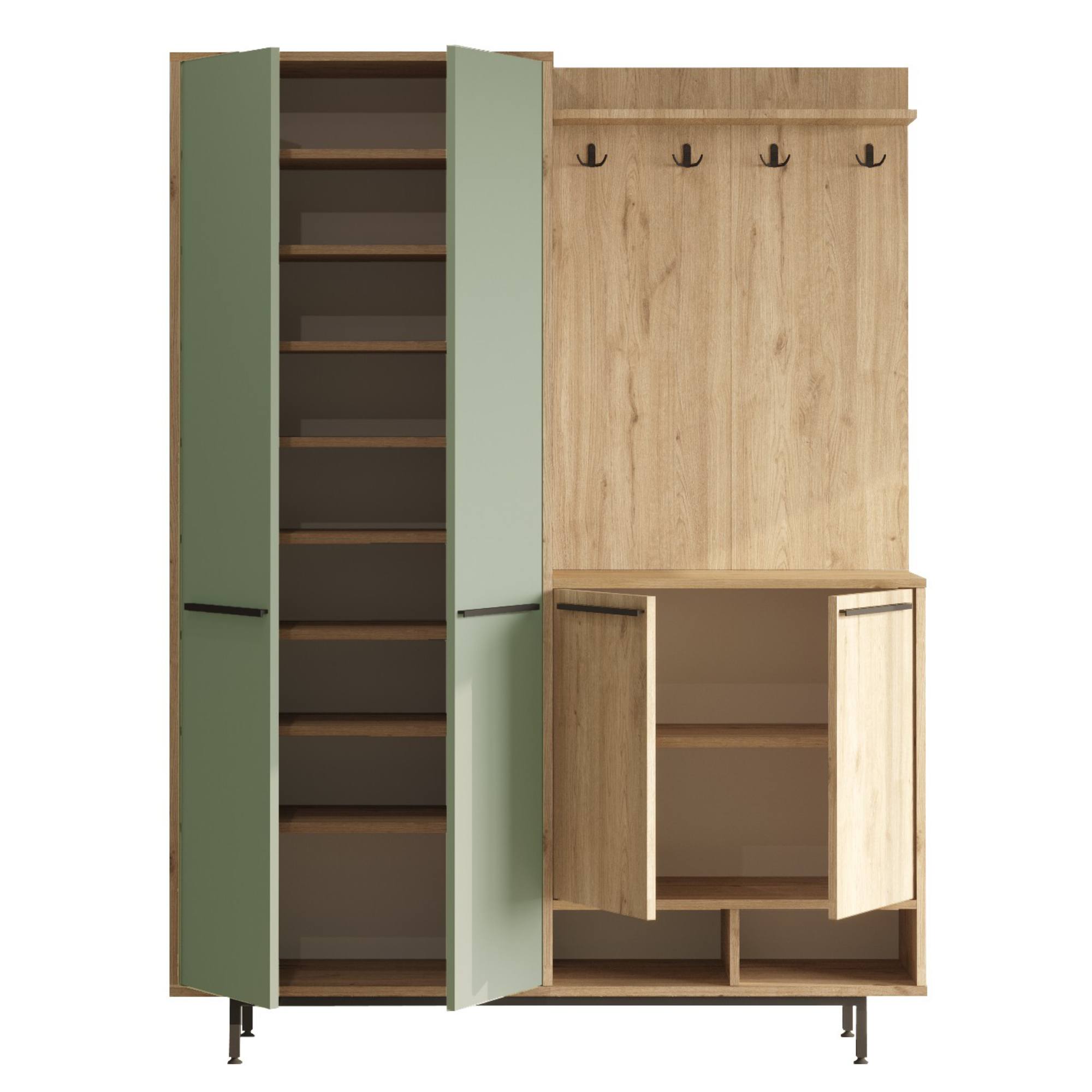 Zostava ponúka dostatok úložného priestoru, ktorý nájde využitie v každej predsieni. Je vybavená 9 vloženými policami, ktoré sa ukrývajú za dvierkami. Ďalšia polica je umiestnená nad 4 háčikmi, na ktoré si môžete zavesiť kabáty, bundy, kabelky, tašky aj rôzne módne doplnky. Aby sa s dvierkami ľahšie manipulovalo, sú vybavené rúčkami.