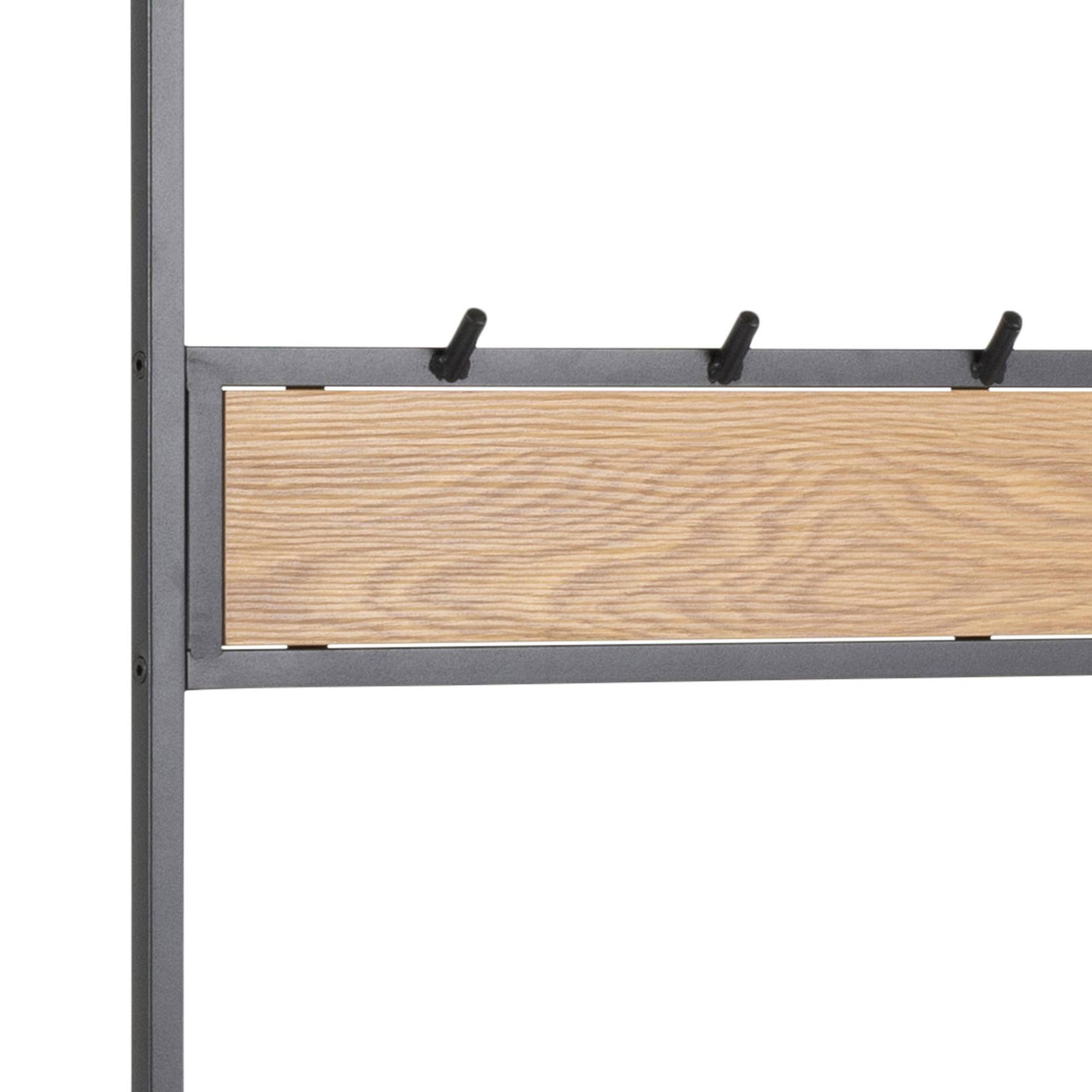 Súčasťou tejto zostavy sú nielen tri vložené police z drevovláknitého materiálu MDF ozdobené dekorom divokého duba, ale aj šatníková tyč a päť praktických háčikov. O stabilitu zostavy sa stará pevná kovová konštrukcia pokrytá práškovým nástrekom.