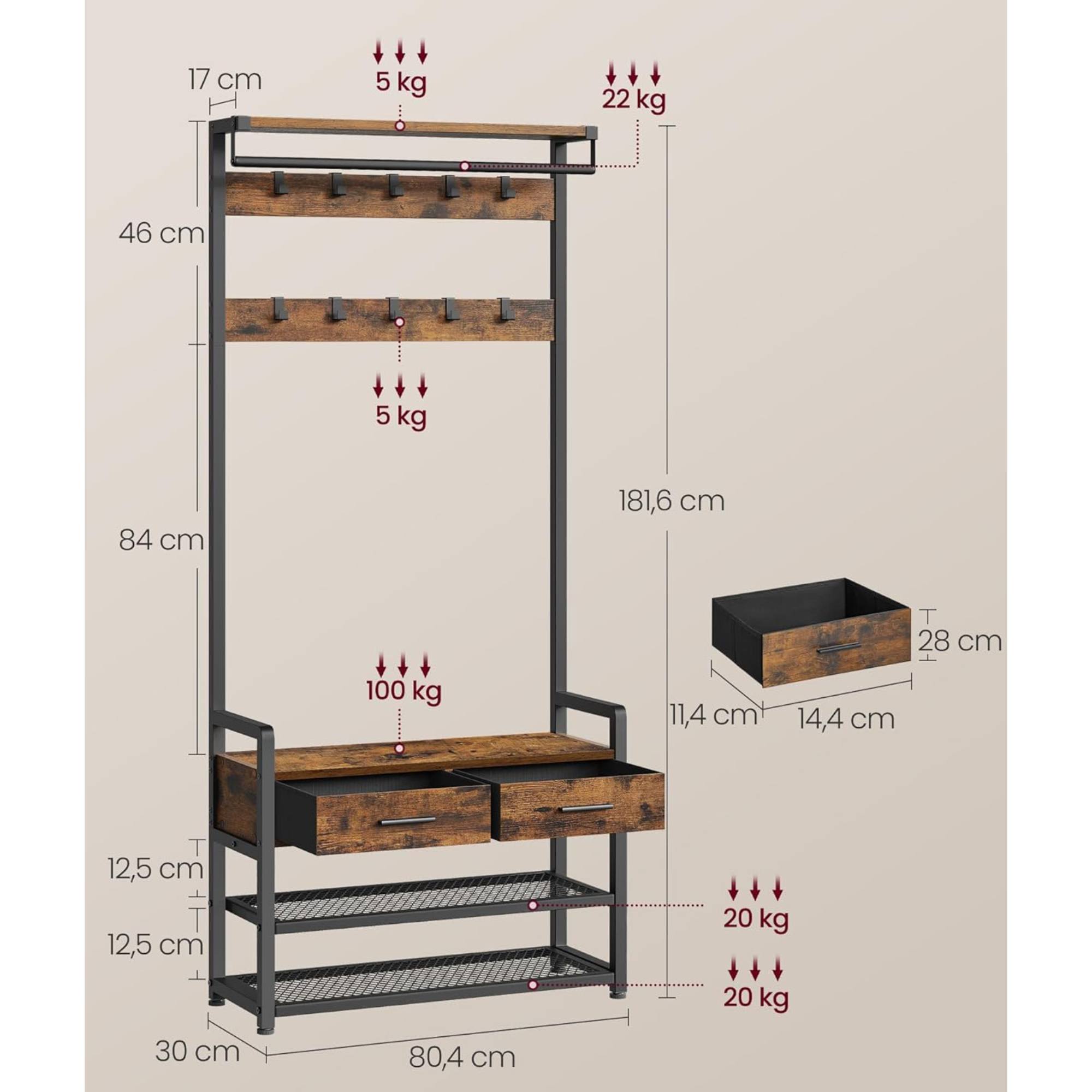 Súčasťou tejto zostavy sú dve zásuvky, desať praktických háčikov, police na topánky, šatníková tyč a praktická lavica. Pevnú oceľovú konštrukciu, ktorá zaisťuje zostave stabilitu, dopĺňajú prvky z kvalitnej drevotrieskovej dosky. Zostavu je možné rozdeliť na dve časti - na nástennú závesnú tyč a lavicu na topánky.