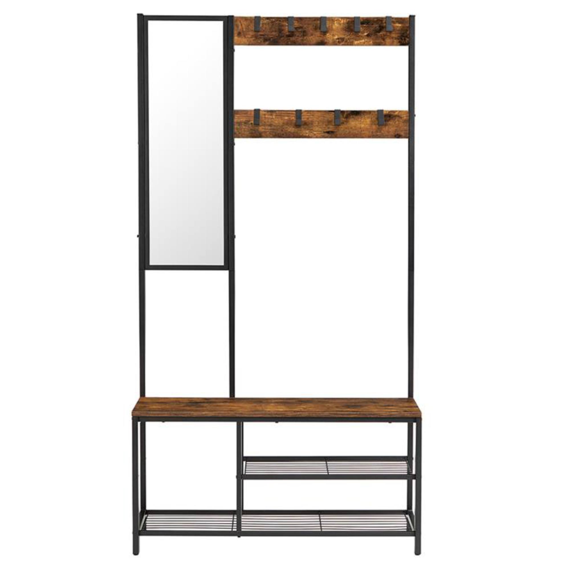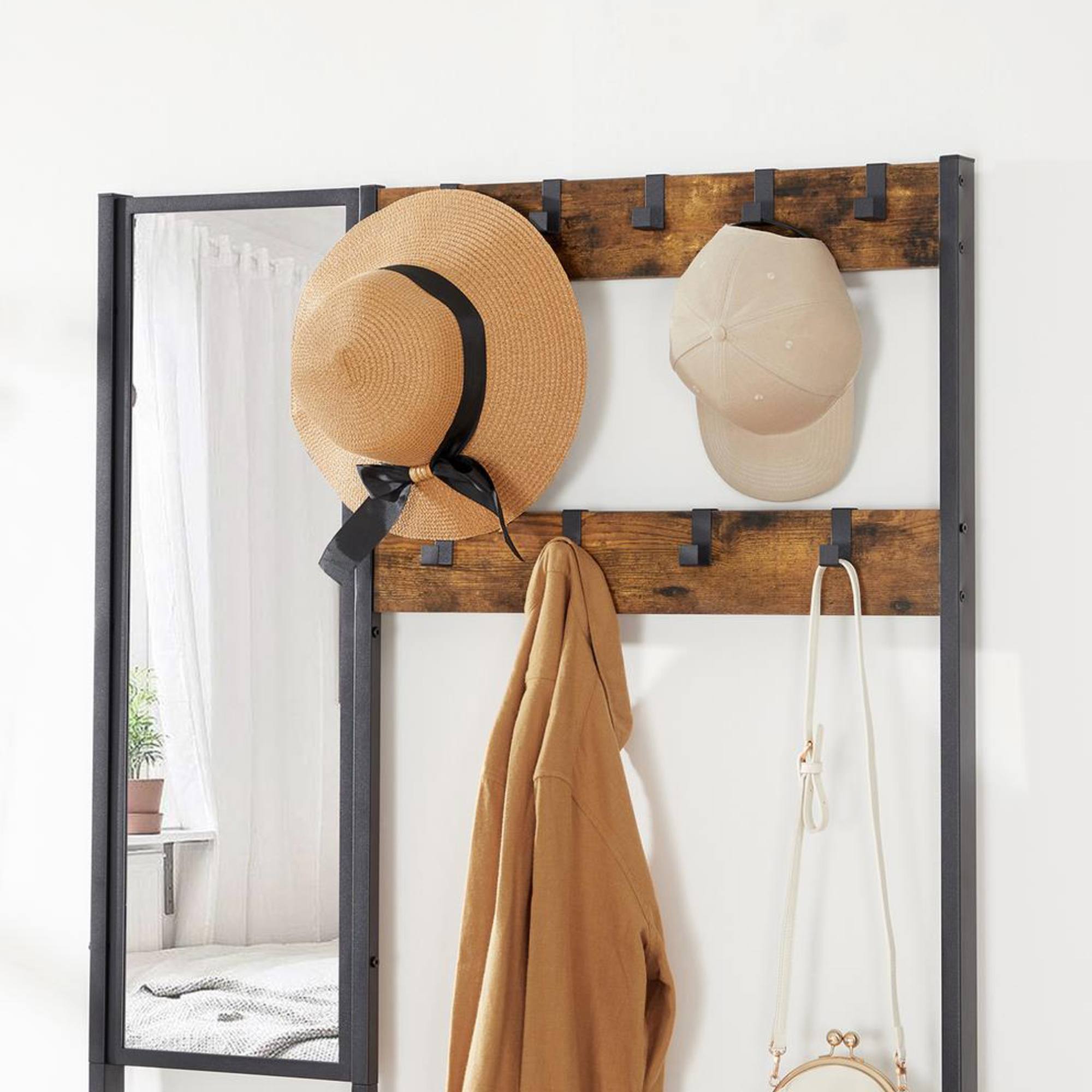 Stabilná kovová konštrukcia tejto zostavy je doplnená prvkami z laminovanej drevotrieskovej dosky. Pokiaľ ide o úložný priestor, ponúka zostava nielen 2 vložené police, do ktorých si môžete uložiť často nosené topánky, ale aj 8 háčikov, ktoré poskytnú miesto na oblečenie, šatky aj rôzne módne doplnky. Nechýba ani miesto na sedenie a zrkadlo.