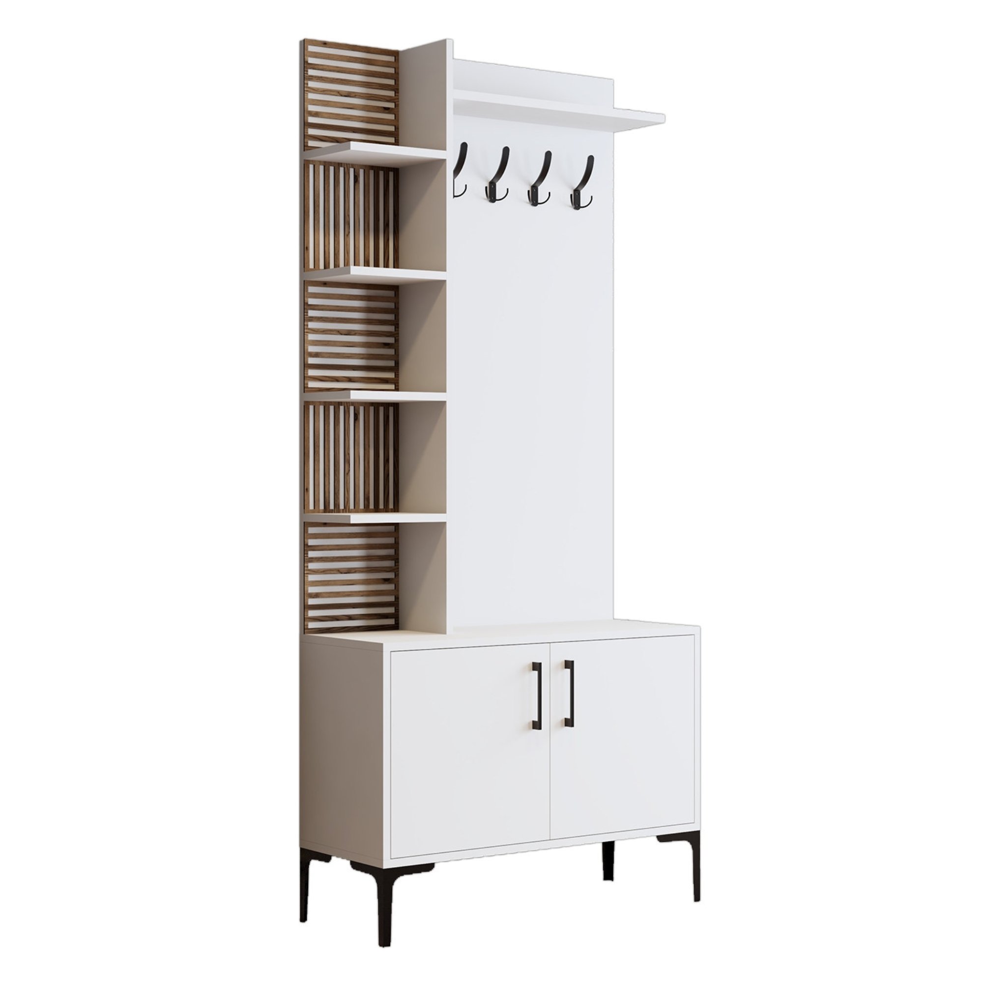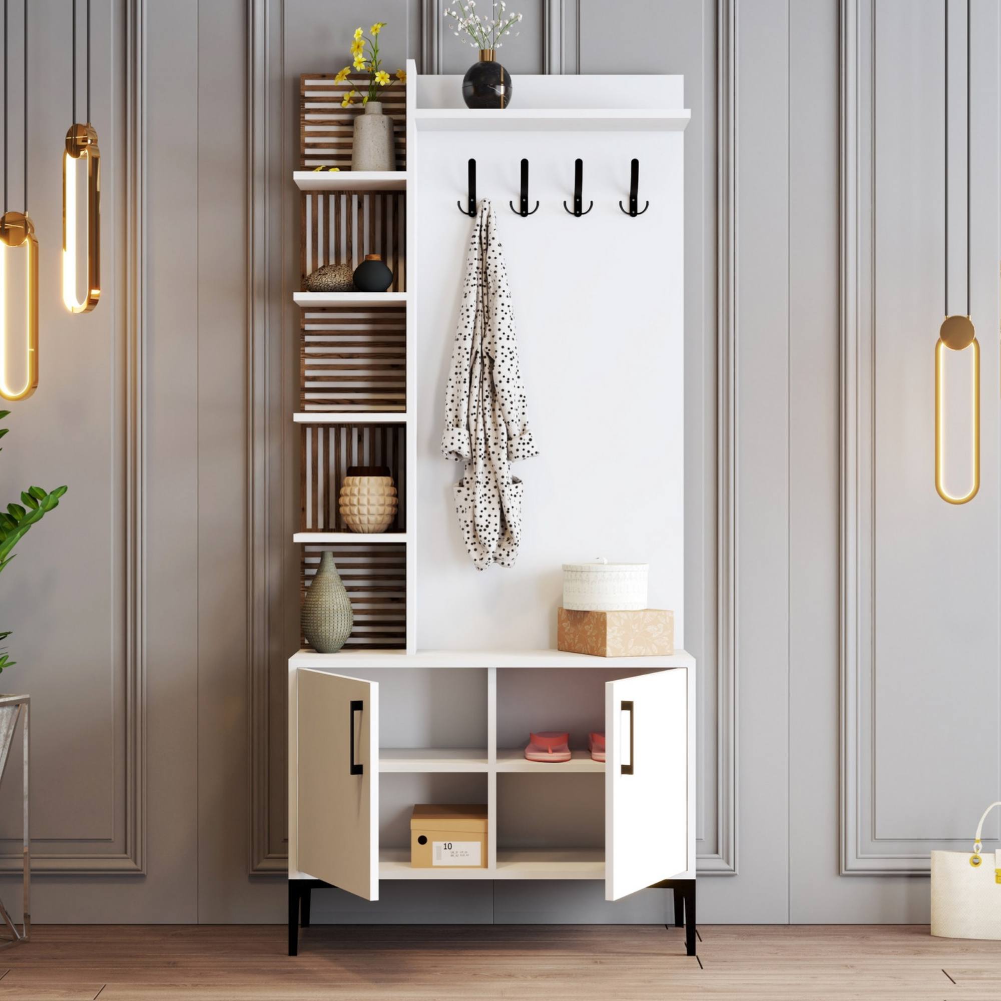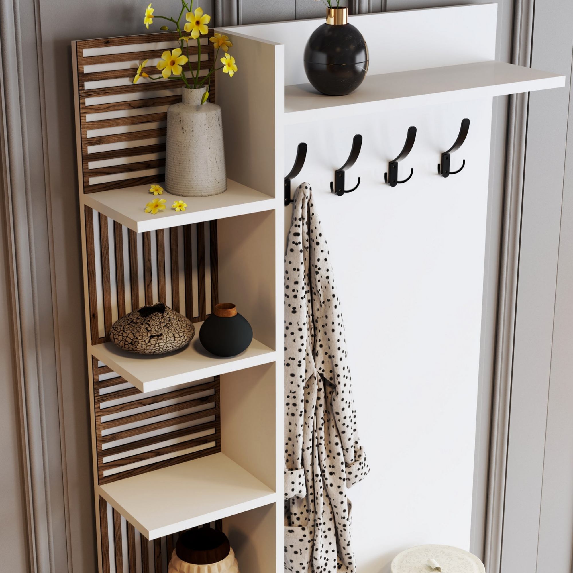 Zostava ponúka dostatok úložného priestoru. Jej súčasťou je6 vložených políc, z ktorých 1 je skrytá za otočnými dvierkami. Aby sa s týmito dvierkami dobre manipulovalo, sú vybavené kovovými rúčkami. Nechýbajú ani4 kovové dvojité háčiky, na ktoré si môžete zavesiť nielen často nosené kabáty alebo bundy, ale aj rôzne módne doplnky.