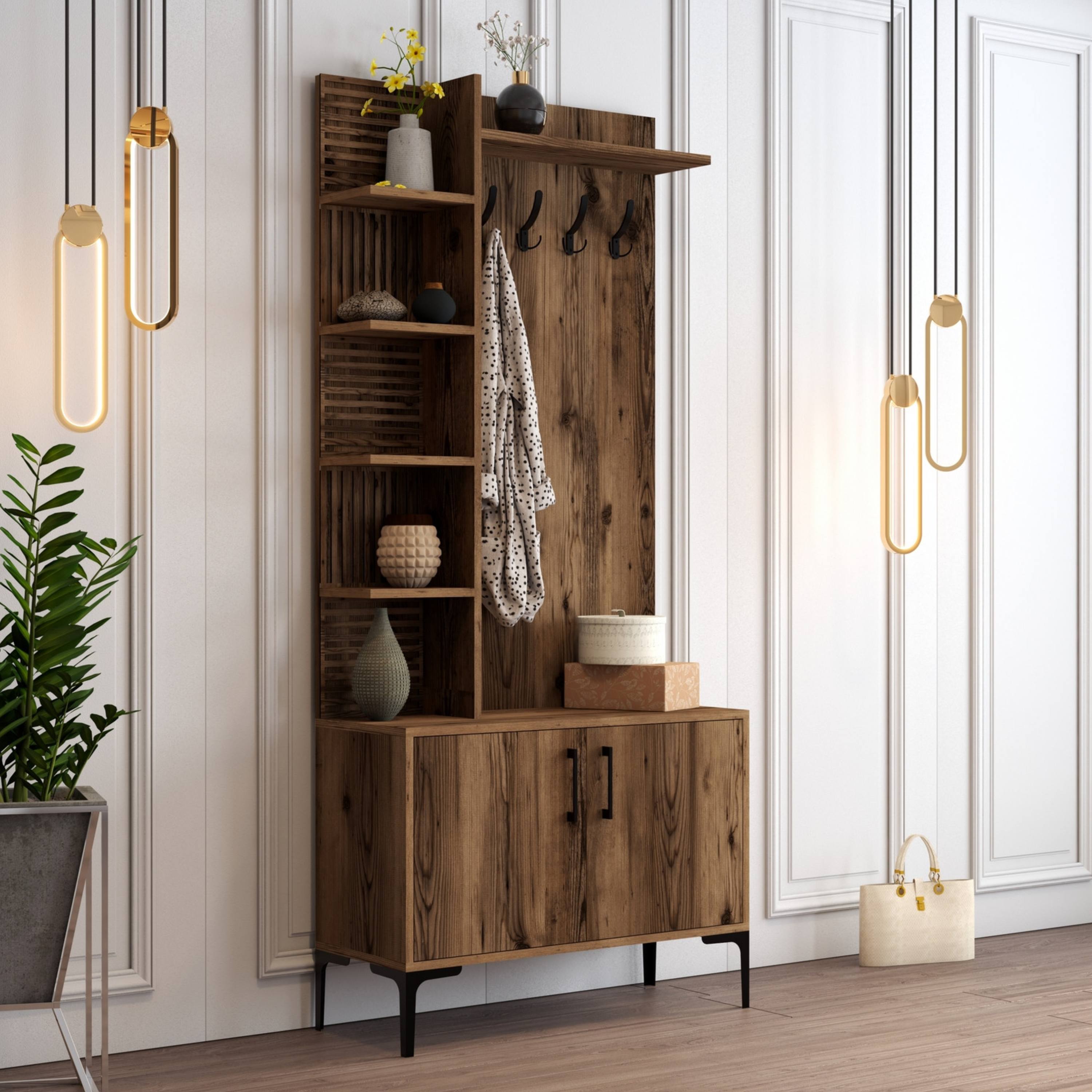 Zostava ponúka dostatok úložného priestoru. Jej súčasťou je6 vložených políc, z ktorých 1 je skrytá za otočnými dvierkami. Aby sa s týmito dvierkami dobre manipulovalo, sú vybavené kovovými rúčkami. Nechýbajú ani4 kovové dvojité háčiky, na ktoré si môžete zavesiť nielen často nosené kabáty alebo bundy, ale aj rôzne módne doplnky.