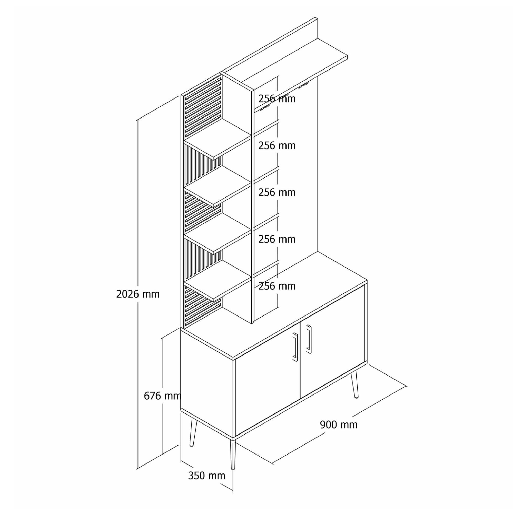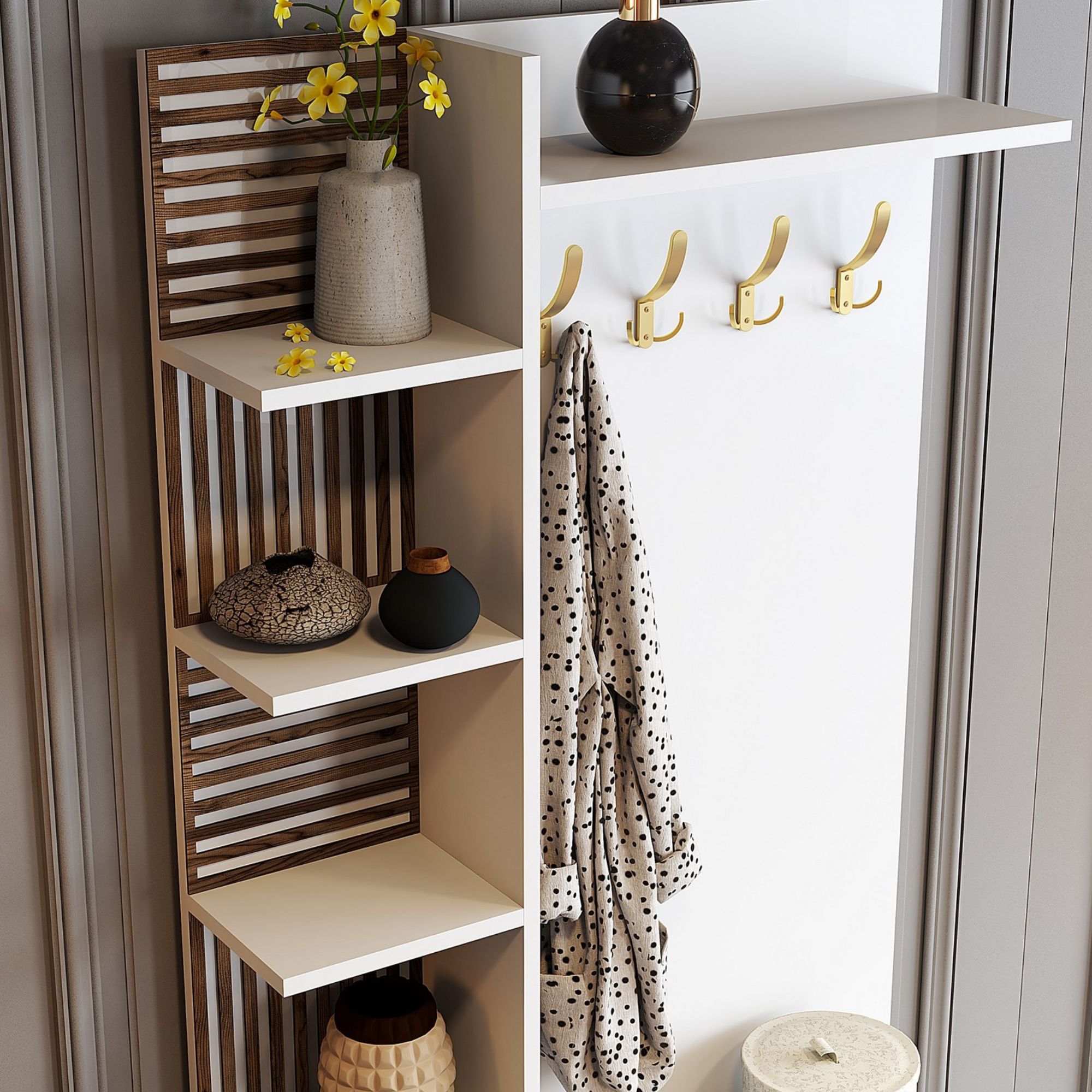 Zostava ponúka dostatok úložného priestoru. Jej súčasťou je6 vložených políc, z ktorých 1 je skrytá za otočnými dvierkami. Aby sa s týmito dvierkami dobre manipulovalo, sú vybavené rúčkami. Nechýbajú ani4 dvojité háčiky, na ktoré si môžete zavesiť nielen často nosené kabáty alebo bundy, ale aj rôzne módne doplnky.