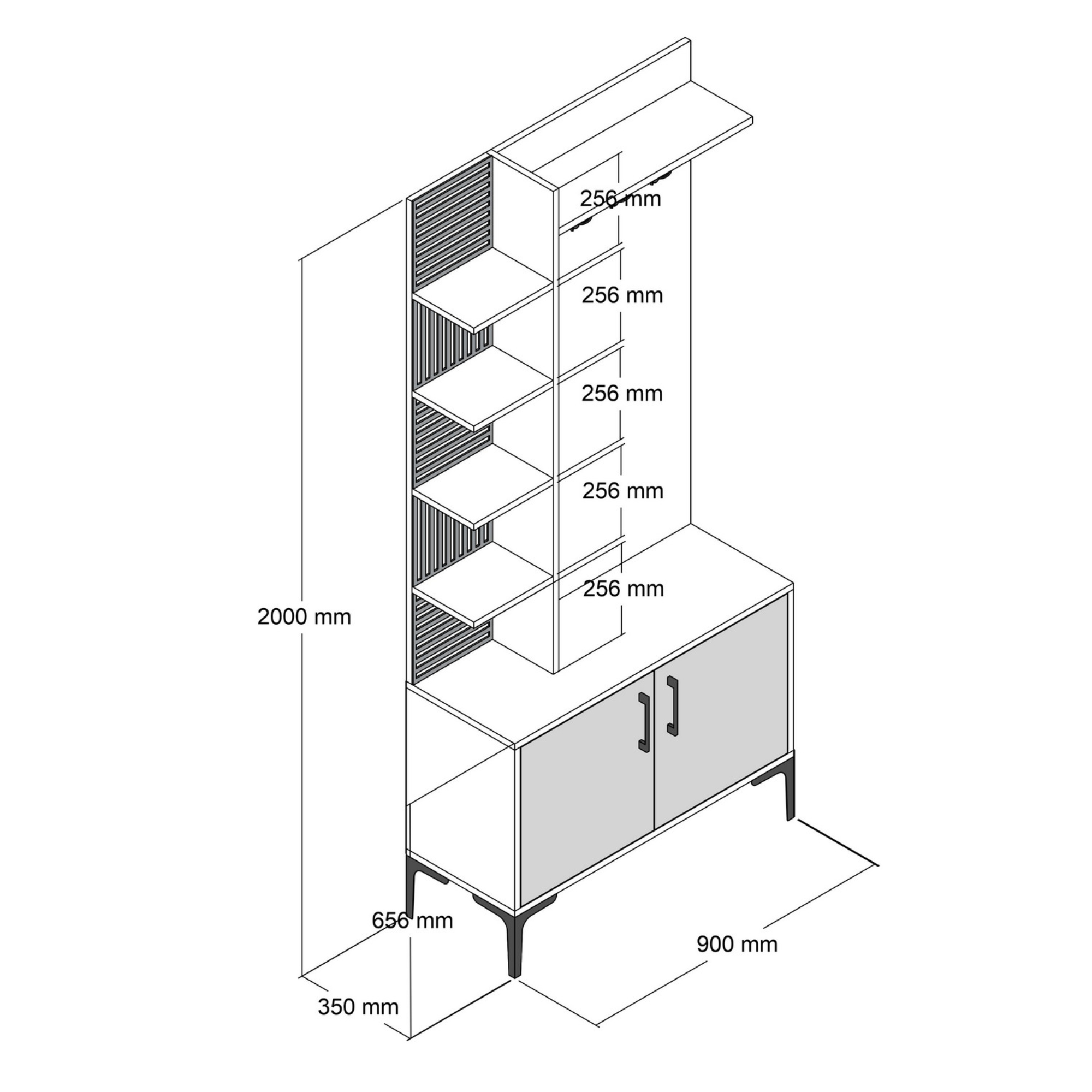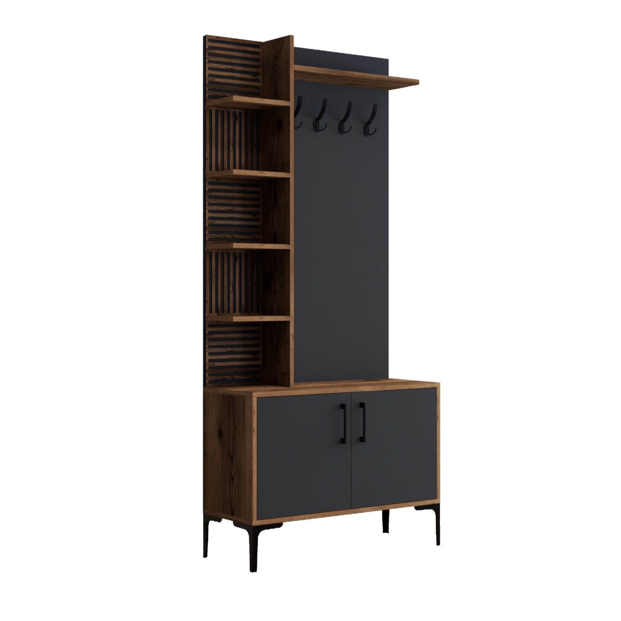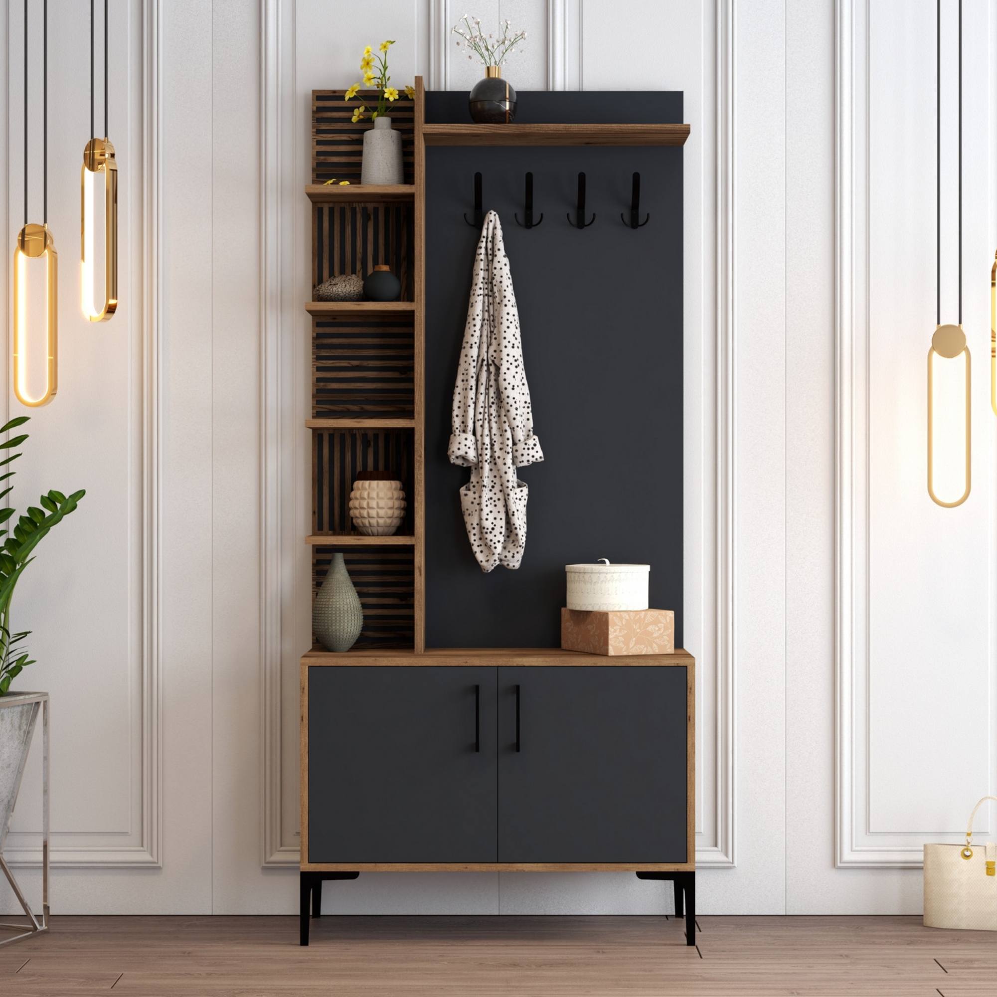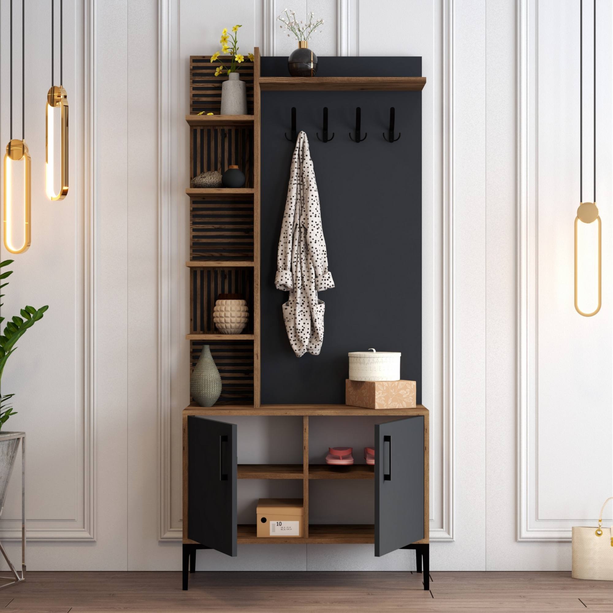 Predsieňová zostava VIYANA ponúka dostatok otvoreného aj uzavretého úložného priestoru, ktorý vám pomôže udržať predsieň organizovanú a upratovanú. Zostava disponuje jednou uzatvárateľnou skrinkou a siedmimi policami. Štyri z nich sa nachádzajú na ľavej strane zostavy, jedna dlhá nad háčikmi a posledné dve sa ukrývajú v skrinke. Často nosené kabáty či bundy si môžete zavesiť na štyri trojité kovové háčiky. Vyvýšené kovové nohy umožňujú bezproblémové upratovanie pod zostavou.