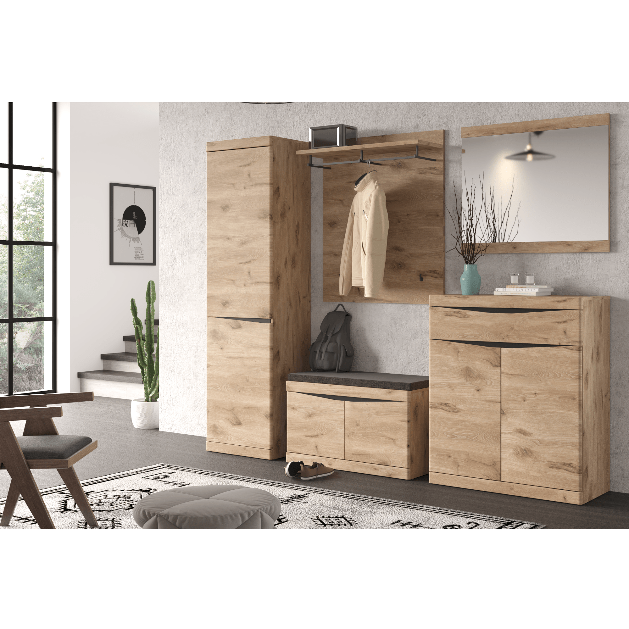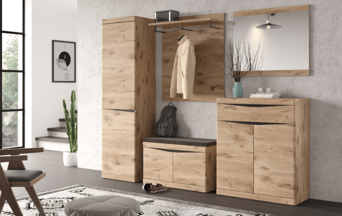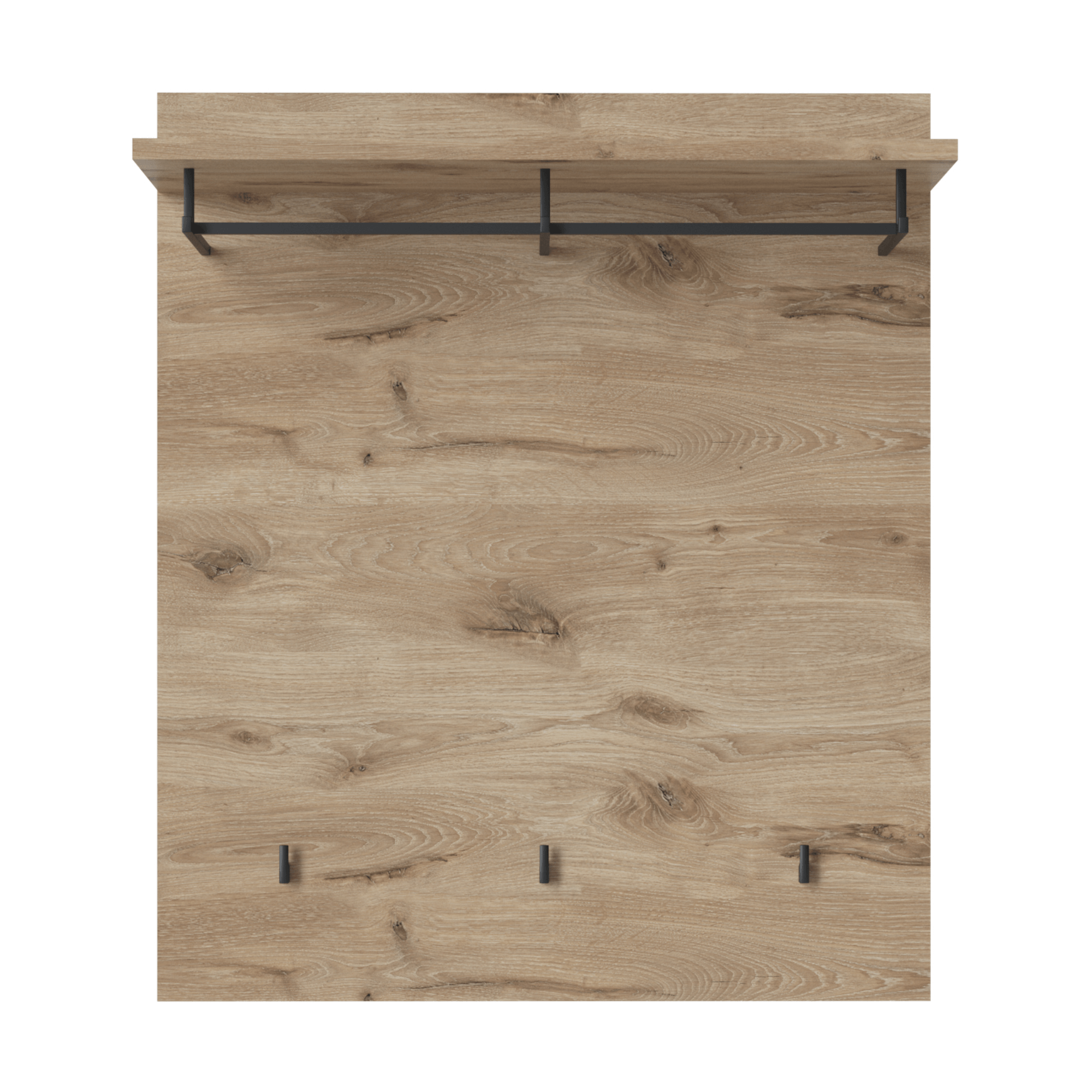 Vyrobený je z laminovaného dreveného materiálu, ktorý vyniká ľahkou udržiavateľnosťou a dlhou životnosťou. Ladený je do dekora dub viking. Dostatočný odkladací priestor zaisťuje horná polica, šatníková tyč a trojica praktických háčikov. Predsieňový panel AVERIL sa stane vkusným doplnkom a zaistí logické členenie a poriadok vašej predsiene.