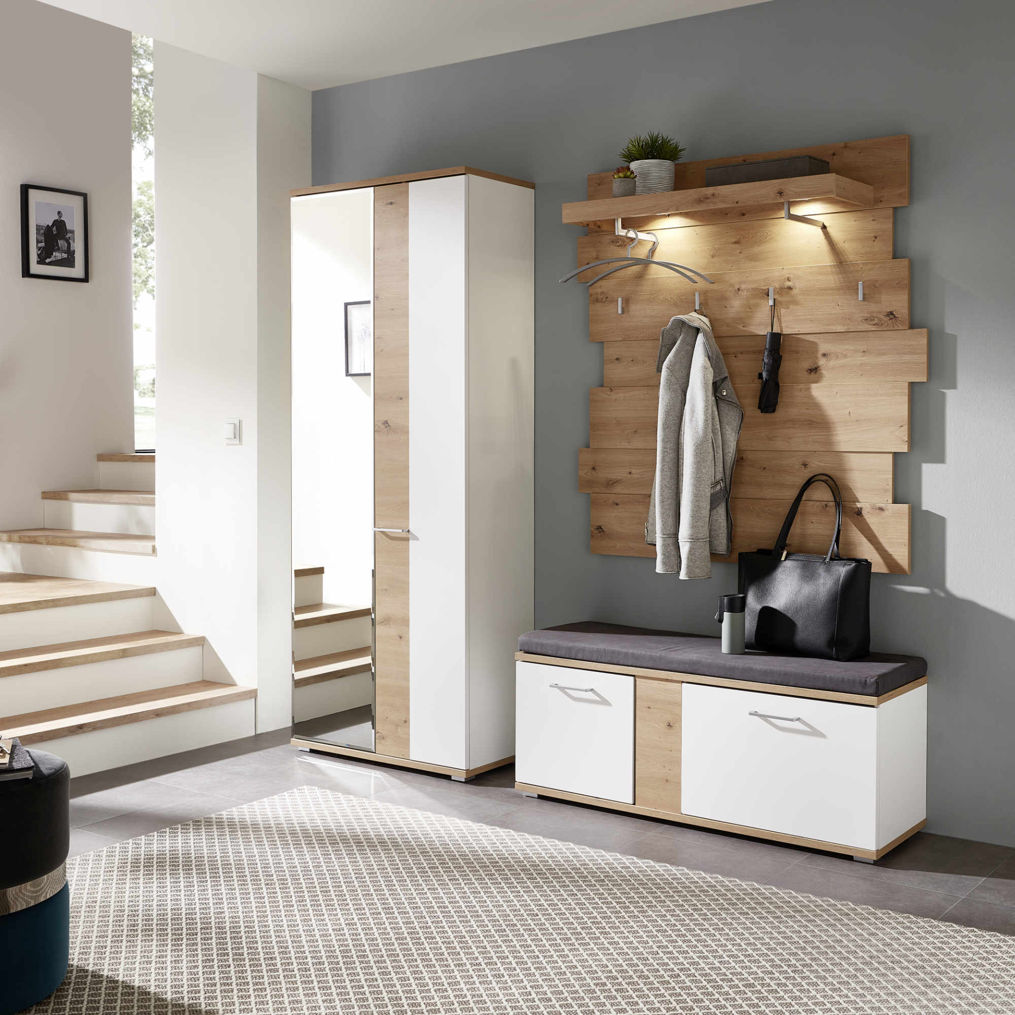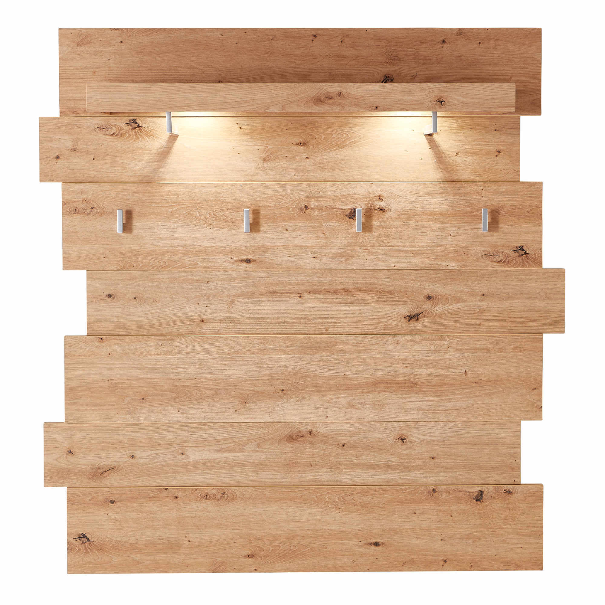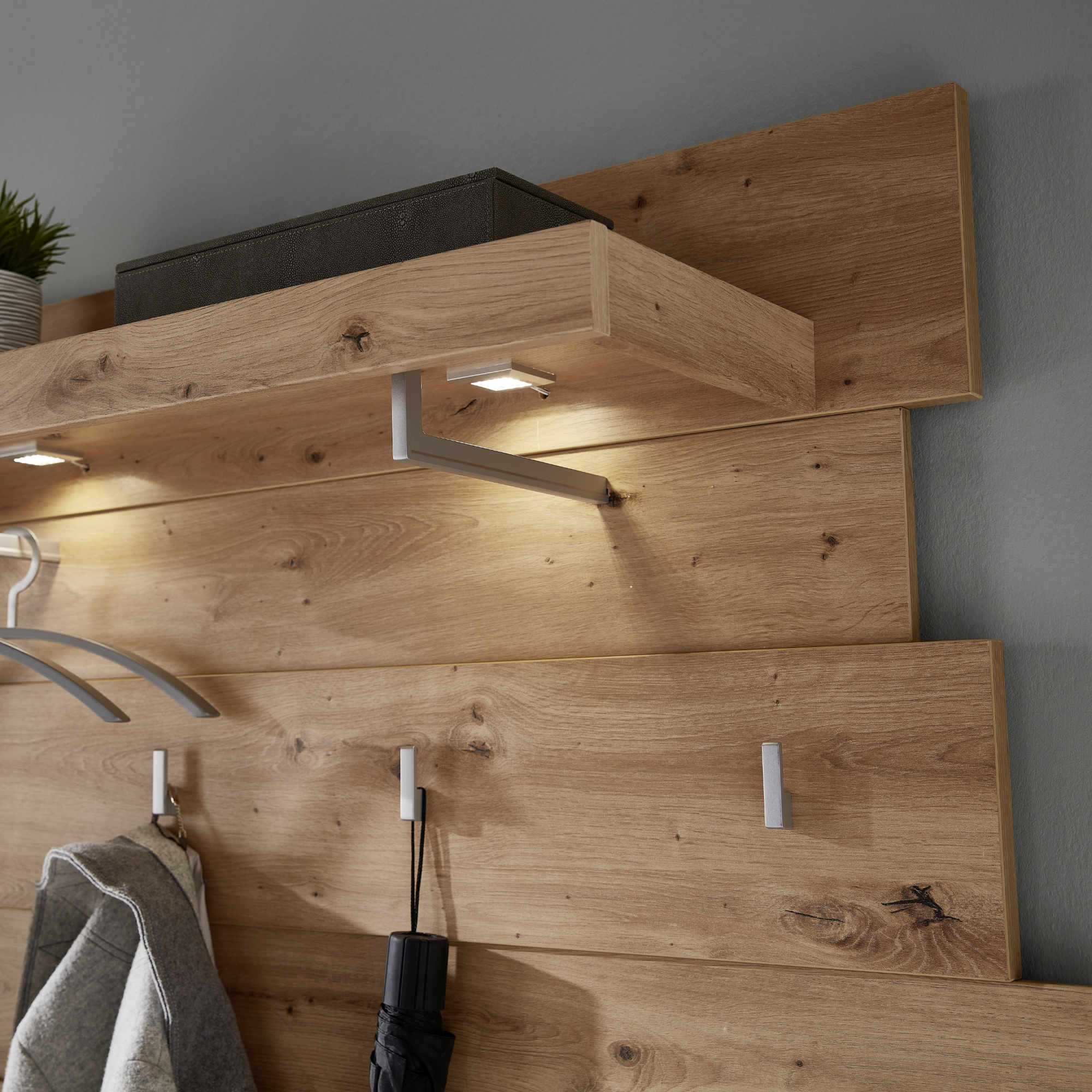 Panel tvoria nepravidelne umiestnené dosky v dekore dreva s výraznou kresbou, ktorá príjemne prehreje vstupný priestor. Kovová šatníková tyč a háčiky unesú váhu plných vreciek a poslúžia aj na zavesenie kabelky, odloženie klobúka i vodítka pre vášho štvornohého maznáčika.
