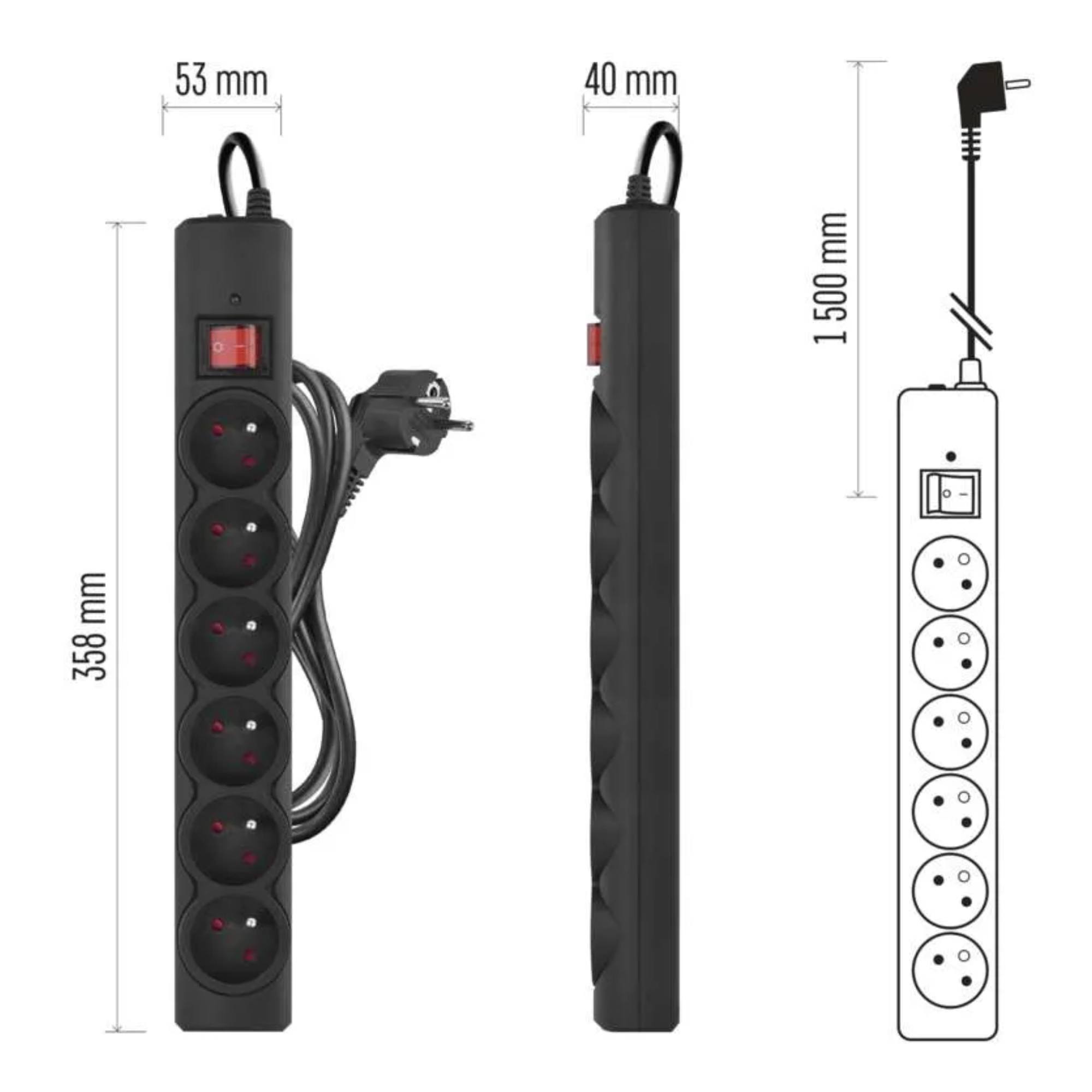 Prepäťová ochrana P54015/18 - čierna, 6 zásuviek, dĺžka 1,5 m, absorpcia 380 J