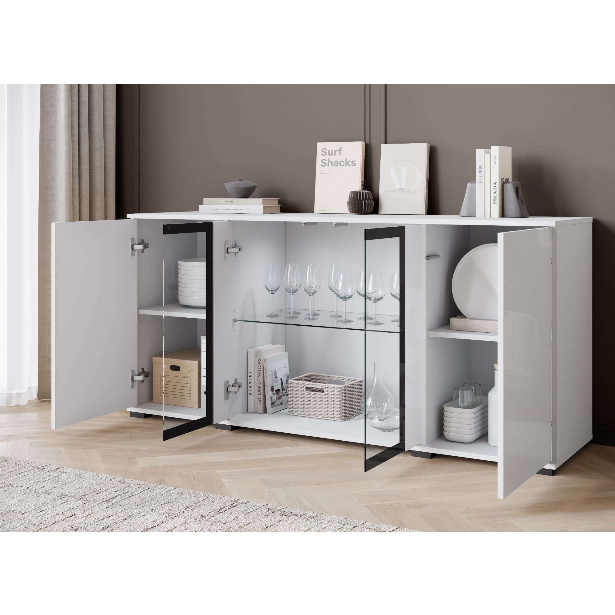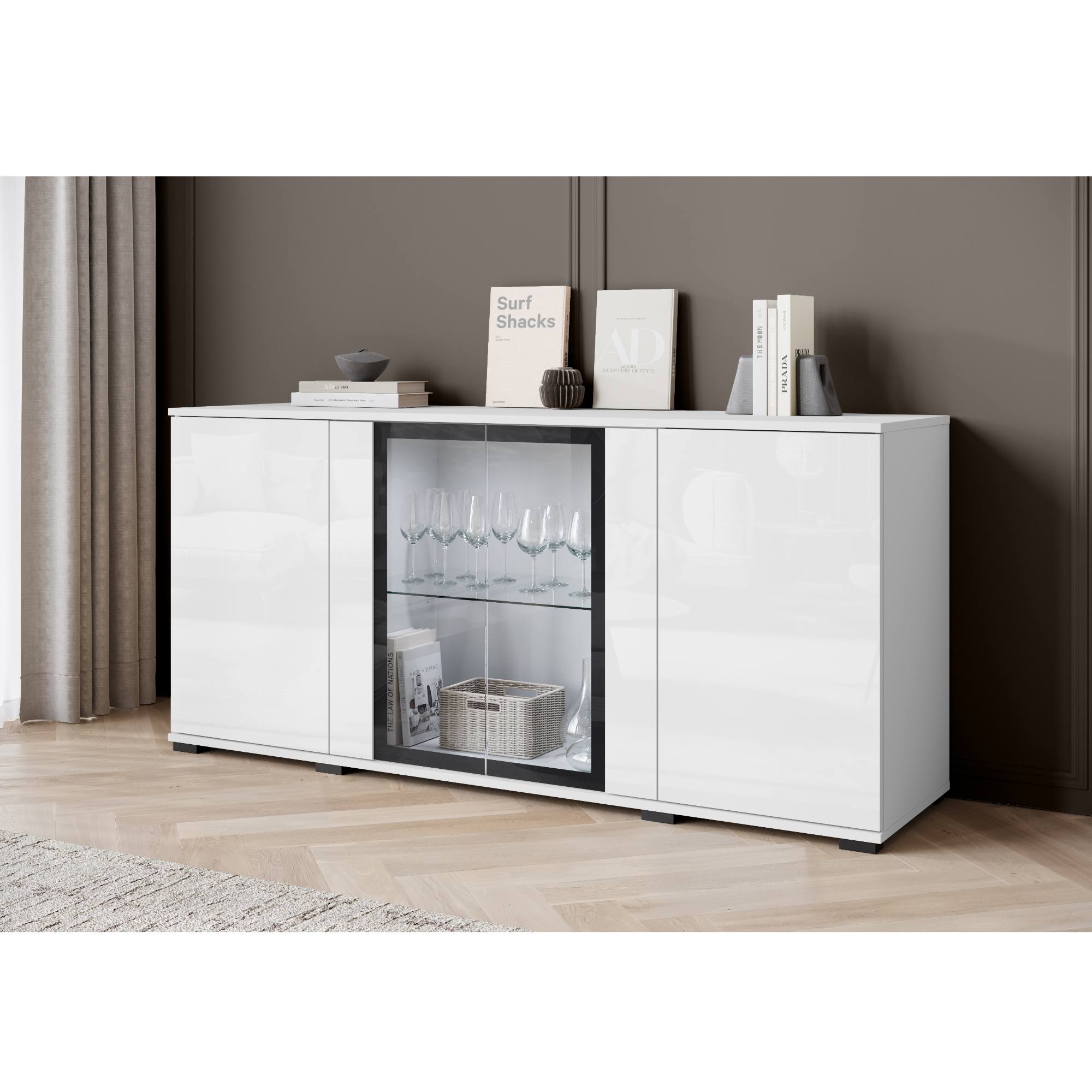 Príborník ponúka 3 vložené police, z ktorých 1 je zo skla. Vďaka preskleným dvierkam vám príborník umožní vystaviť všetky vaše obľúbené predmety, ku ktorých vyniknutiu prispeje aj štýlové **LED osvetlenie.