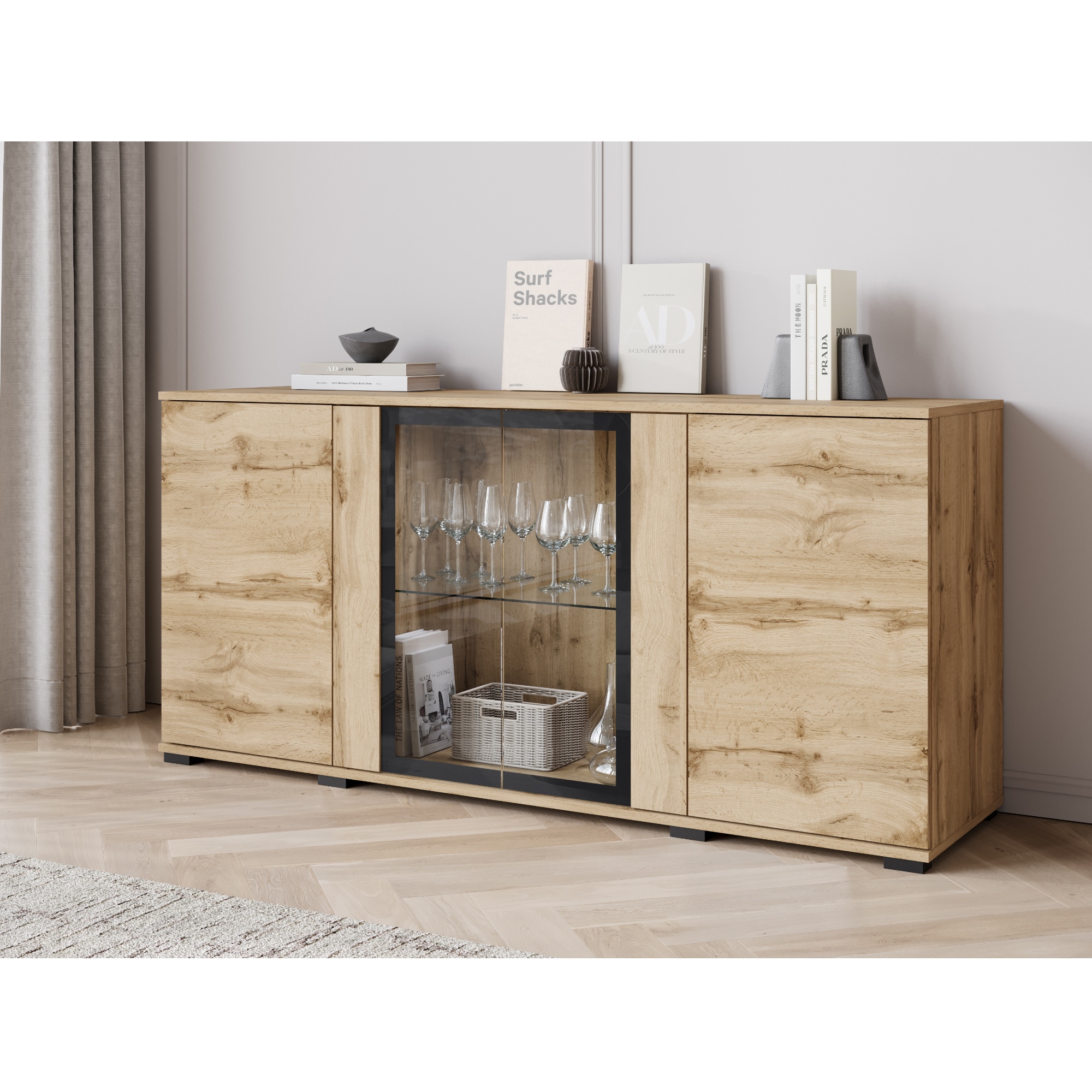Príborník ponúka 3 vložené police, z ktorých 1 je zo skla. Vďaka preskleným dvierkam vám príborník umožní vystaviť všetky vaše obľúbené predmety, ku ktorých vyniknutiu prispeje aj štýlové **LED osvetlenie.