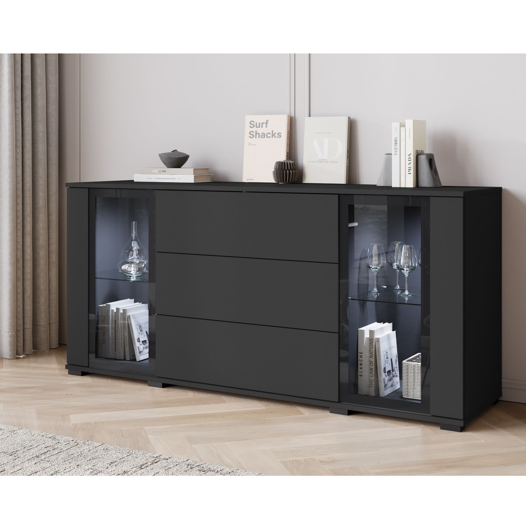 Príborník ponúka 2 vložené police, ktoré sú vyrobené zo skla. Vďaka preskleným dvierkam vám príborník umožní vystaviť všetky vaše obľúbené predmety, ku ktorých vyniknutiu prispeje aj štýlové LED osvetlenie. Na uloženie drobností skvele poslúžia **3 zásuvky.
