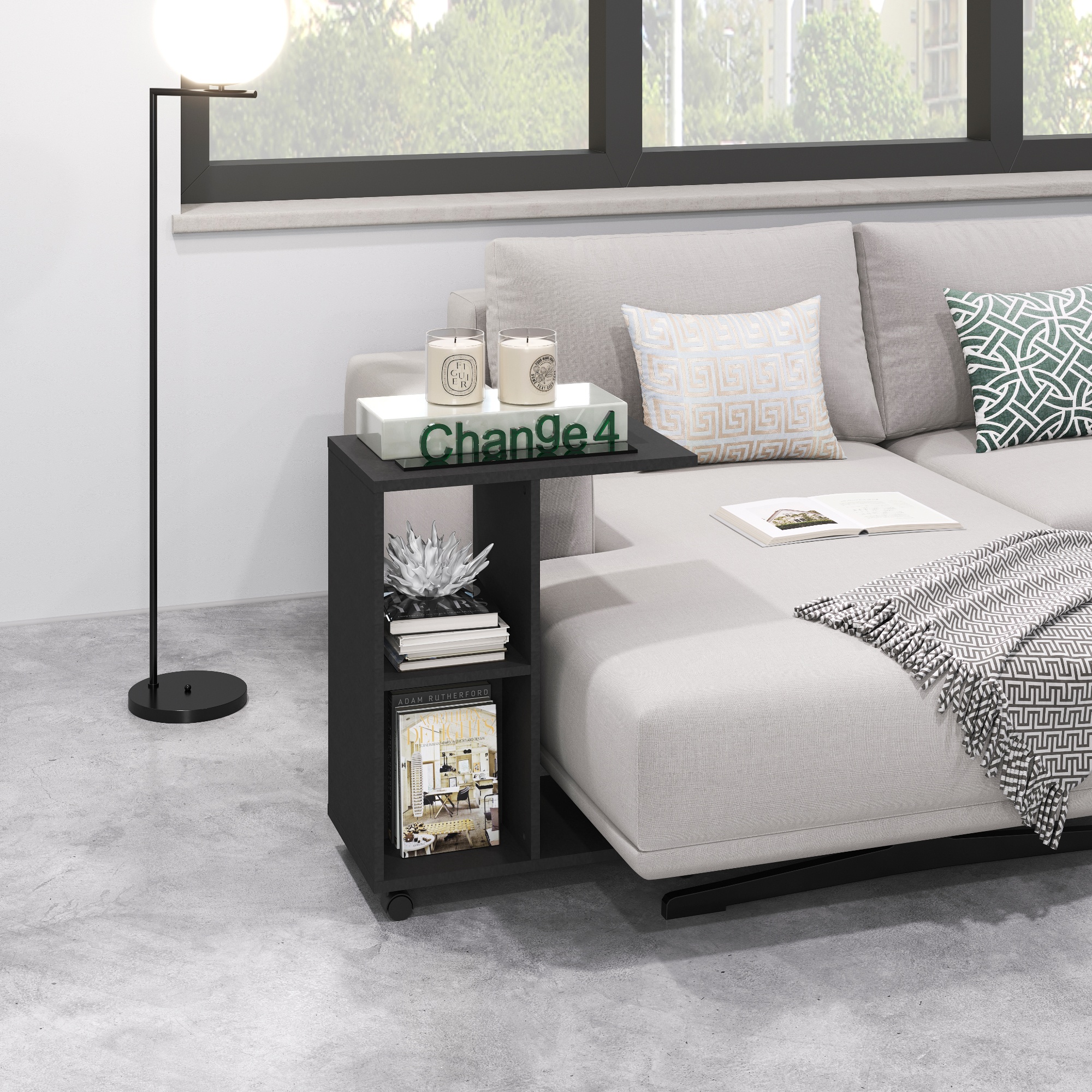 Na výrobu prístavného stolíka CHANGE bol využitý laminovaný drevený materiál, ktorý je nenáročný na údržbu.