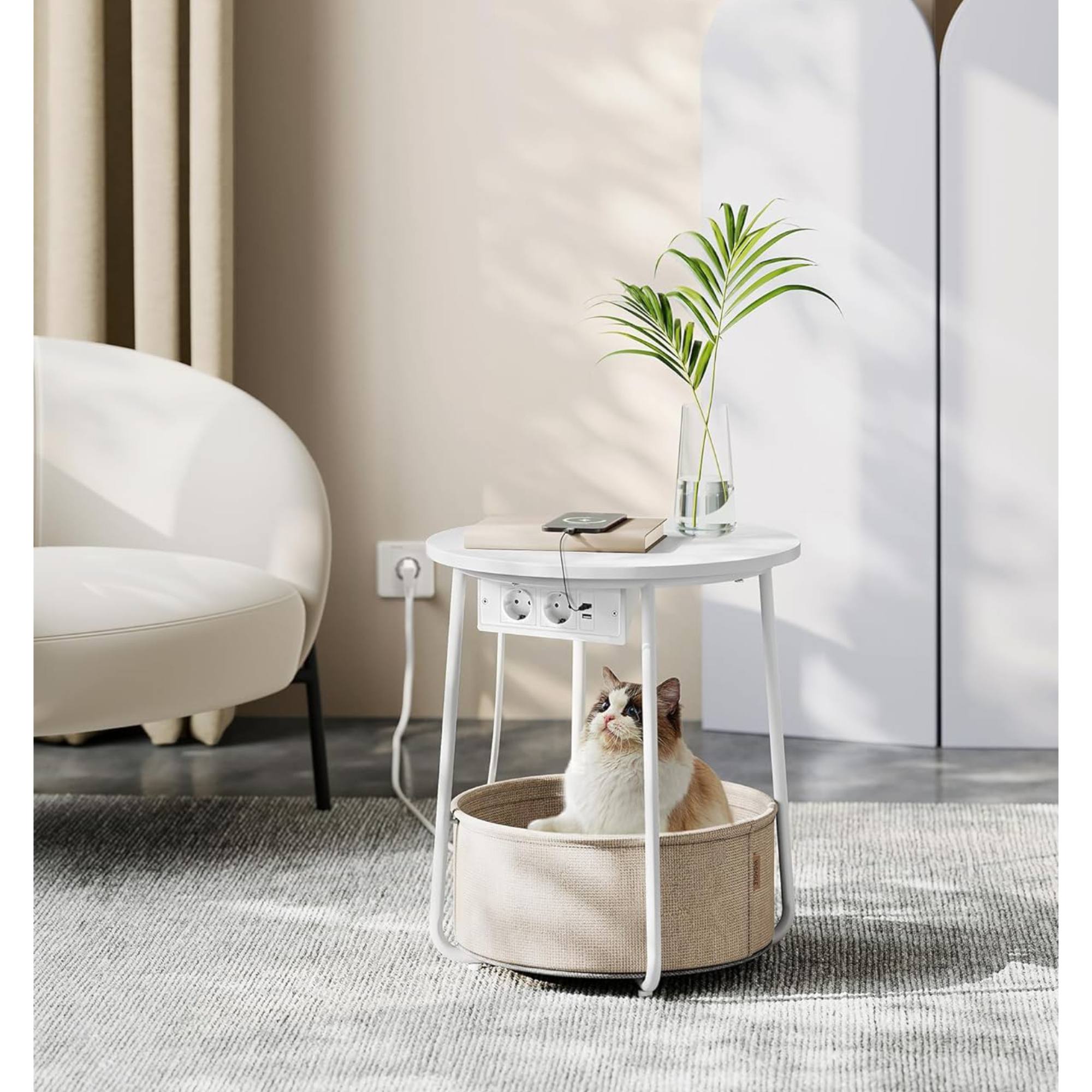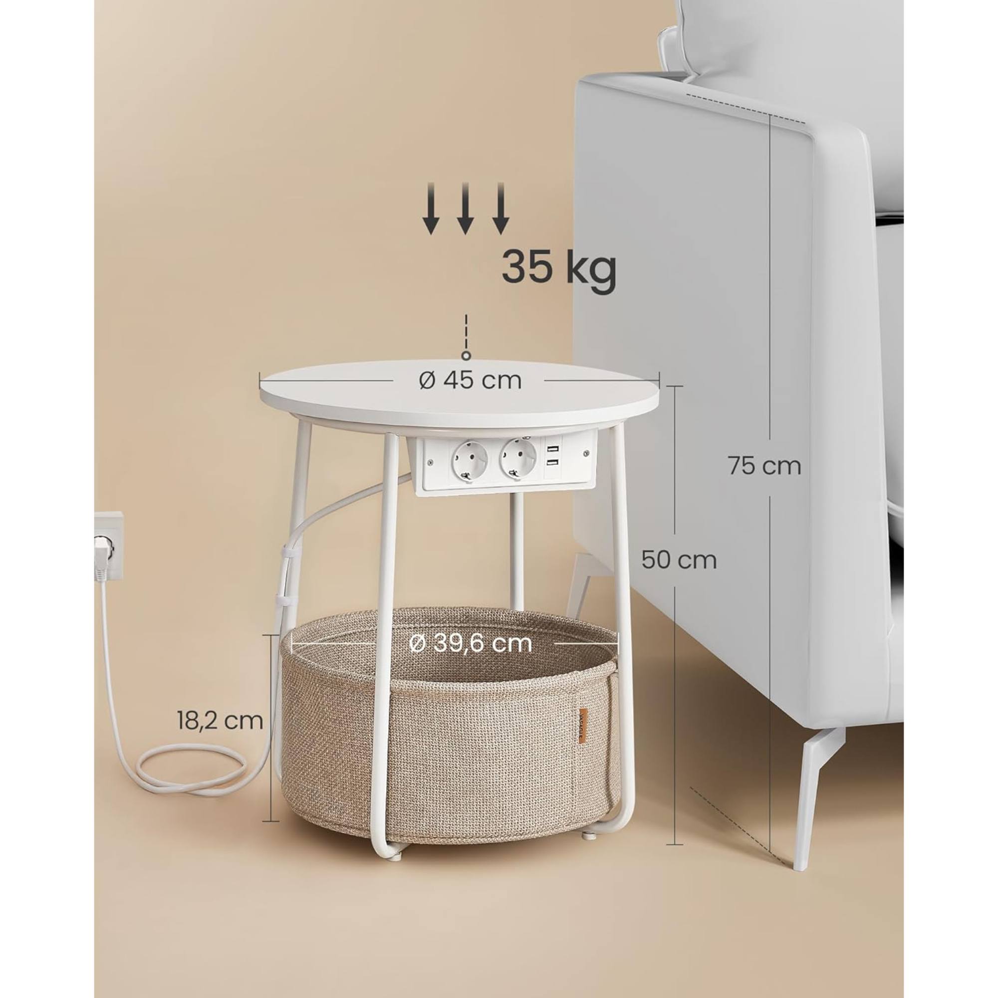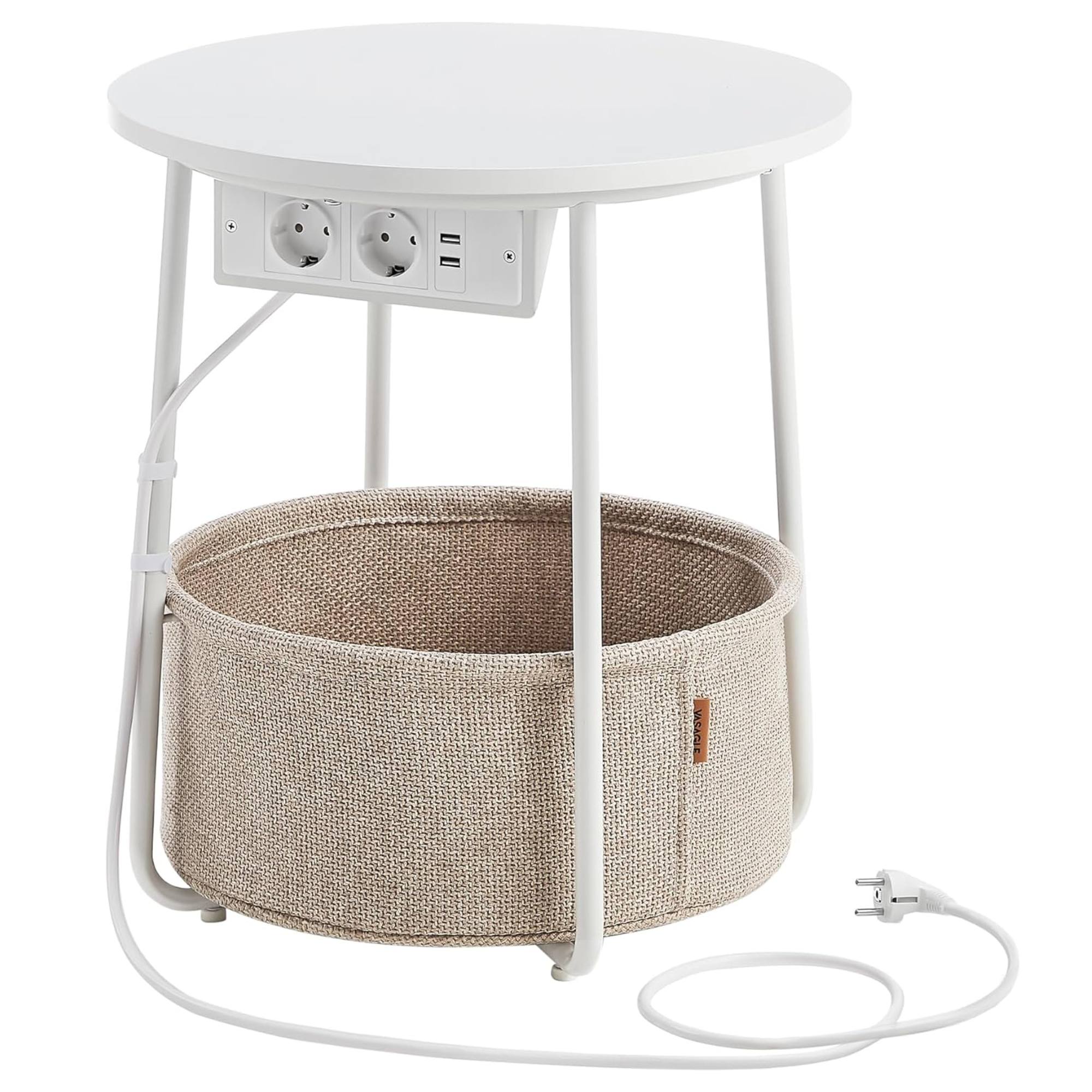 Odkladacia plocha je vyrobená z drevotrieskovej dosky. Maximálnu stabilitu zaisťuje kovová podnož - tá disponuje nastaviteľnými nôžkami, vďaka ktorým stolík ľahko vyrovnáte. Spodný úložný kôš z hrubej polyesterovej tkaniny sa hravo stane zázemím na knihy, časopisy, ale aj pre menších domácich miláčikov. Obsahuje aj zásuvku s USB portami, čo využijete na vaše zariadenie. Napájací kábel s dĺžkou 2 metre.