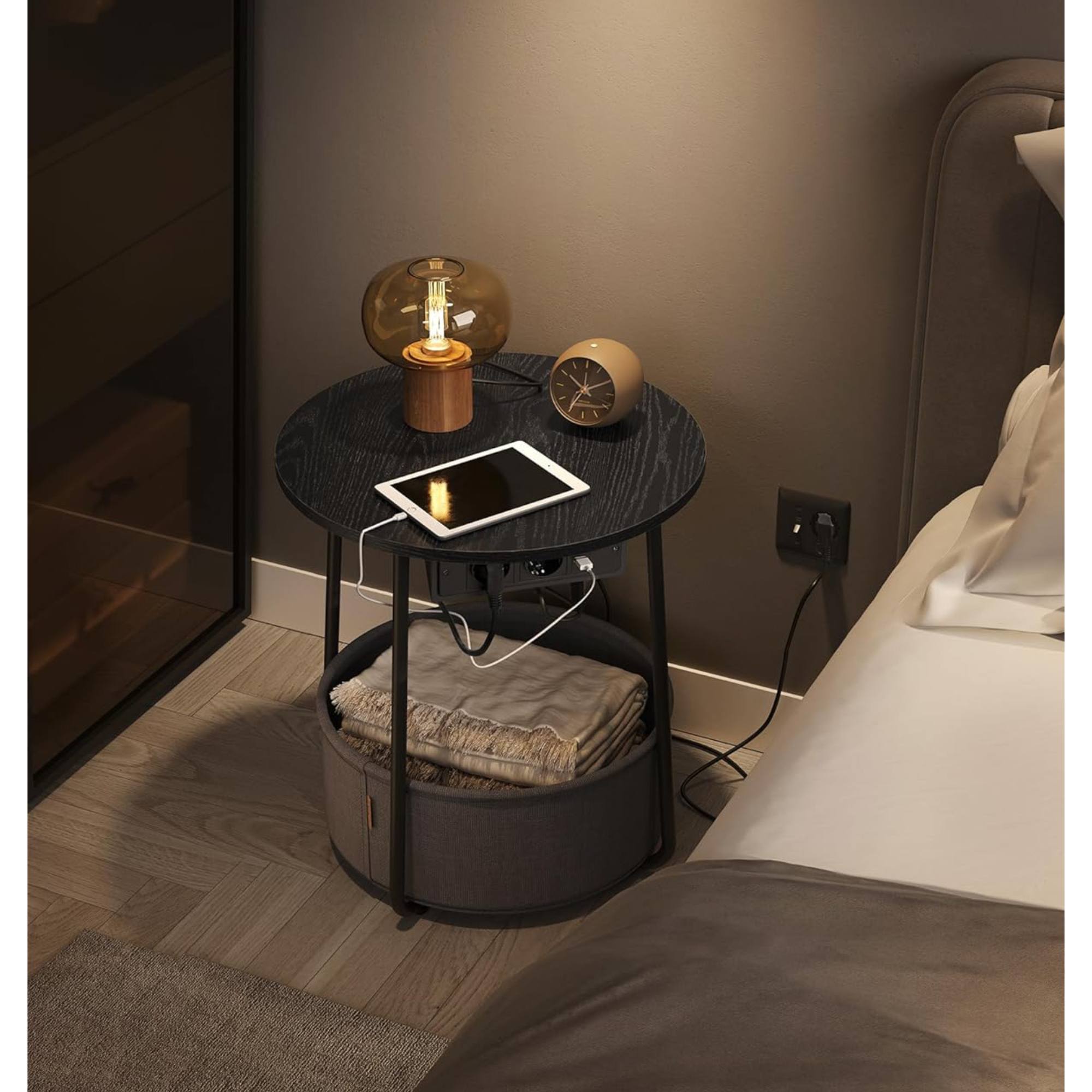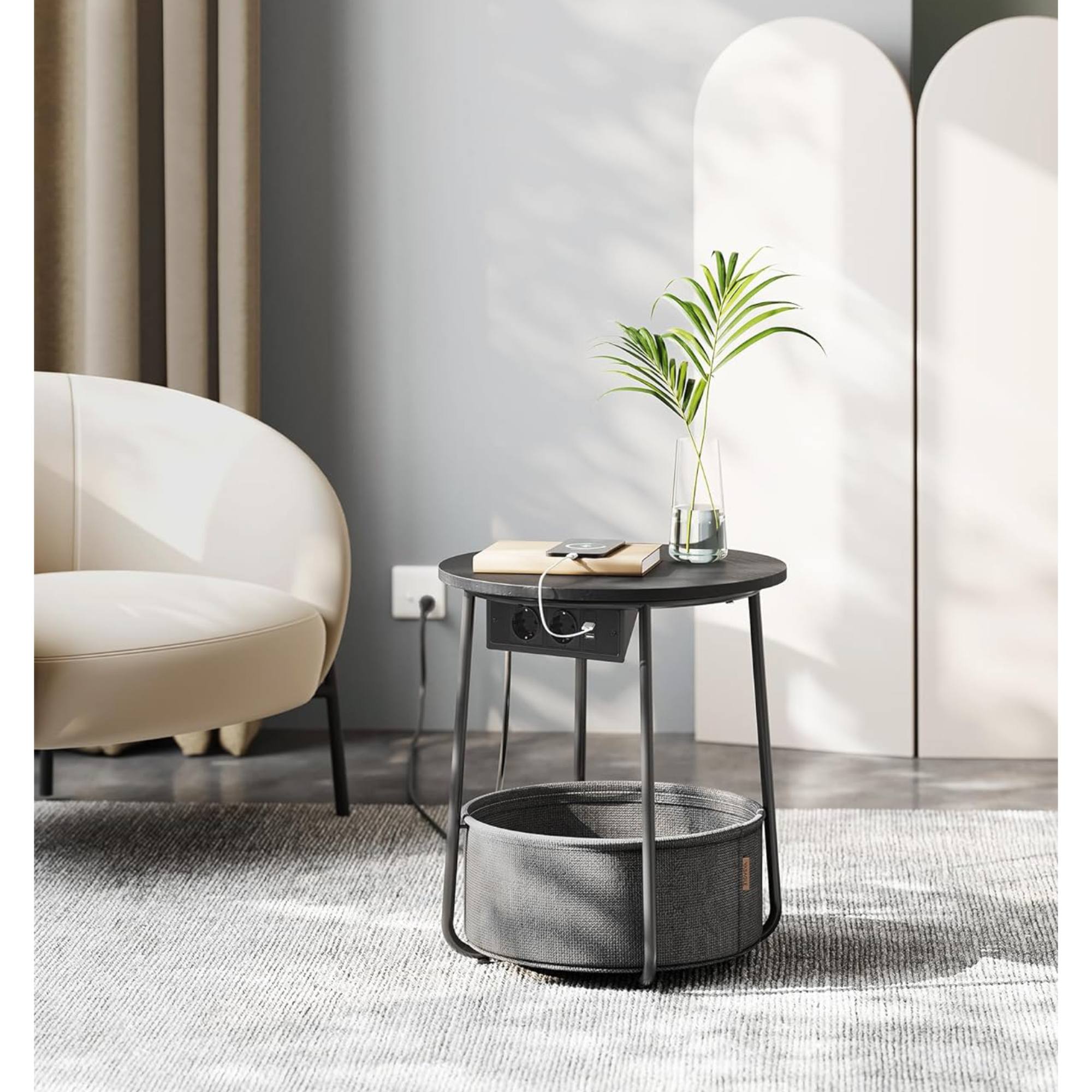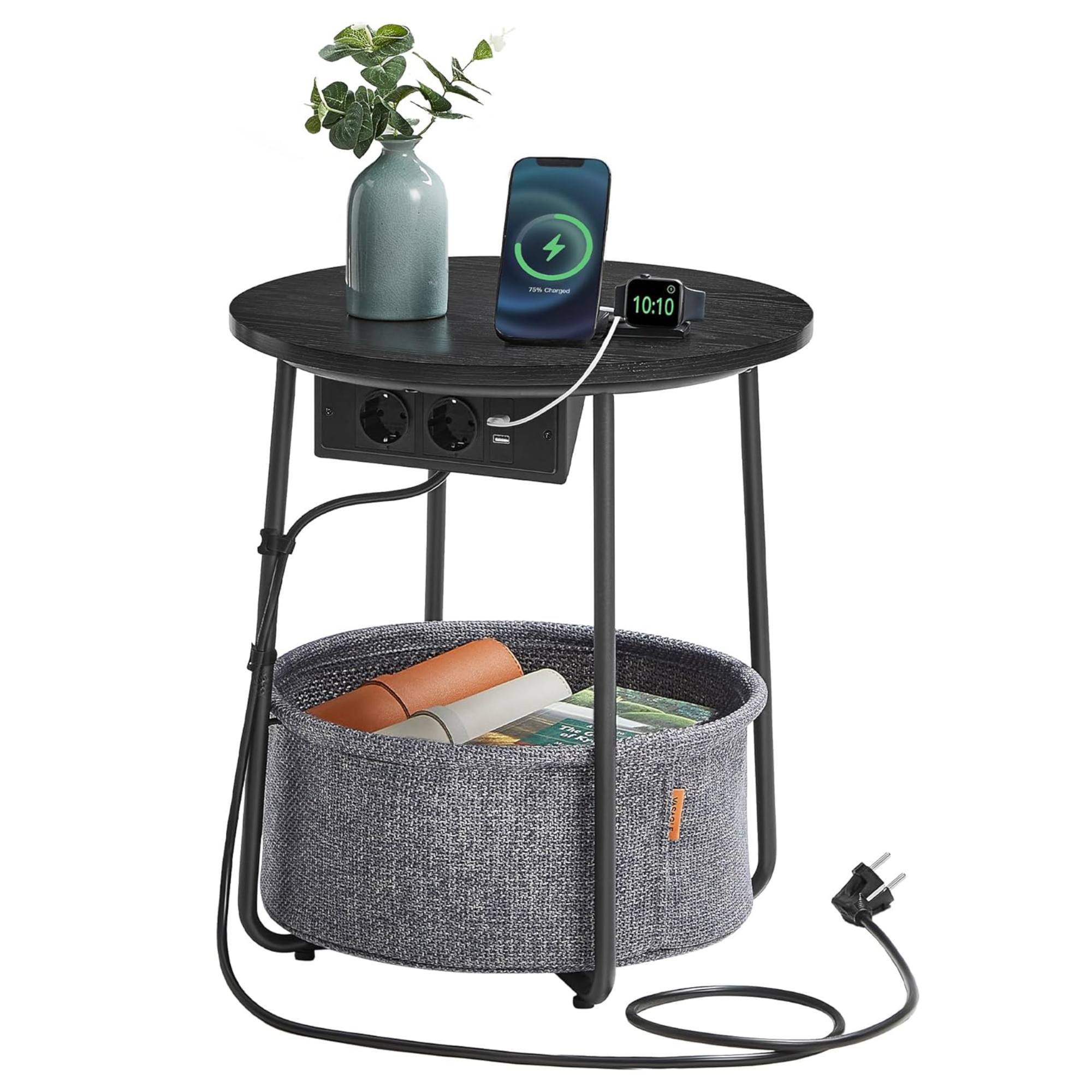 Odkladacia plocha je vyrobená z drevotrieskovej dosky. Maximálnu stabilitu zaisťuje kovová podnož - tá disponuje nastaviteľnými nôžkami, vďaka ktorým stolík ľahko vyrovnáte. Spodný úložný kôš z hrubej polyesterovej tkaniny sa hravo stane zázemím na knihy, časopisy, ale aj pre menších domácich miláčikov. Obsahuje aj zásuvku s USB portami, čo využijete na vaše zariadenie. Napájací kábel s dĺžkou 2 metre.