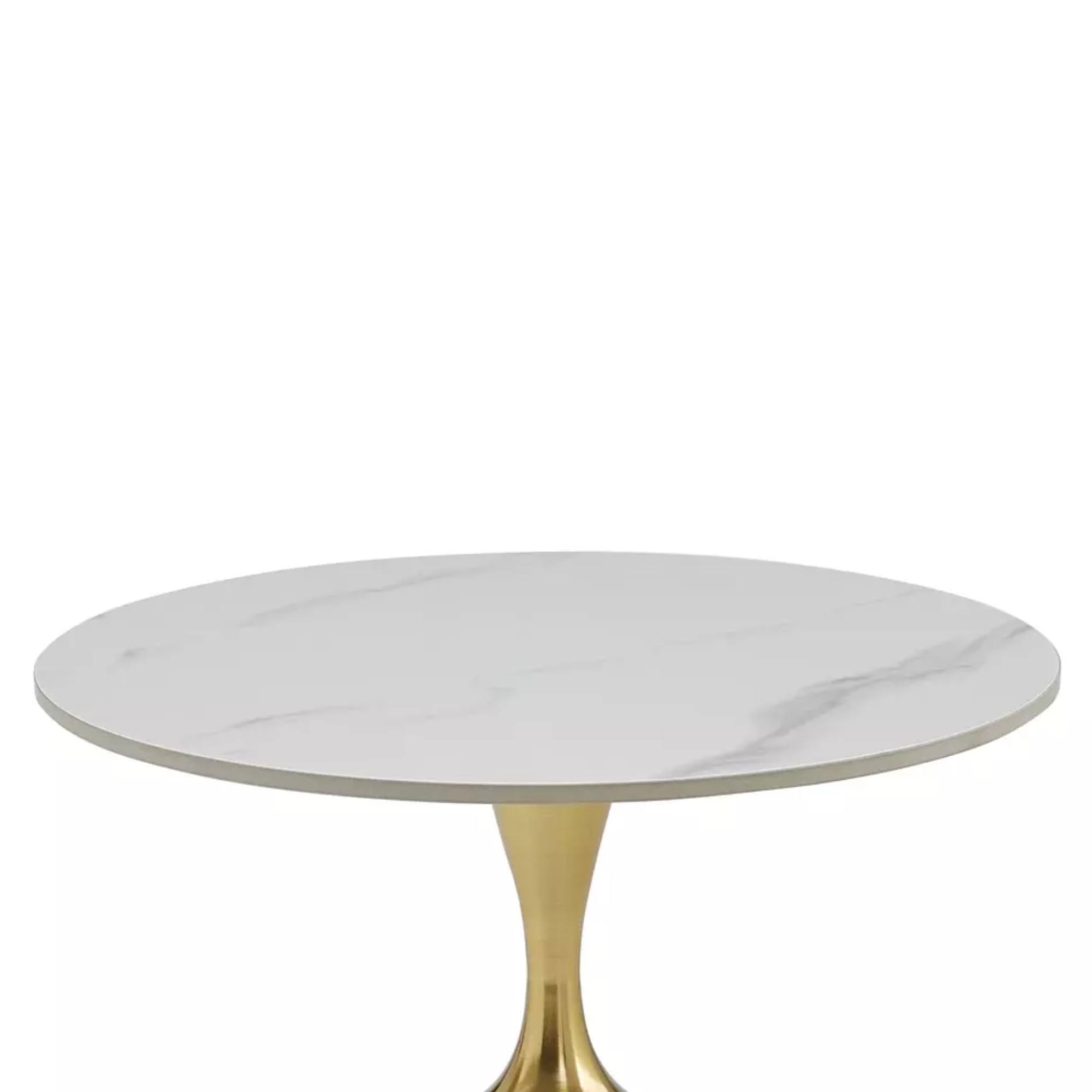 Za svoju stabilitu vďačí tento stolík svojej pevnej stredovej nohe z kovu. Hornú dosku, ktorá je vyrobená z kvalitnej keramiky, zdobí štýlový dekor mramoru.