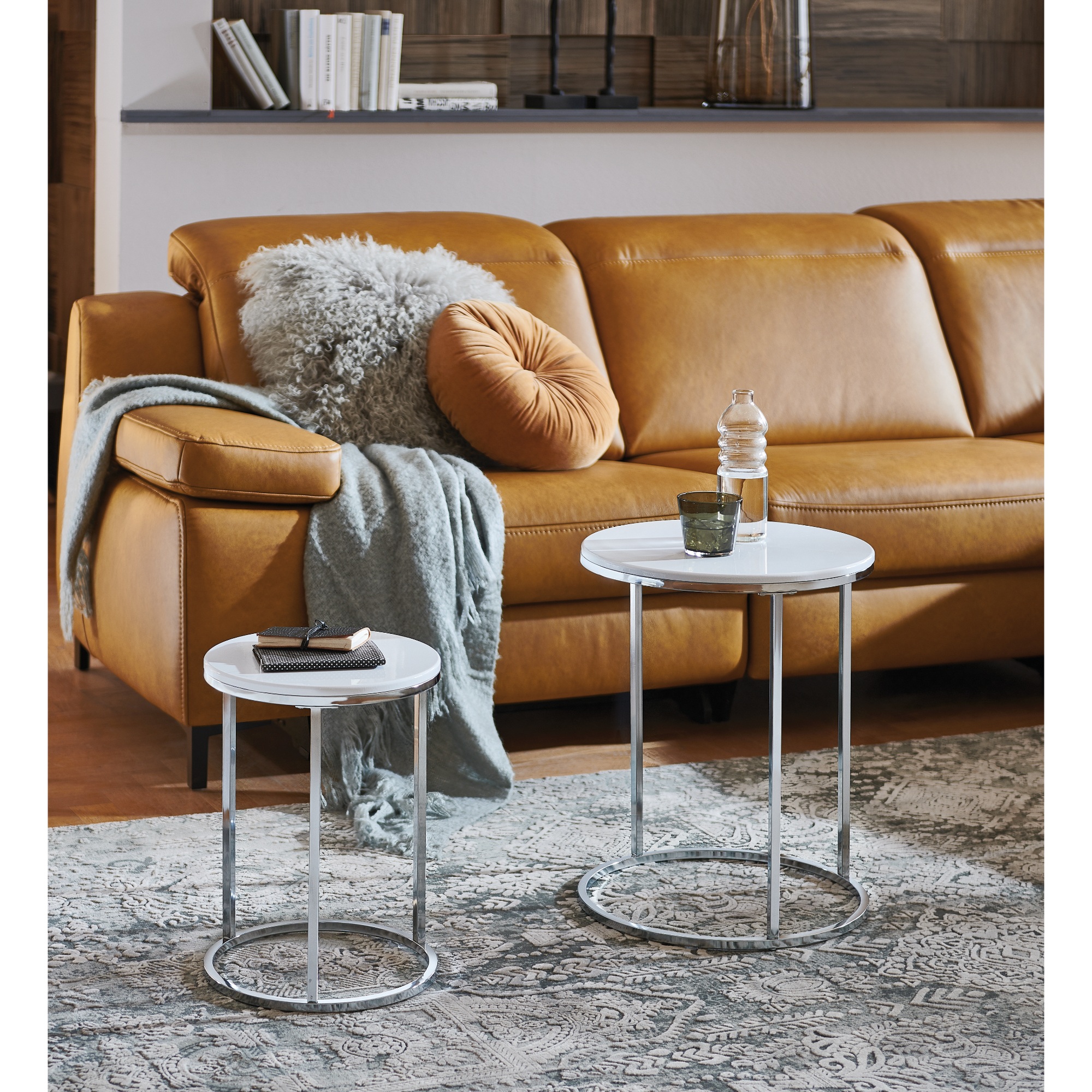 Moderná dvojdielna súprava prístavných stolíkov MERLIN v odlišných veľkostiach sa stane praktickou súčasťou obývacej izby.