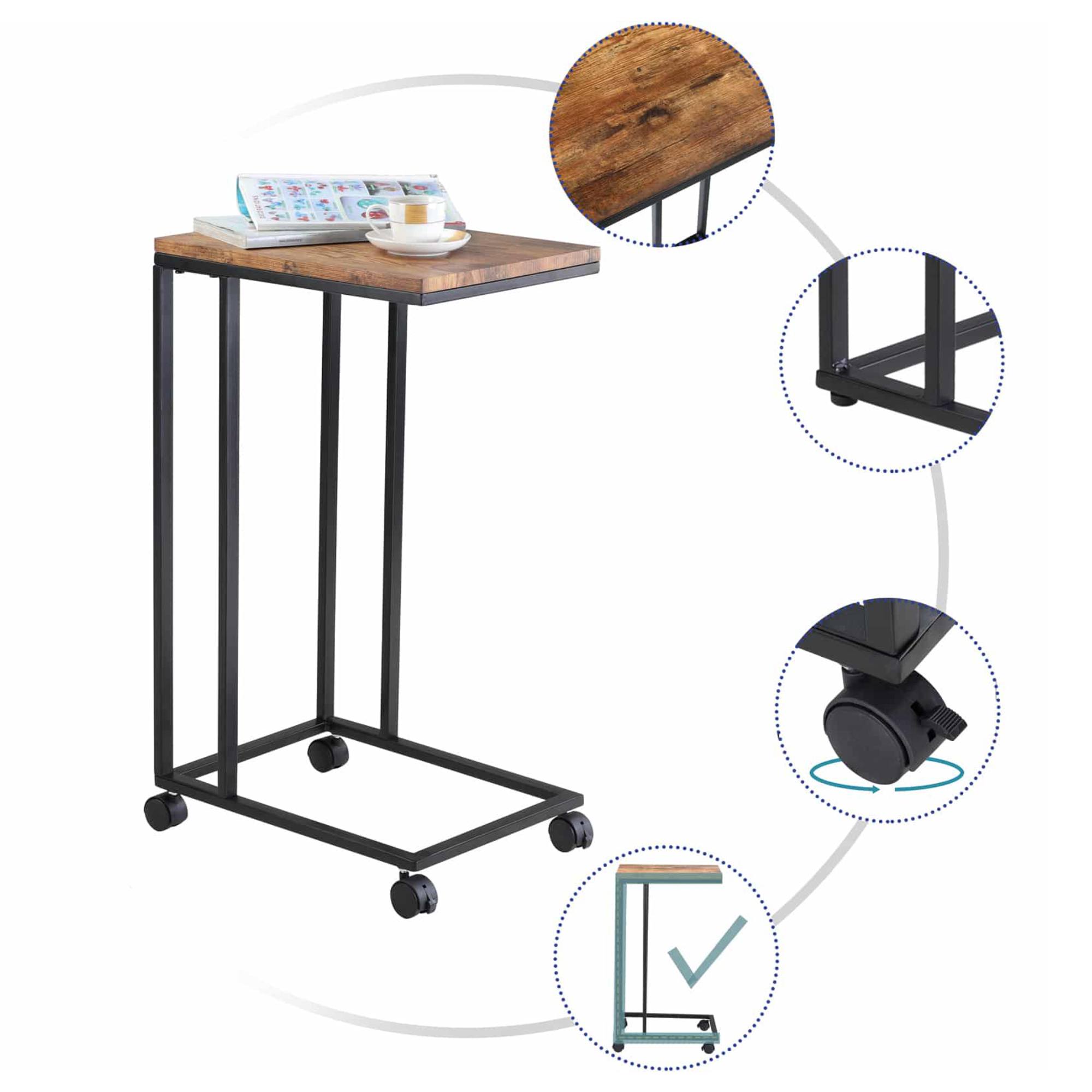 Má stabilnú kovovú konštrukciu v tvare C. Tento tvar umožňuje ho jednoducho prisunúť k sedacej súprave či posteli a využiť ho ako praktický odkladací alebo pracovný stolík. Je vybavený 4 kolieskami, ktoré uľahčujú manipuláciu. 2 kolieska sú navyše vybavené brzdami pre spoľahlivé zaistenie. Kolieska je možné podľa potreby vymeniť za pevné nožičky, ktoré sú súčasťou balenia. Vrchná doska s nosnosťou 40 kg je vyrobená z drevovláknitej MDF dosky s dekorom dreva. Jej povrch zabezpečuje jednoduchú údržbu.
