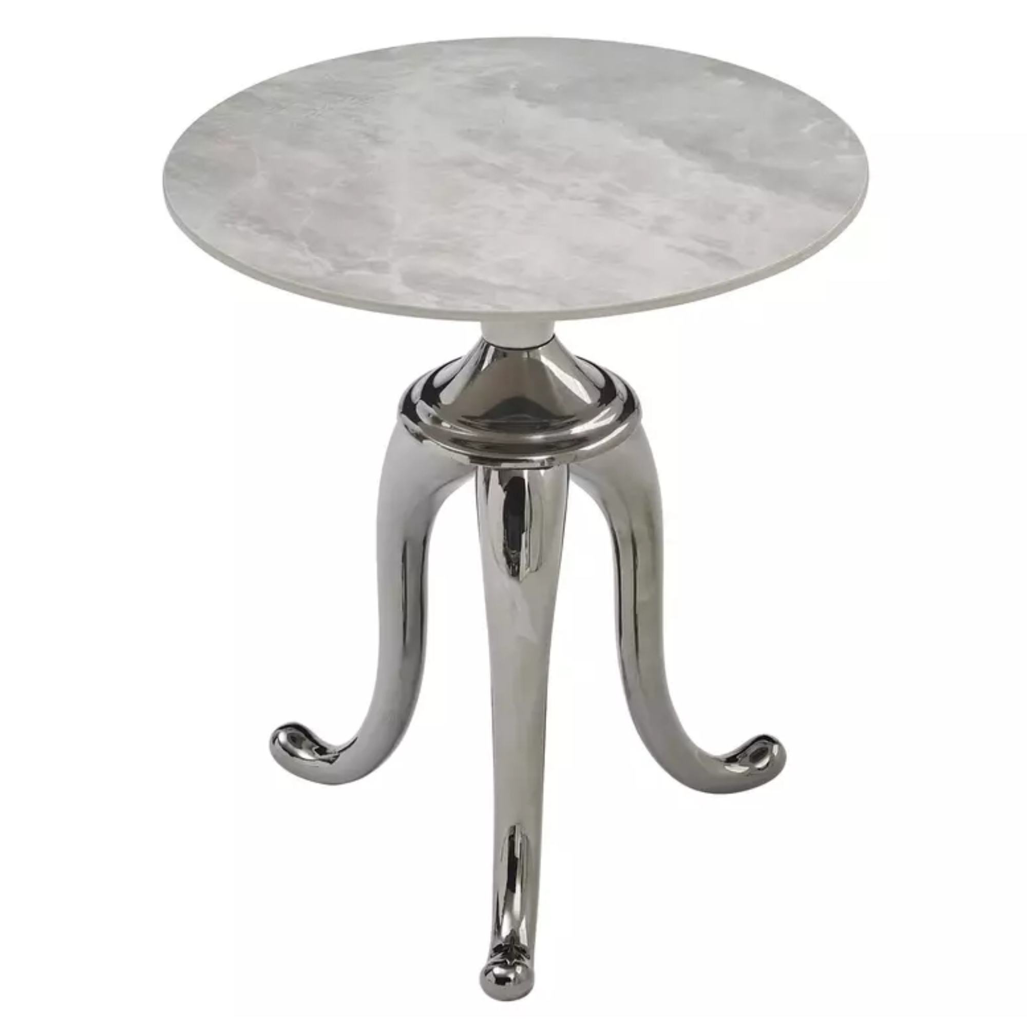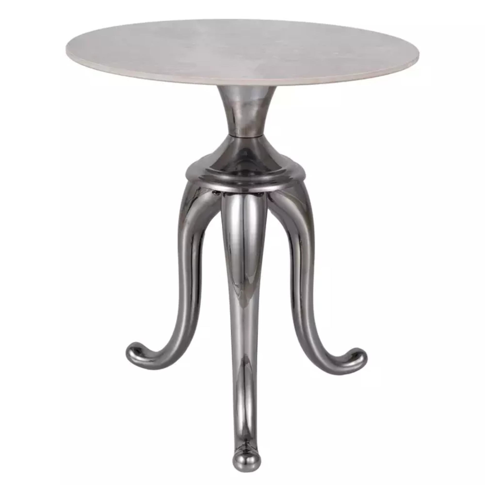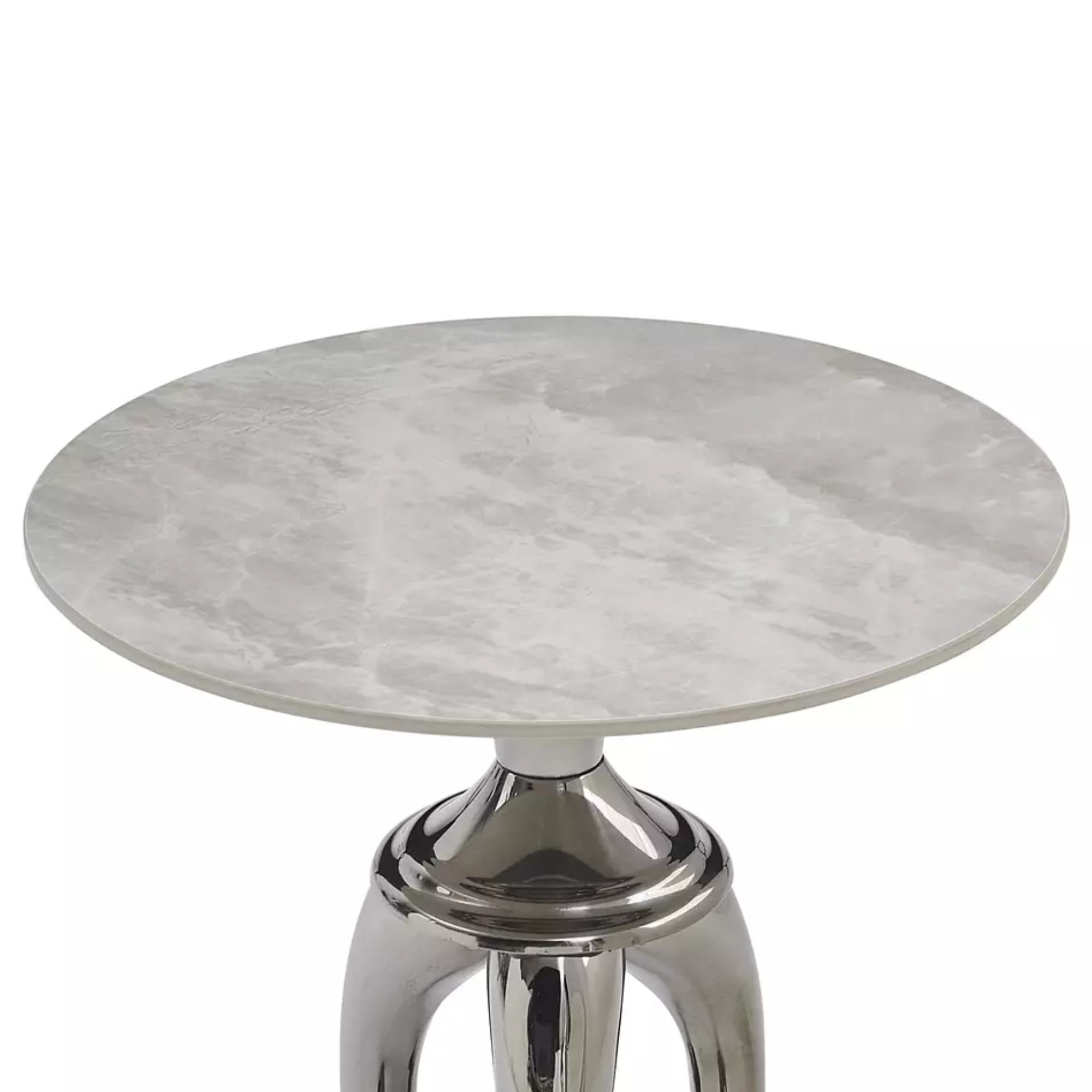 Za svoju stabilitu vďačí tento stolík svojej pevnej kovovej konštrukcii. Dosku stola, ktorá je vyrobená z kvalitnej keramiky, zdobí štýlový dekor mramoru.